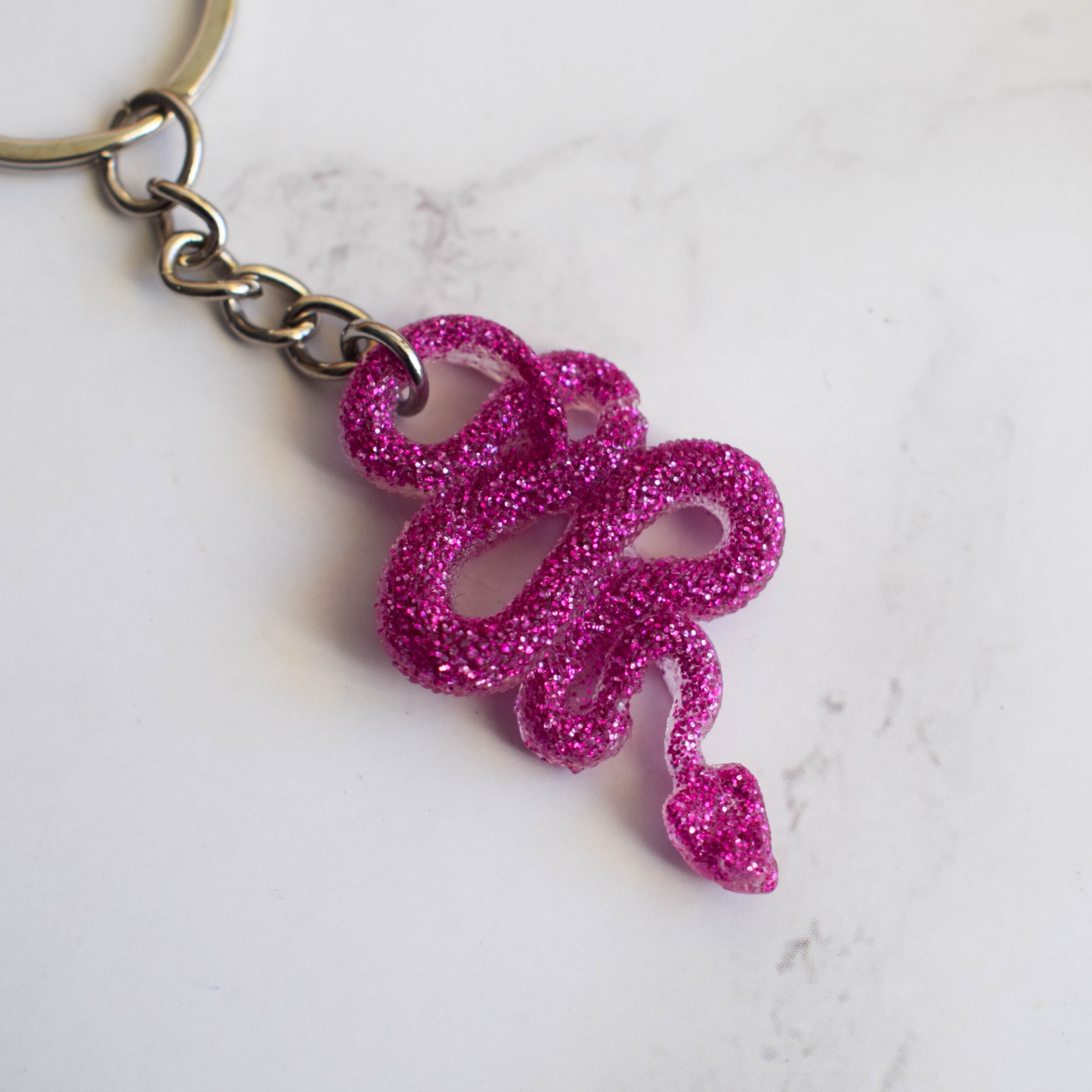 Klíčenka ve tvaru hada s růžovými a fialovými třpytkami.