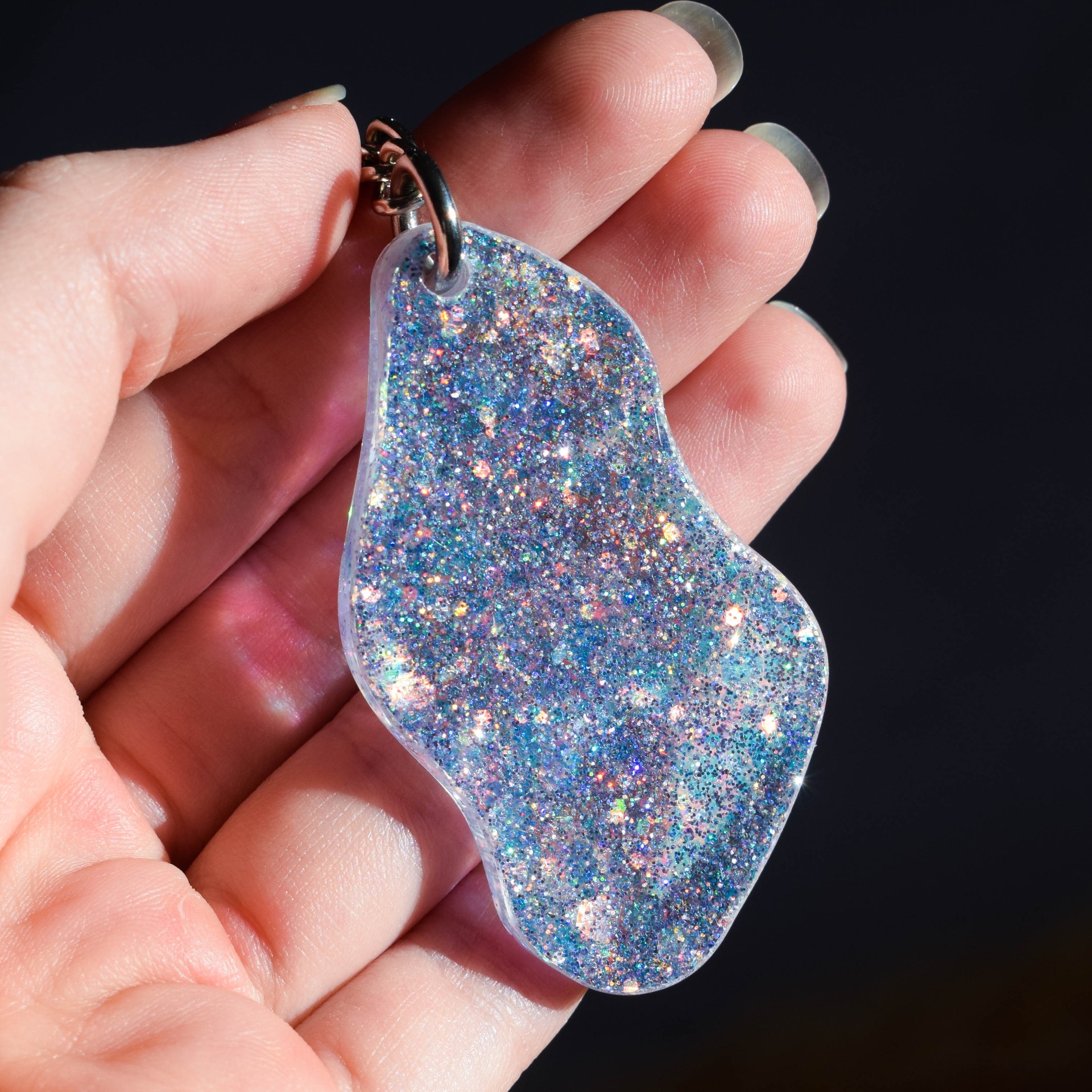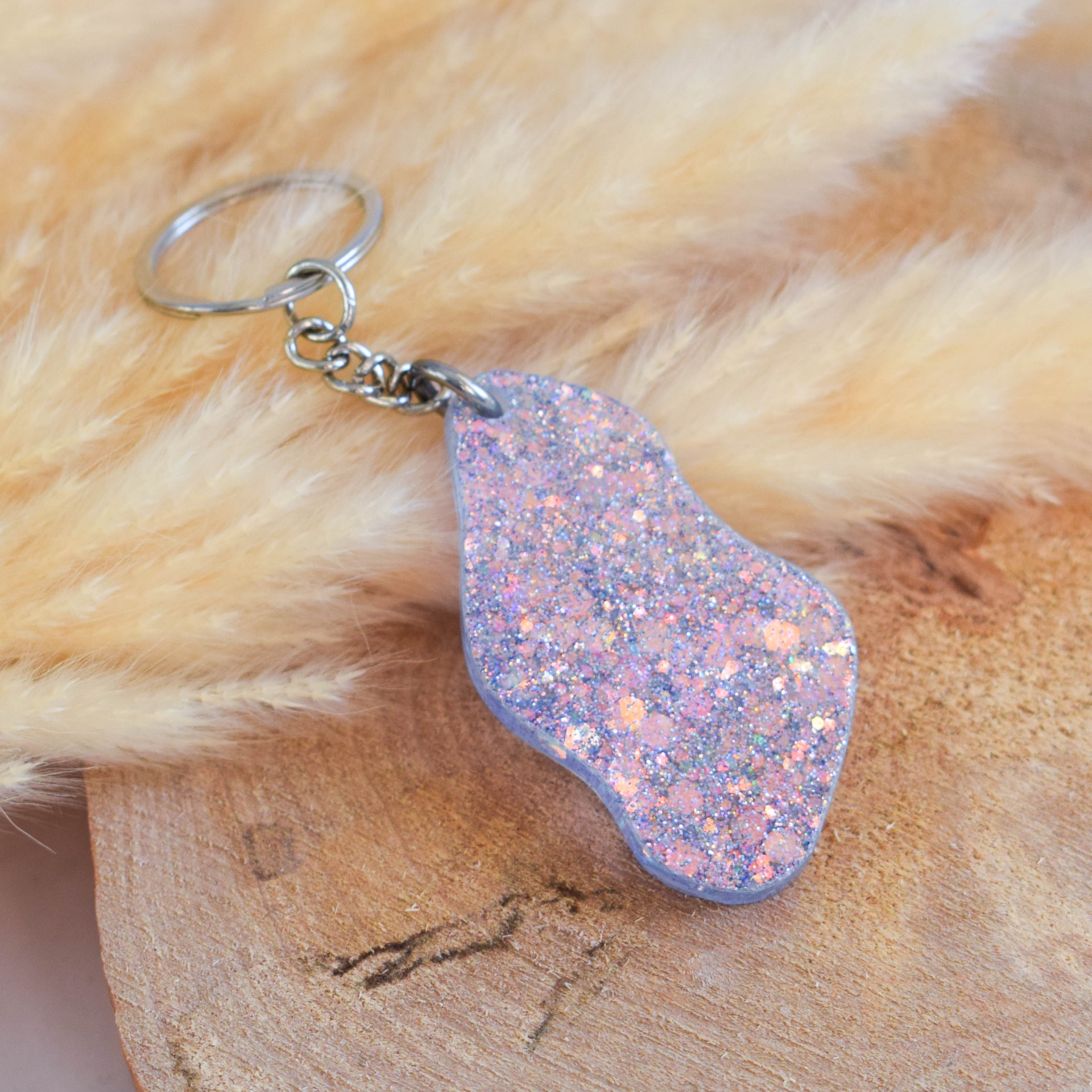 Ručně vyrobená klíčenka z pryskyřice v designu s holografickými glitry v růžovo-fialkové barvě.