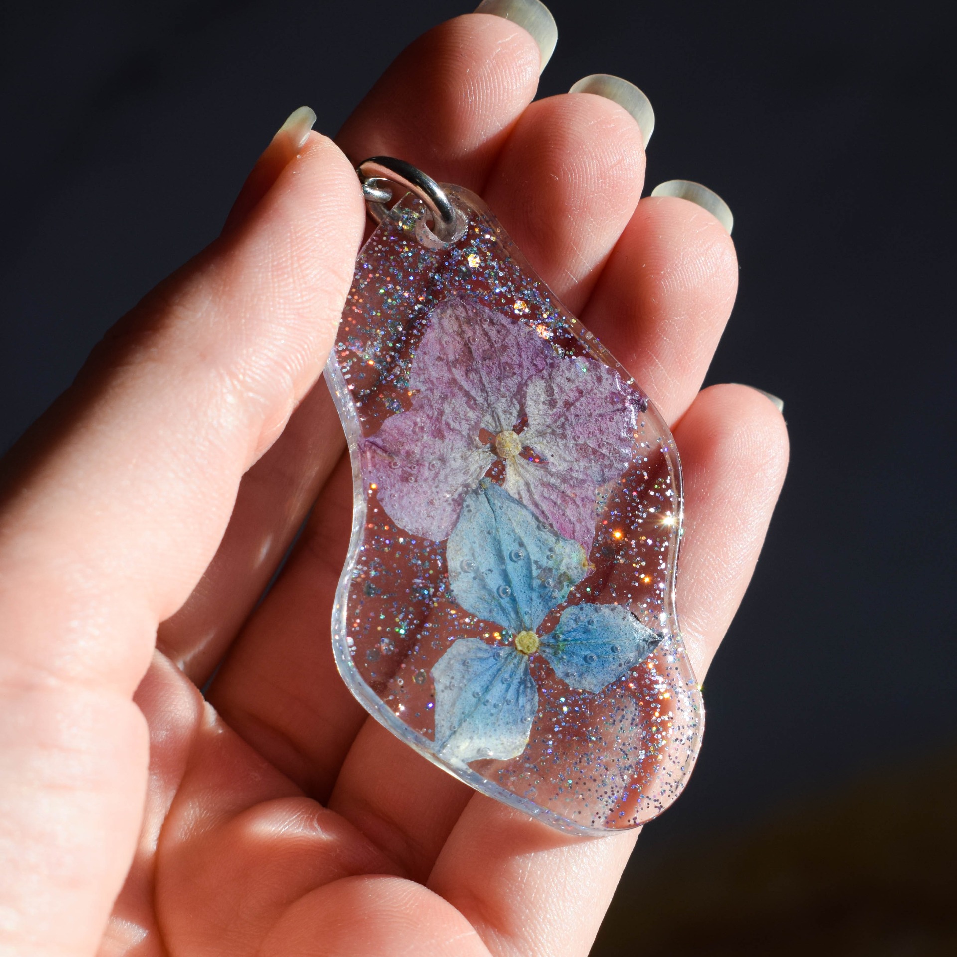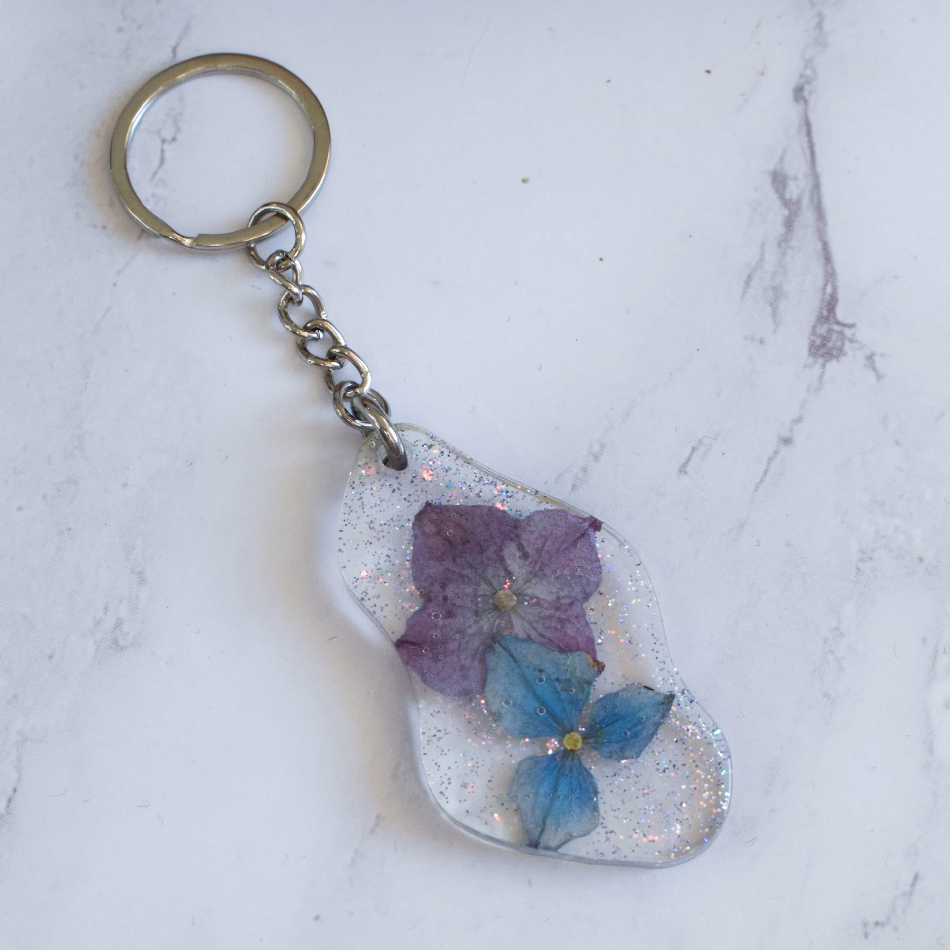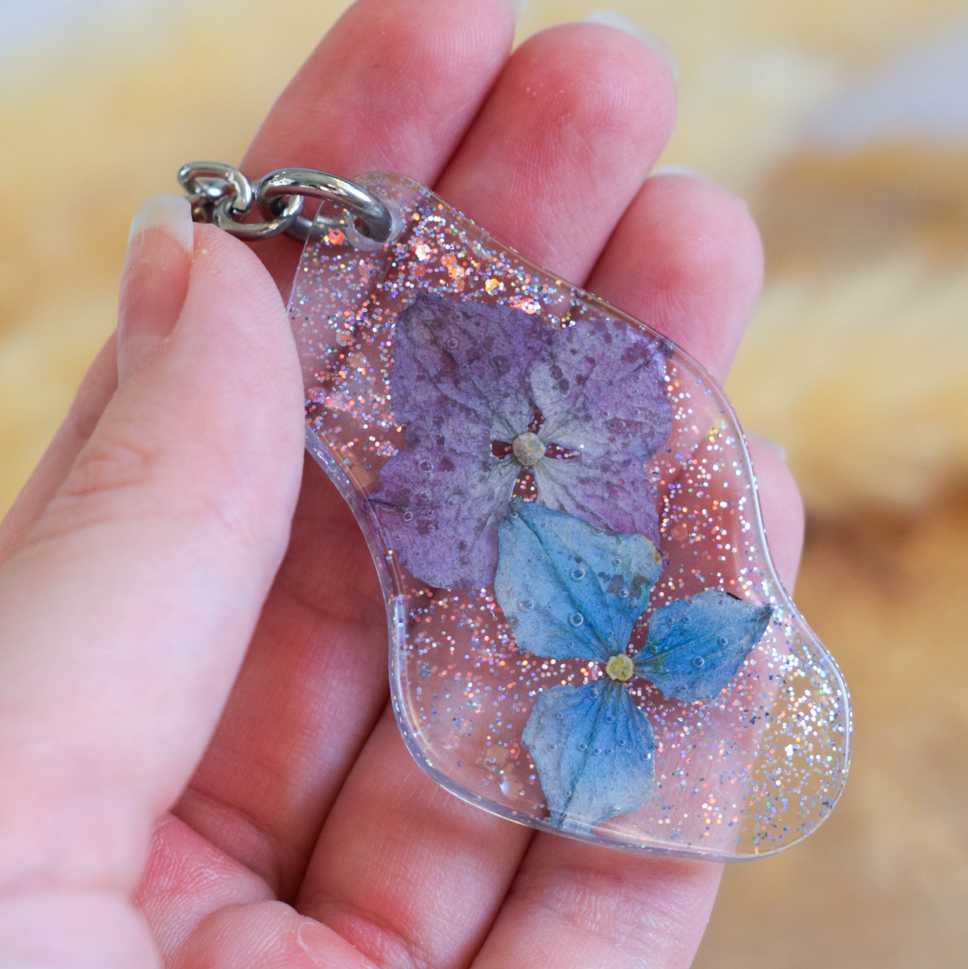 Ručně vyrobená klíčenka z pryskyřice se sušenými květy hortenzií a holografickými glitry.