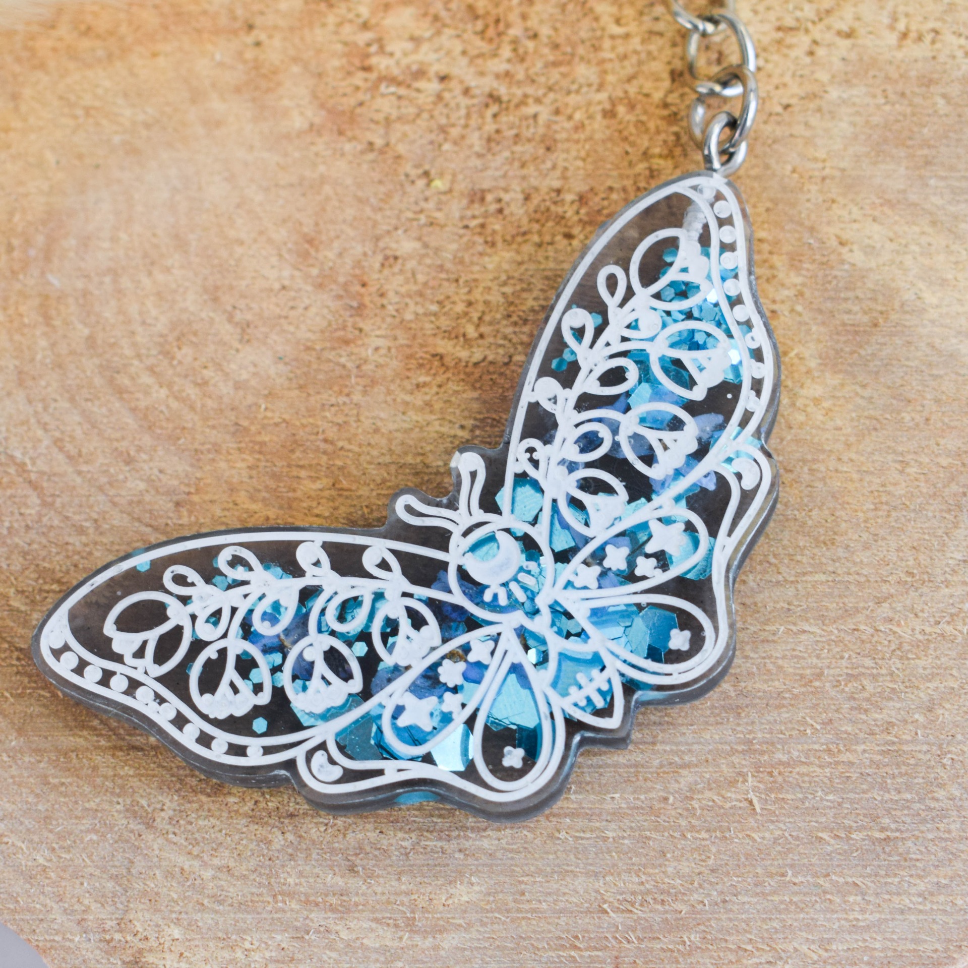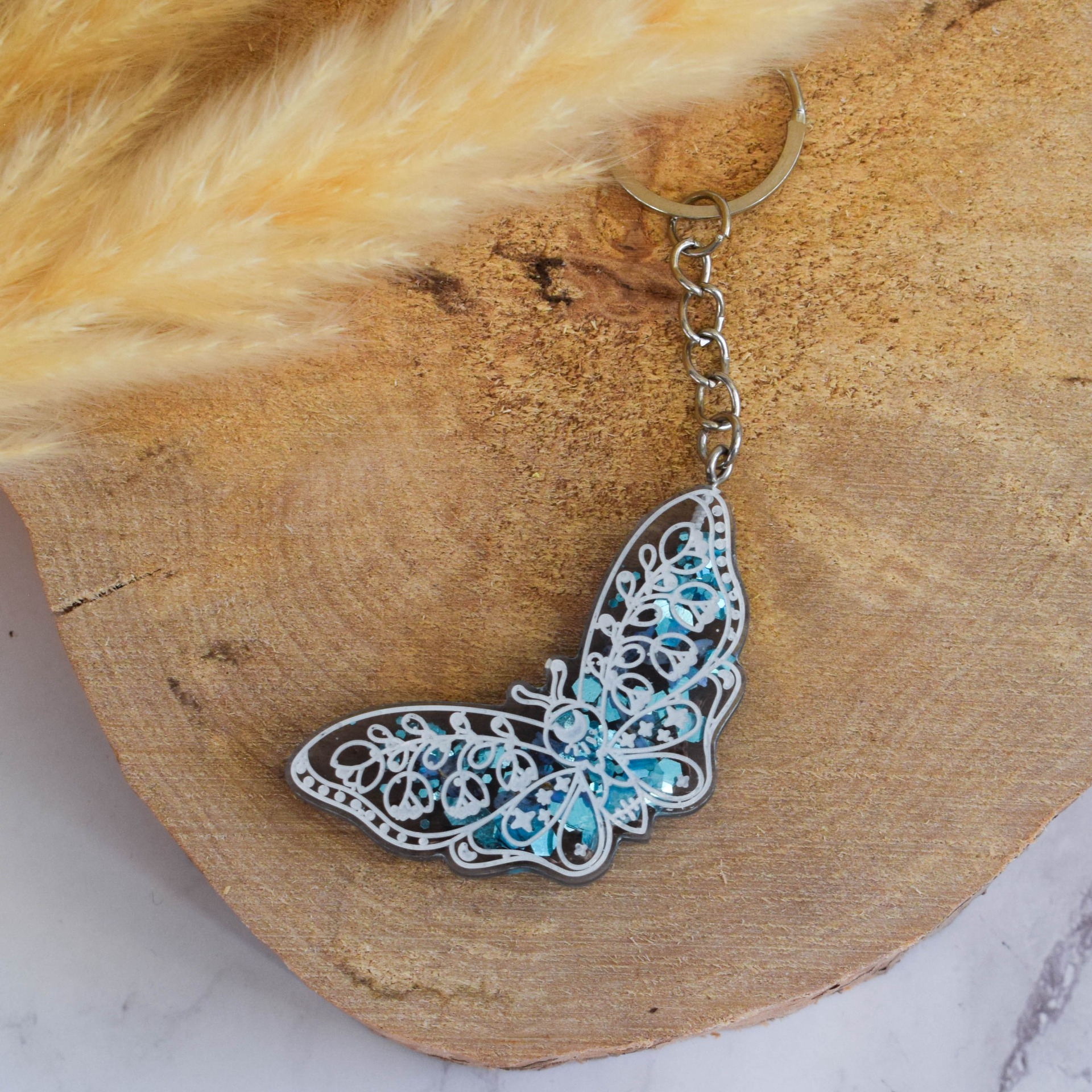 Ručně vyrobená klíčenka v černém designu se sušenými pomněnkami a modrými glitry. Klíčenka je obarvena bílou barvou.