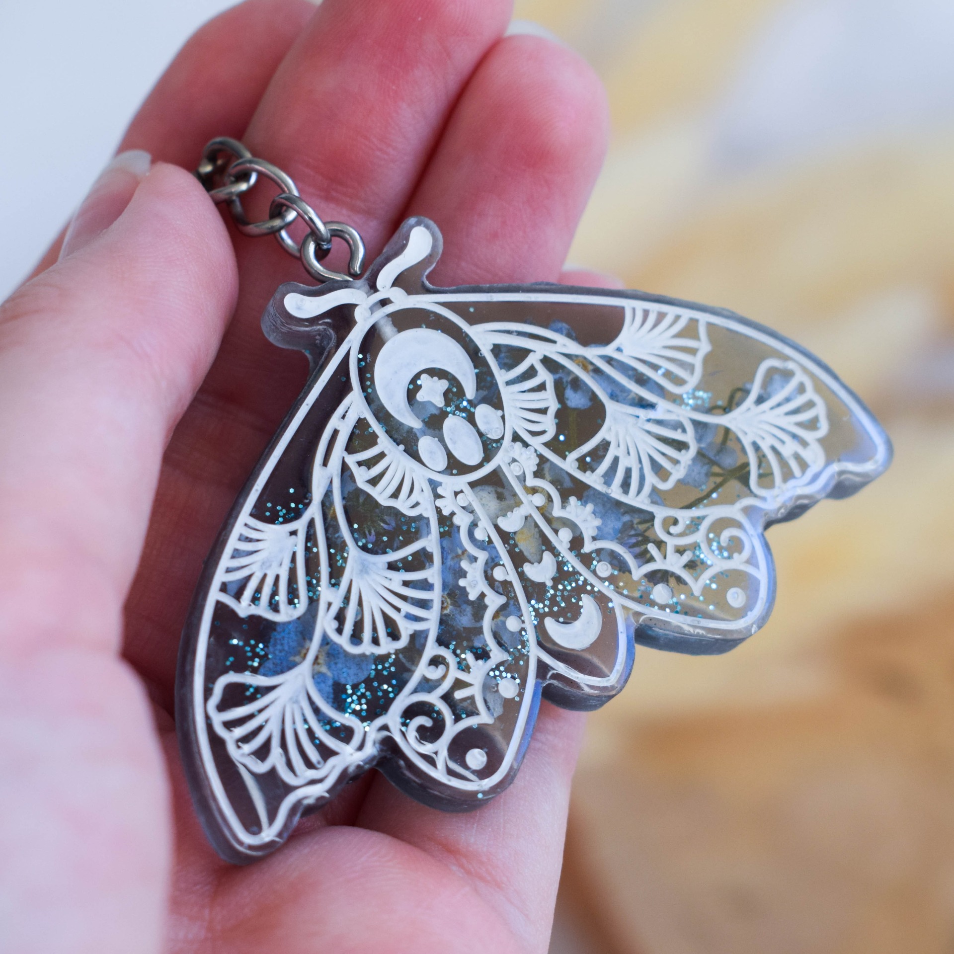 Ručně vyrobená klíčenka z pryskyřice v černém designu se sušenými pomněnkami a modrými třpytkami. Klíčenka je obarvena bílou barvou.