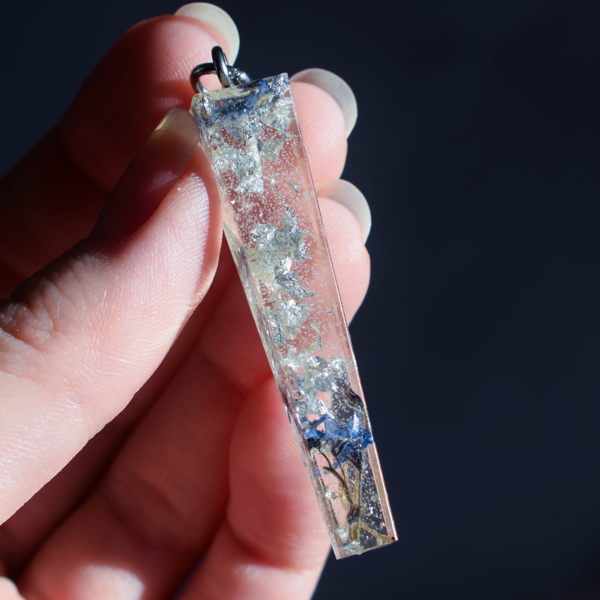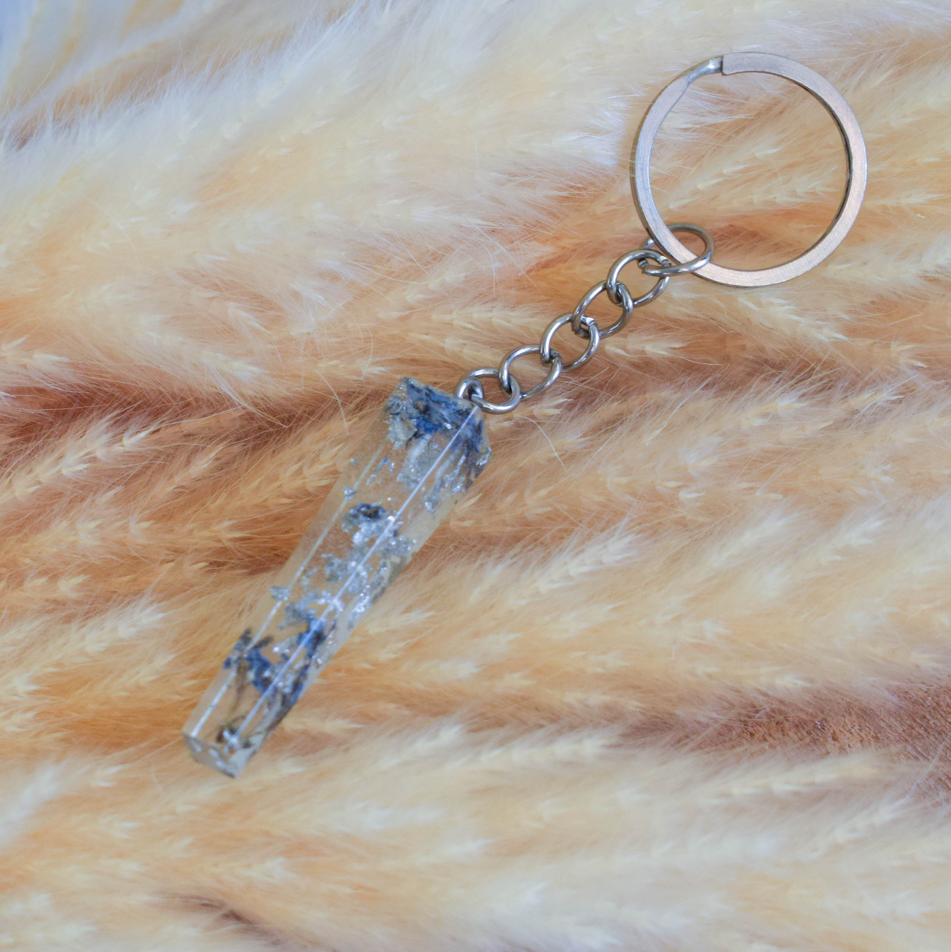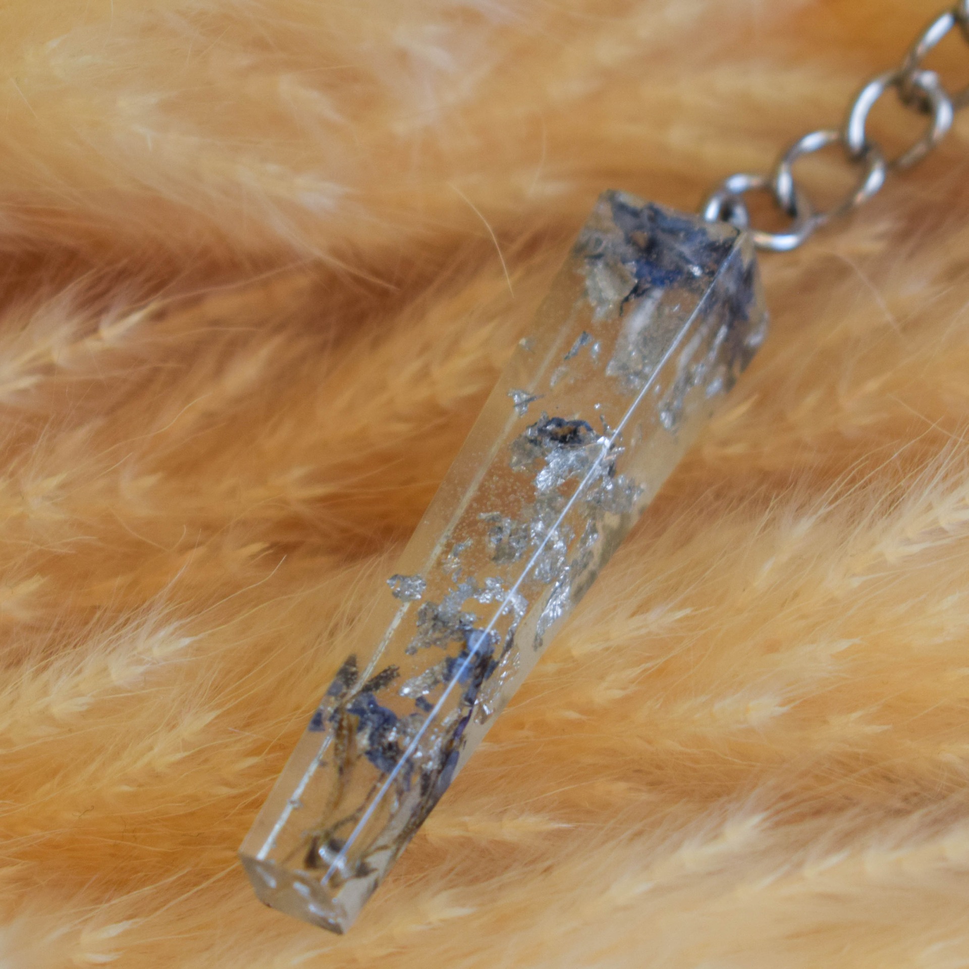 Ručně vyrobená klíčenka z pryskyřice se sušenými květy pomněnek a stříbrnými plátky