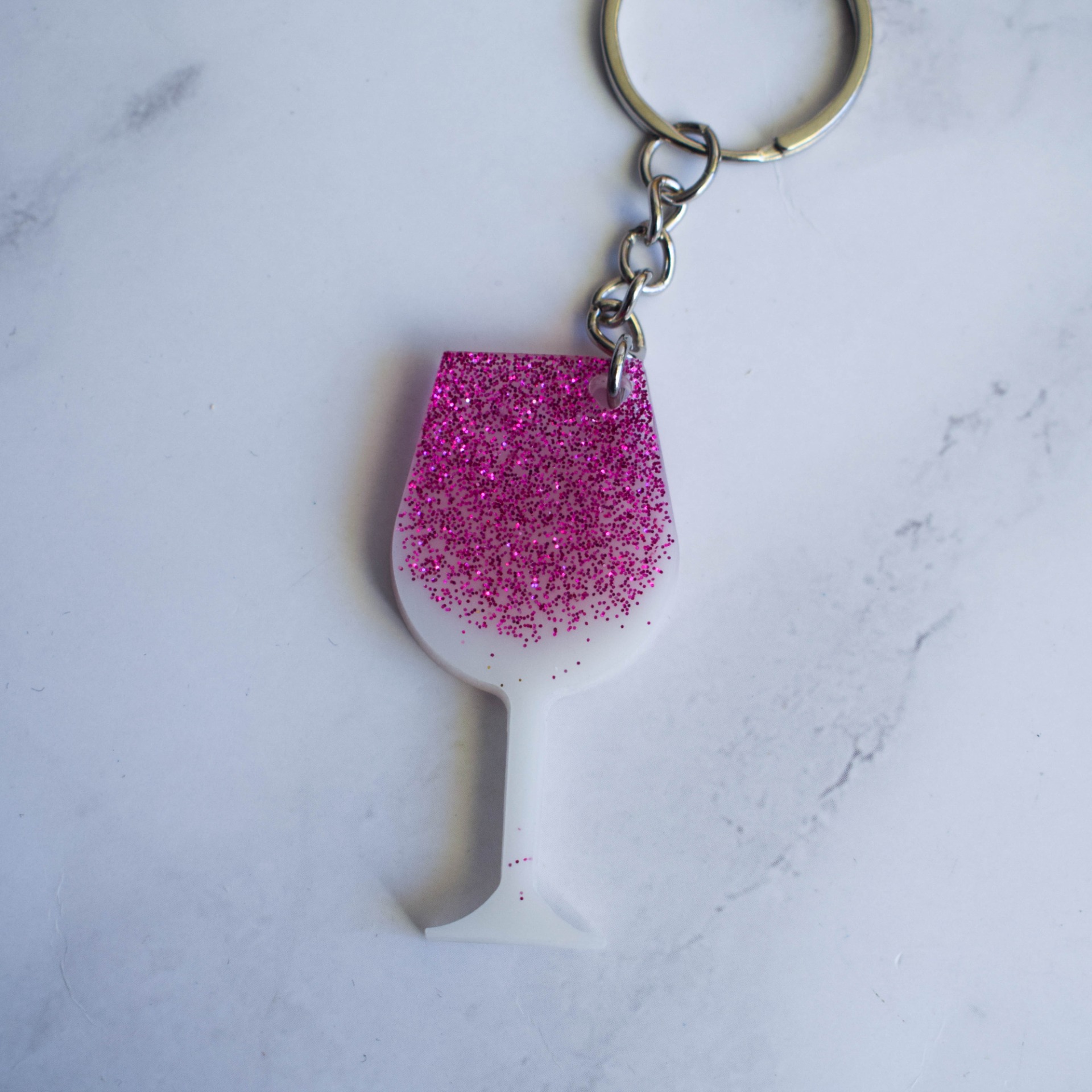 Stylová klíčenka ve tvaru skleničky, ručně vyrobená z epoxidové pryskyřice v designu růžový třpytek a bílou barvou.