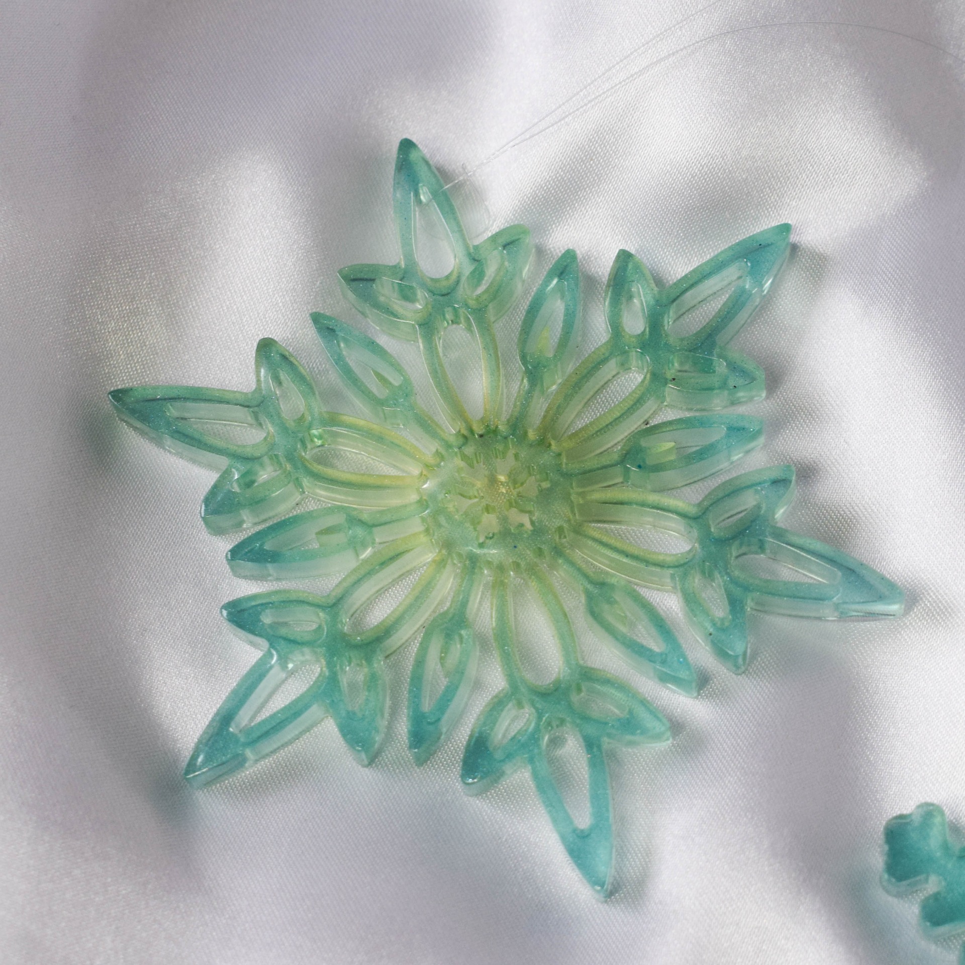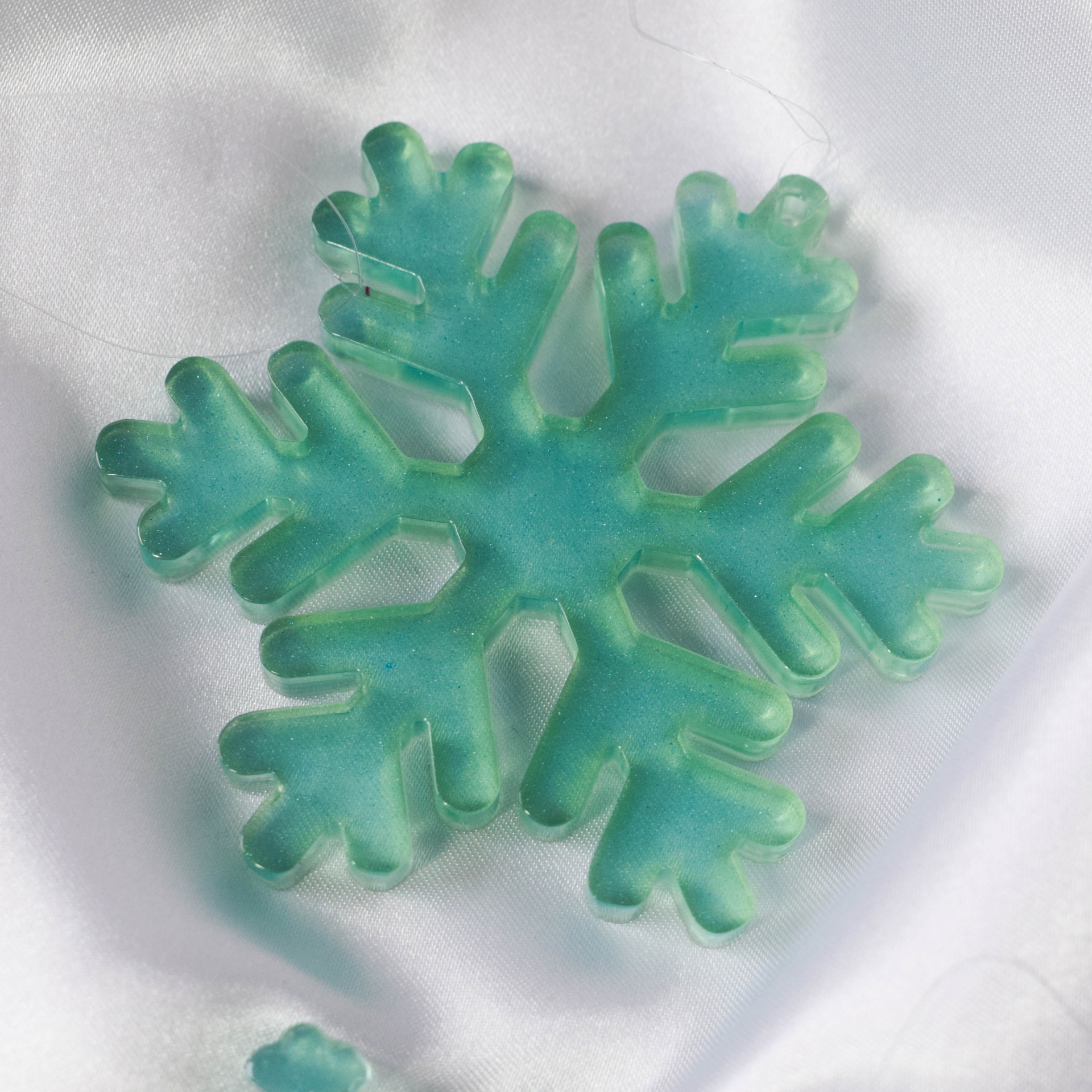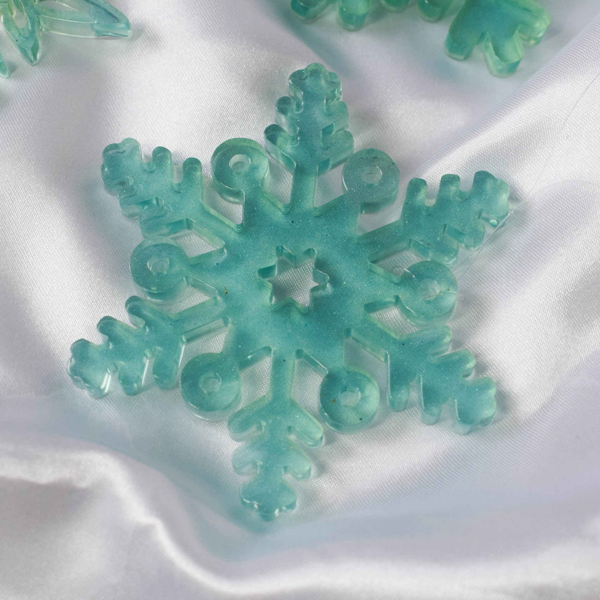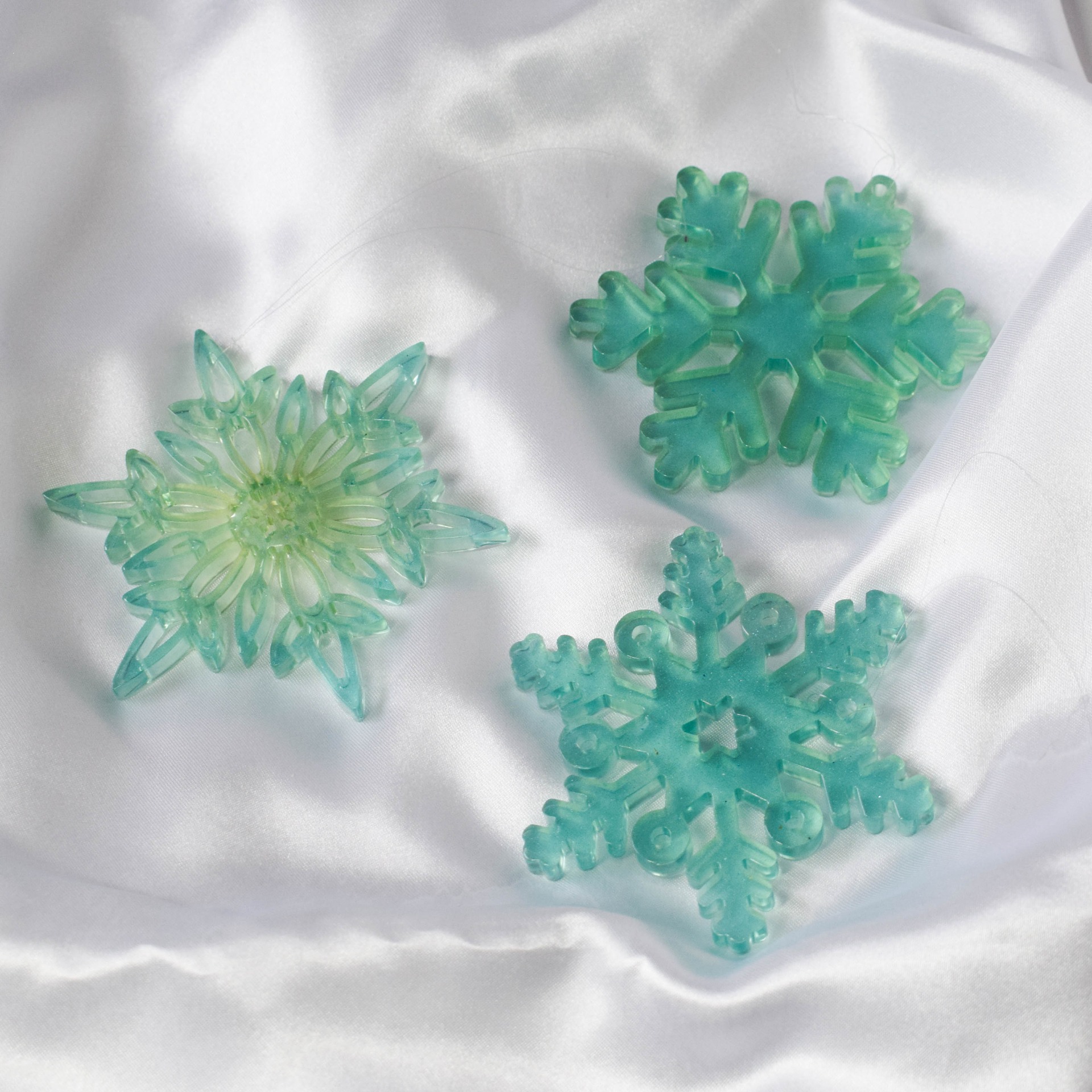 Set velkých vloček k pověšení na stromeček z pryskyřice. Vločky jsou v modrém provedení.