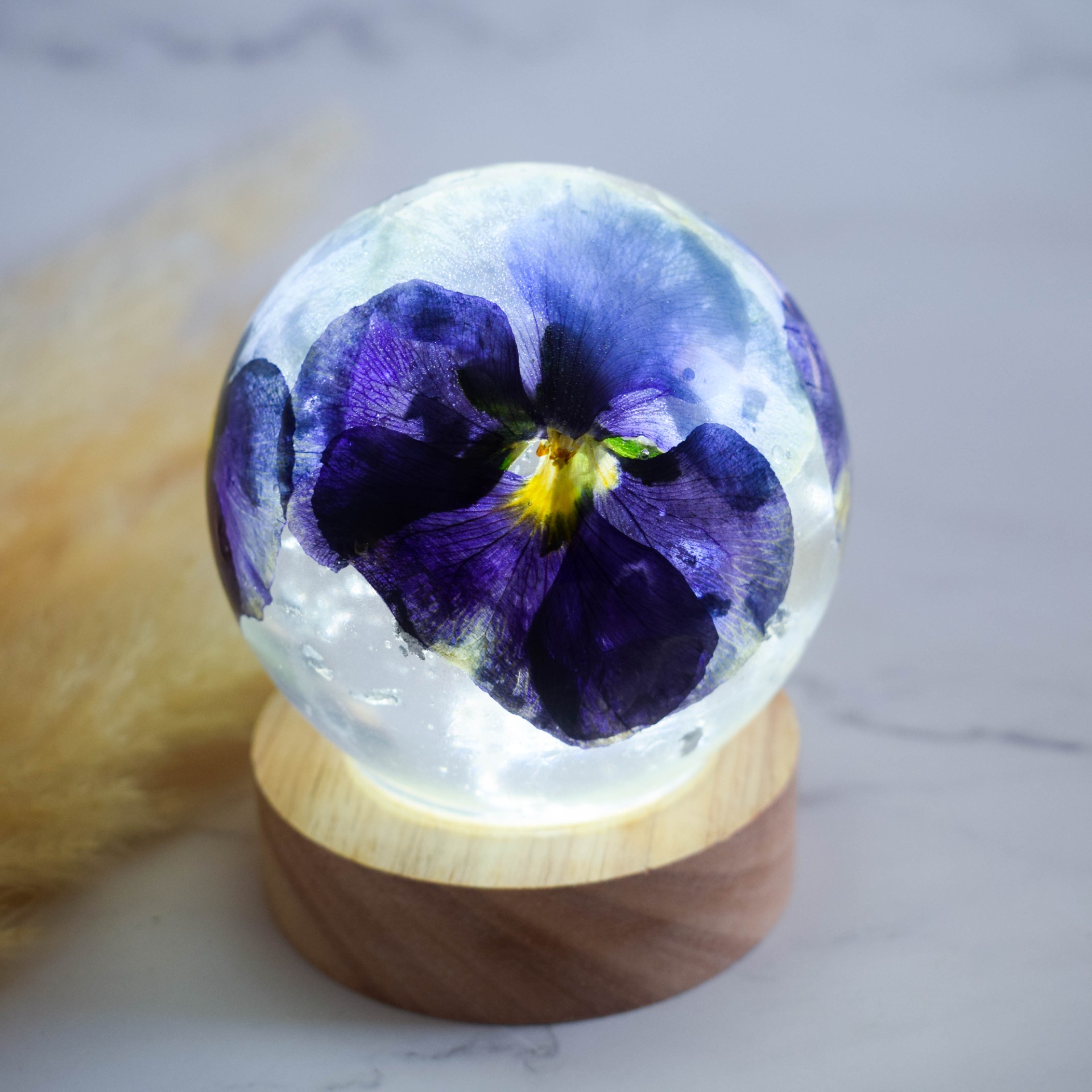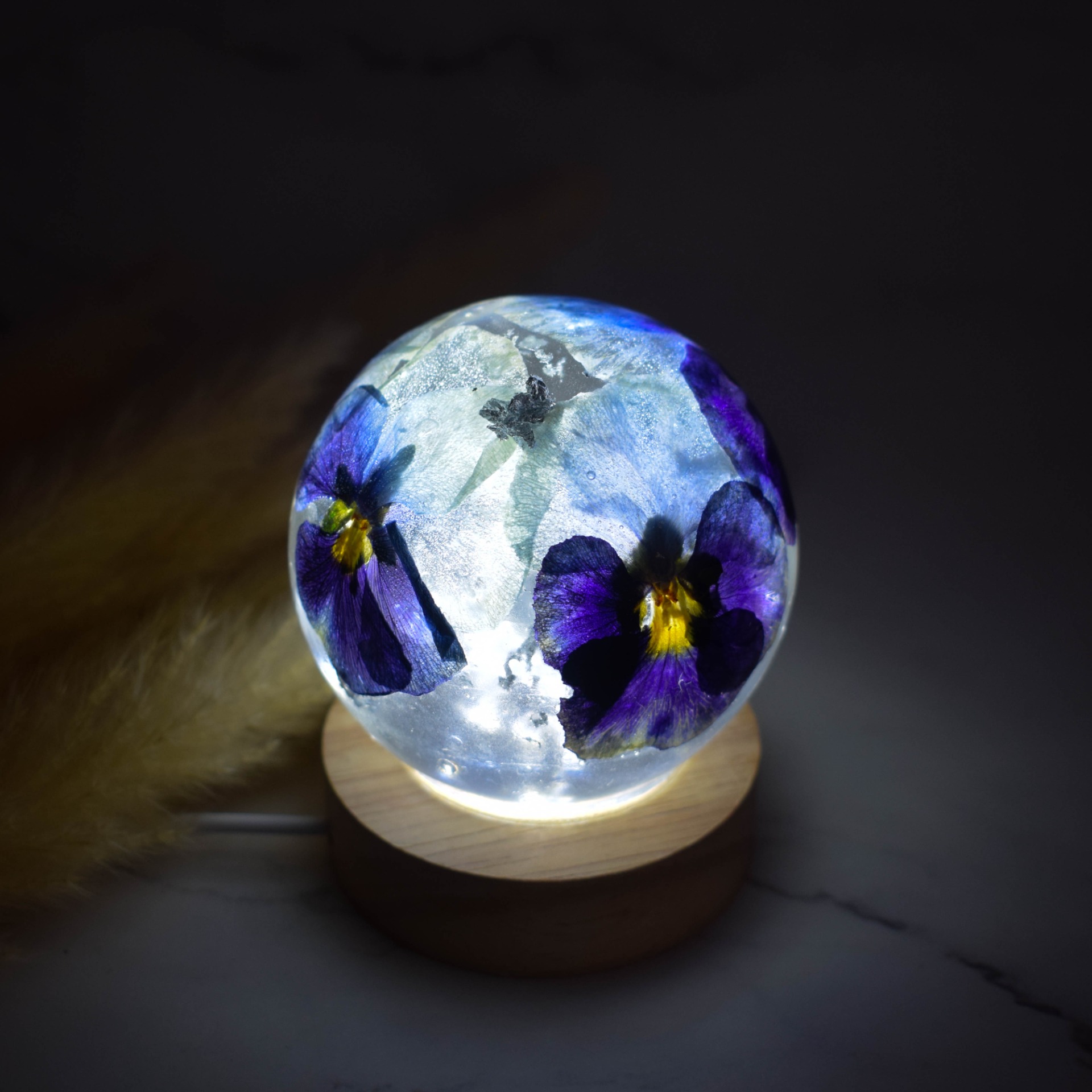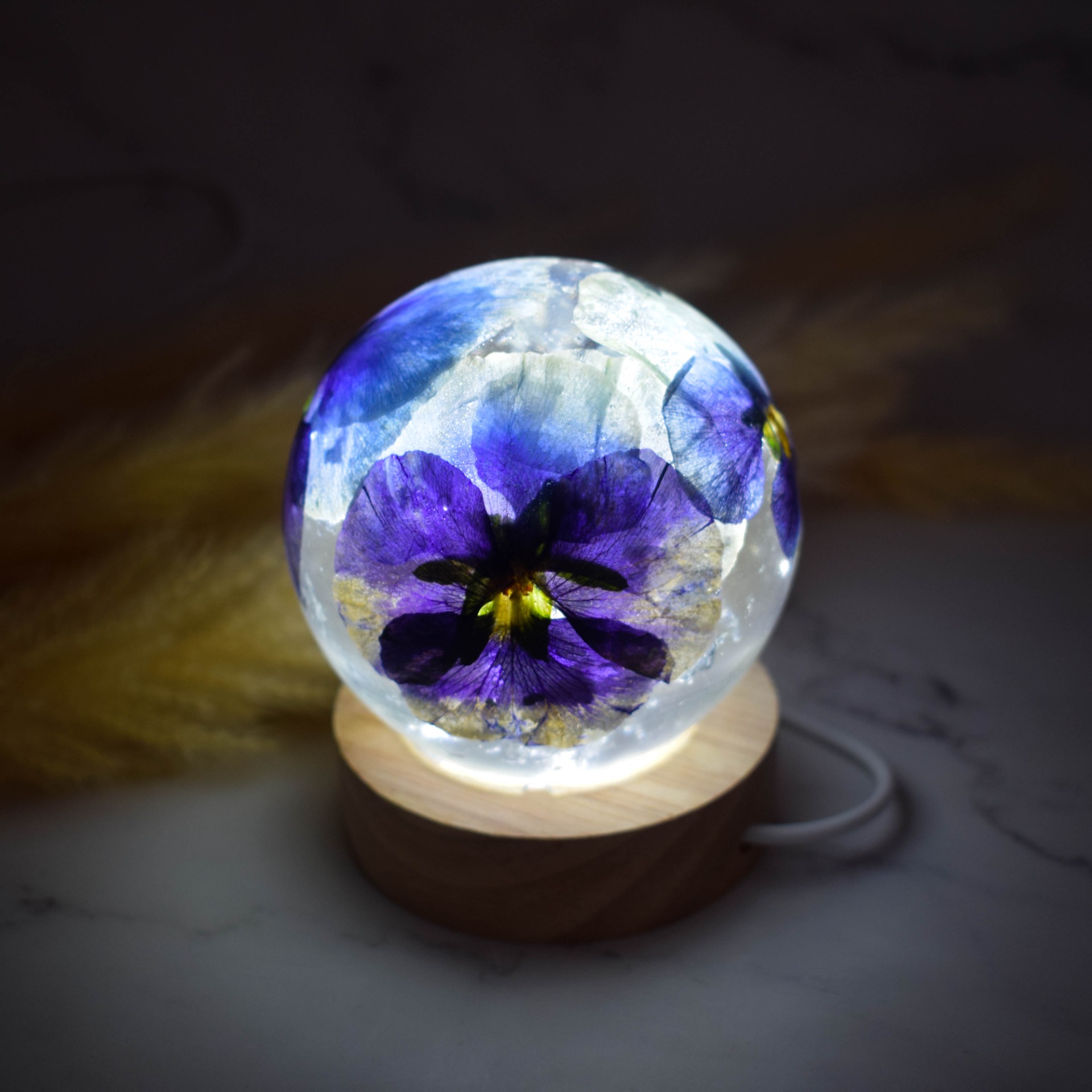 Lampička je vyrobena z čiré pryskyřice ve tvaru koule, ve které jsou zality sušené fialové macešky. Květům zůstala přirozená struktura i barevnost, takže při rozsvícení jemné světlo zvýrazní jejich detaily a vytvoří příjemný vizuální efekt.