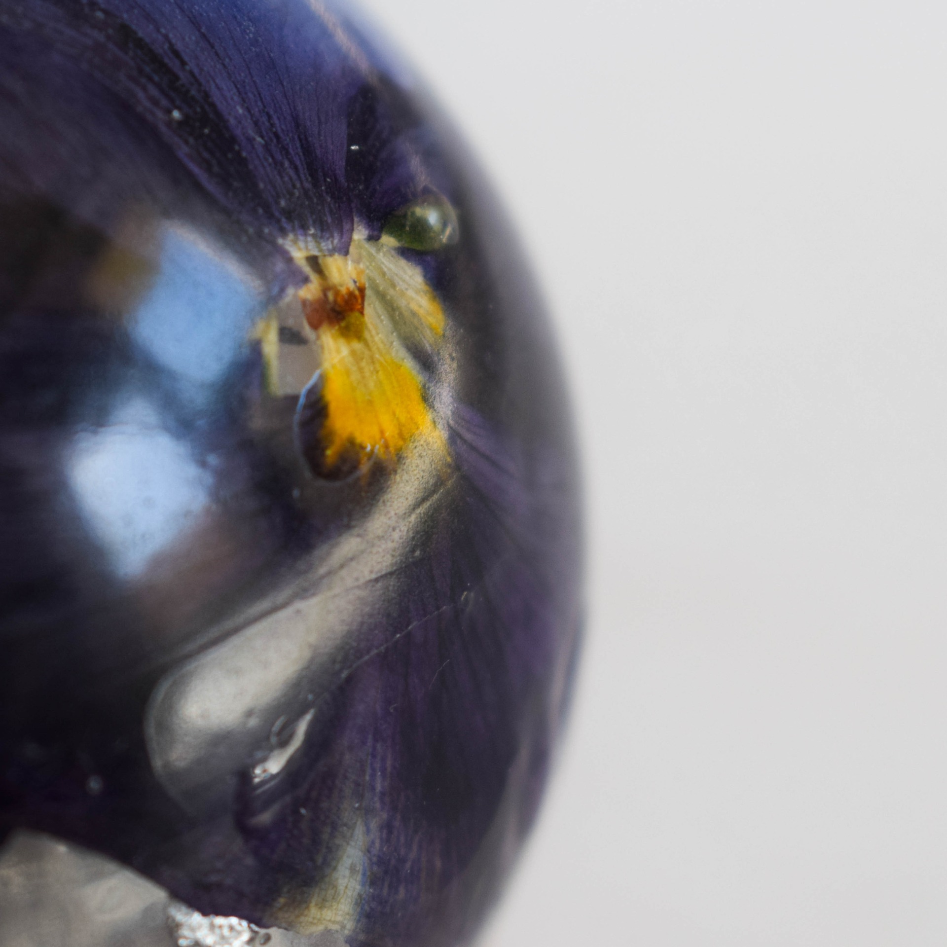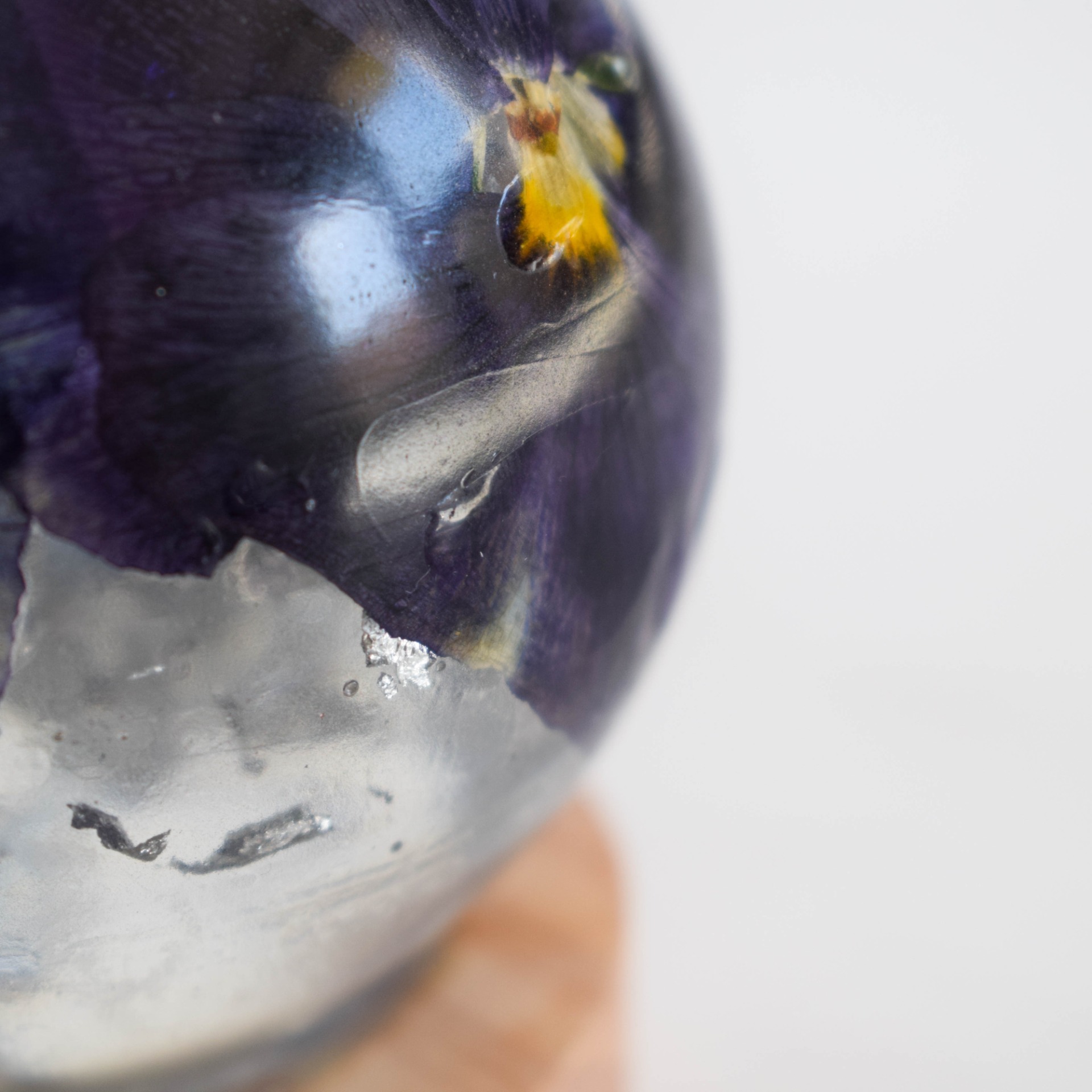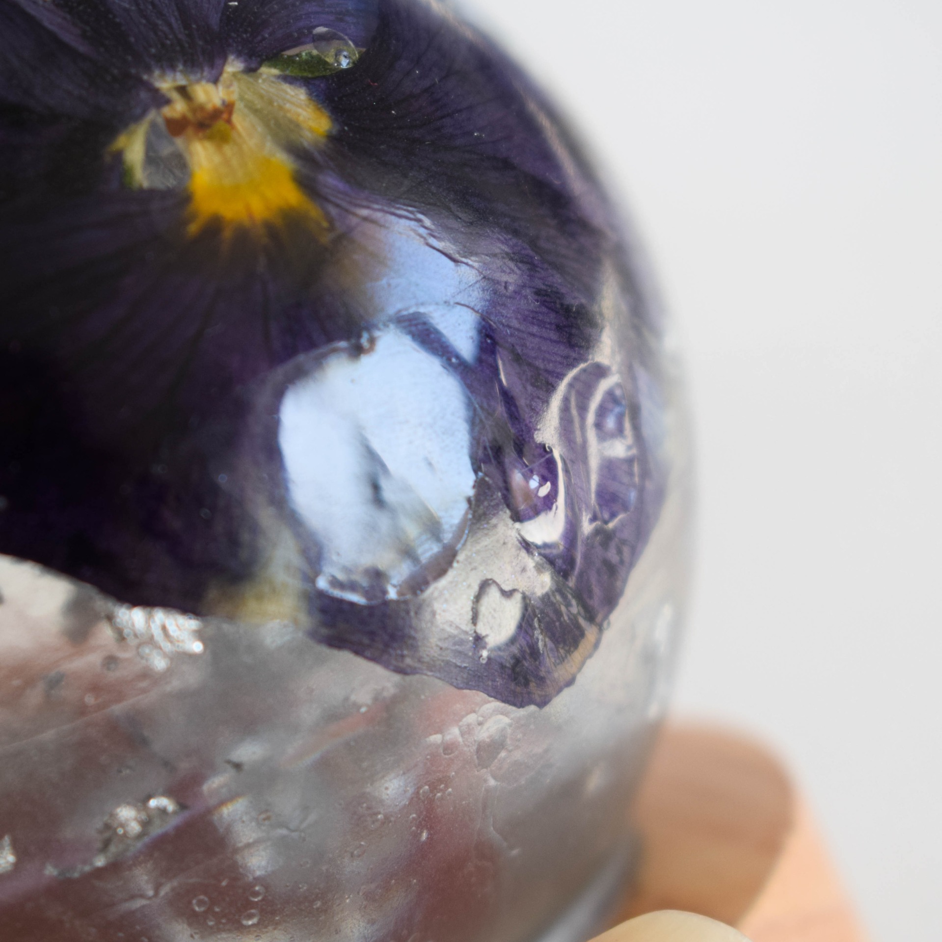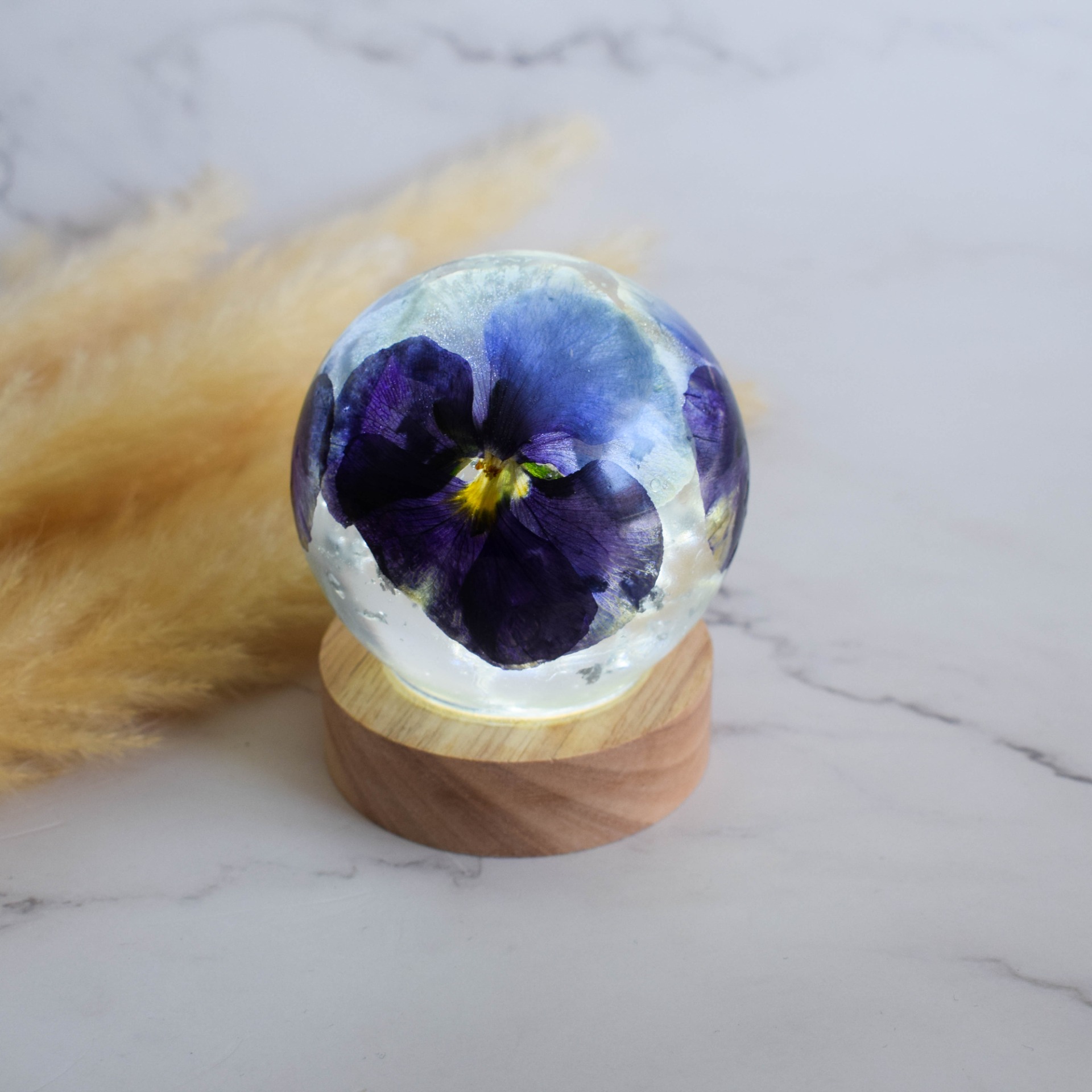 Lampička je vyrobena z čiré pryskyřice ve tvaru koule, ve které jsou zality sušené fialové macešky. Květům zůstala přirozená struktura i barevnost, takže při rozsvícení jemné světlo zvýrazní jejich detaily a vytvoří příjemný vizuální efekt.