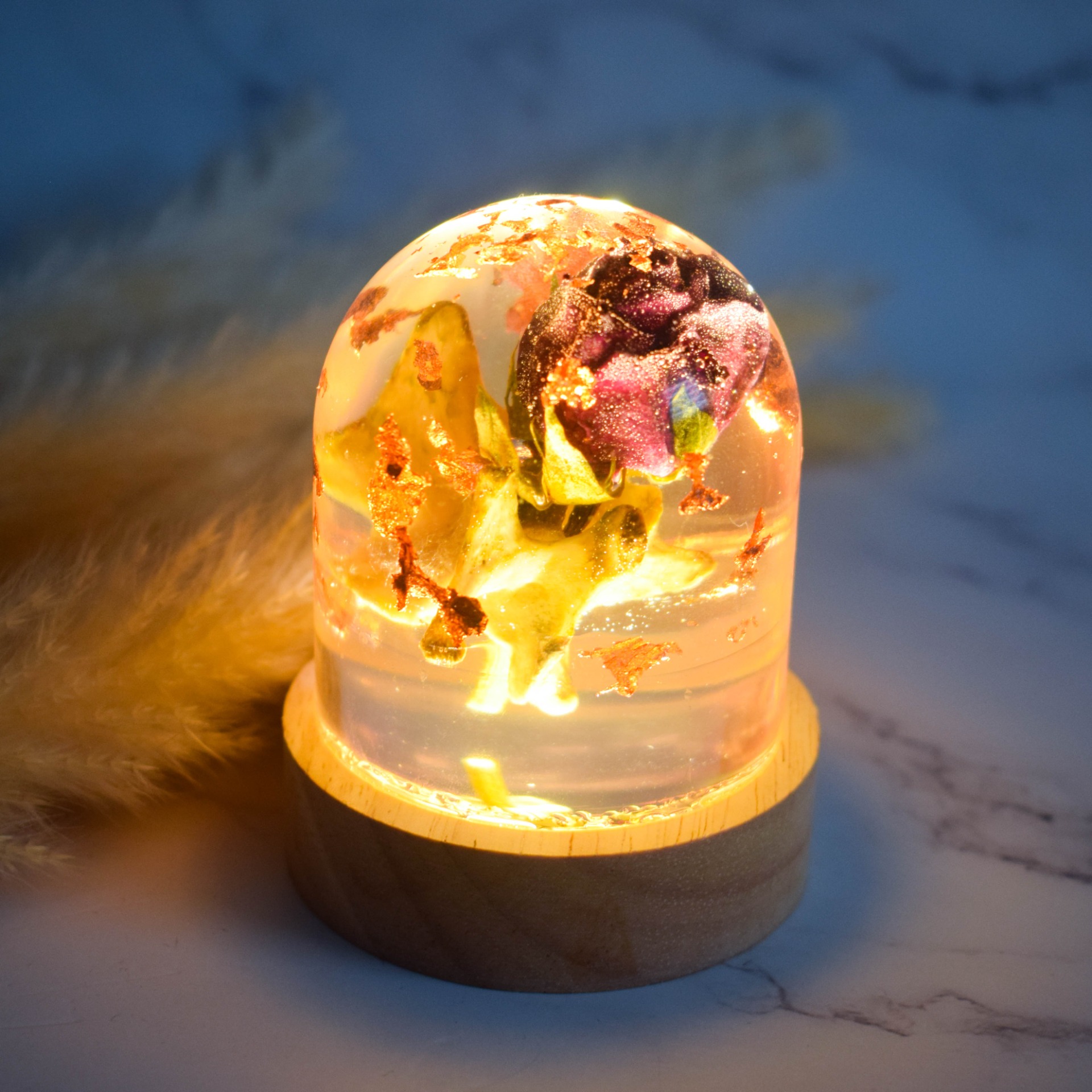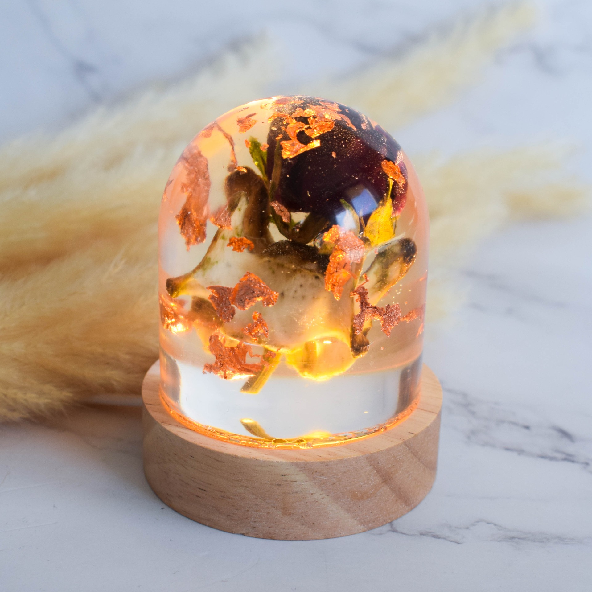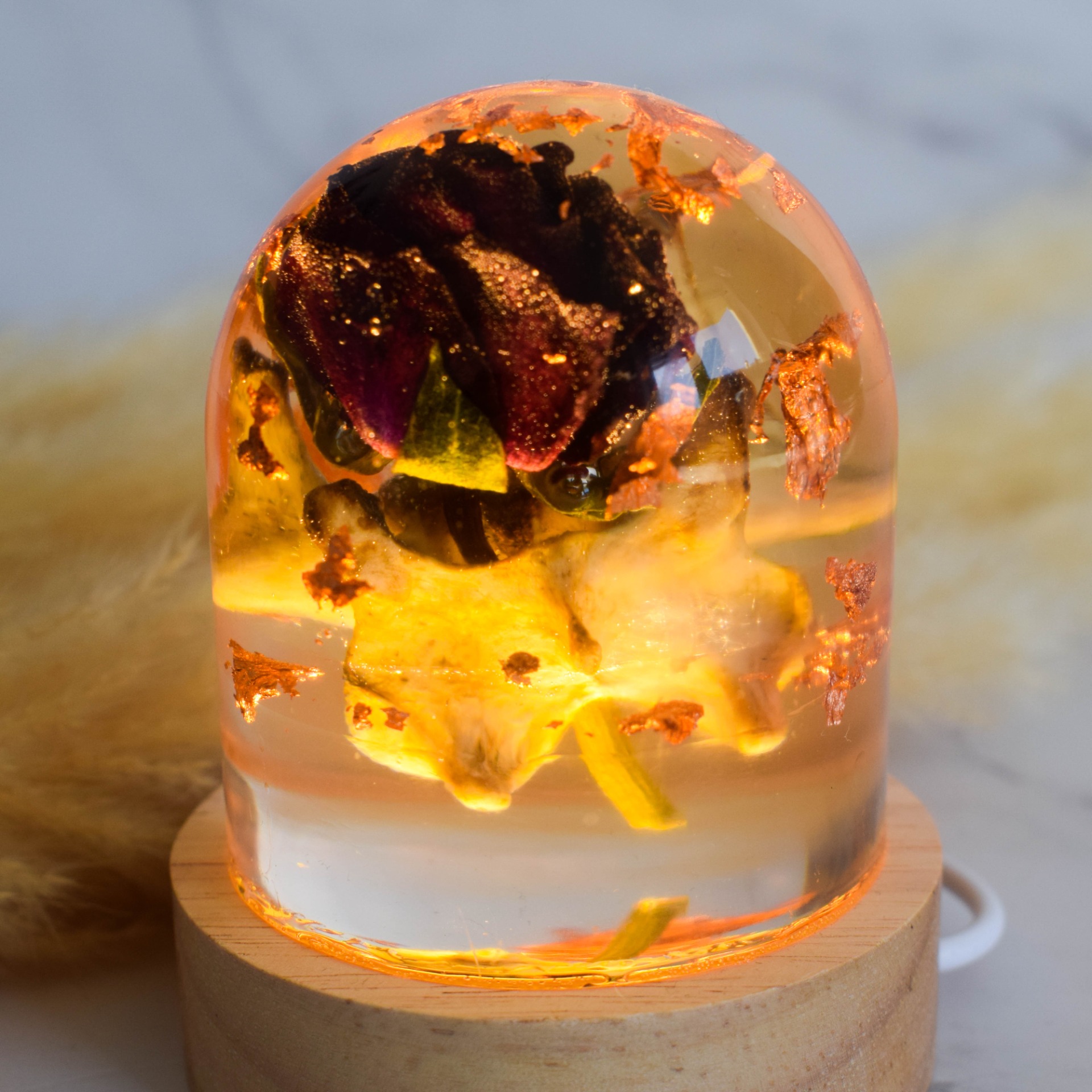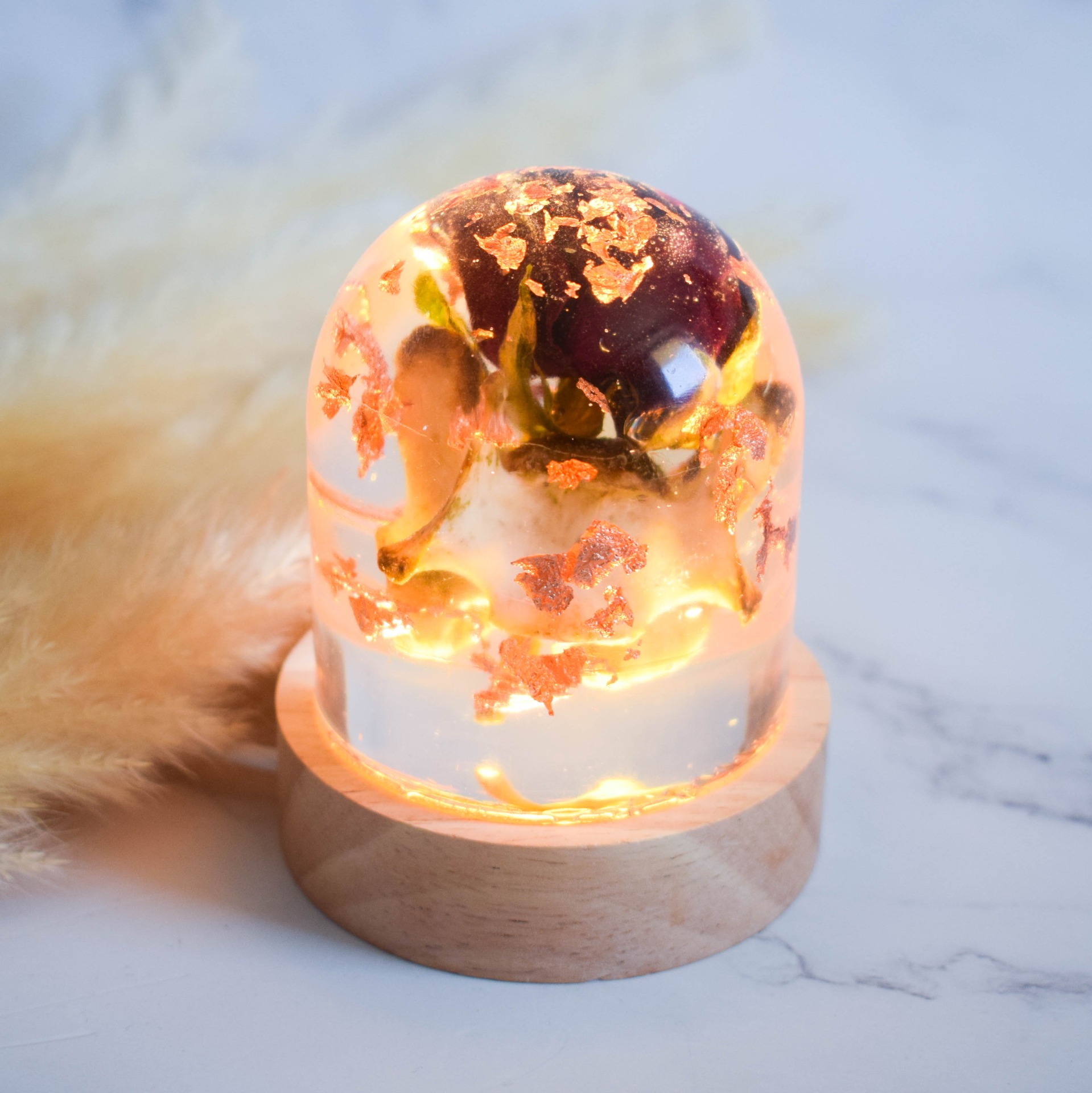 Lampička je odlitá z čiré pryskyřice ve tvaru menší kupole, uvnitř které je zalitý obratel divokého prasete a sušený květ růže. Kombinace přírodních materiálů vytváří zajímavý kontrast – kost a růže jsou při rozsvícení podsvíceny teplým světlem z dřevěného podstavce.
