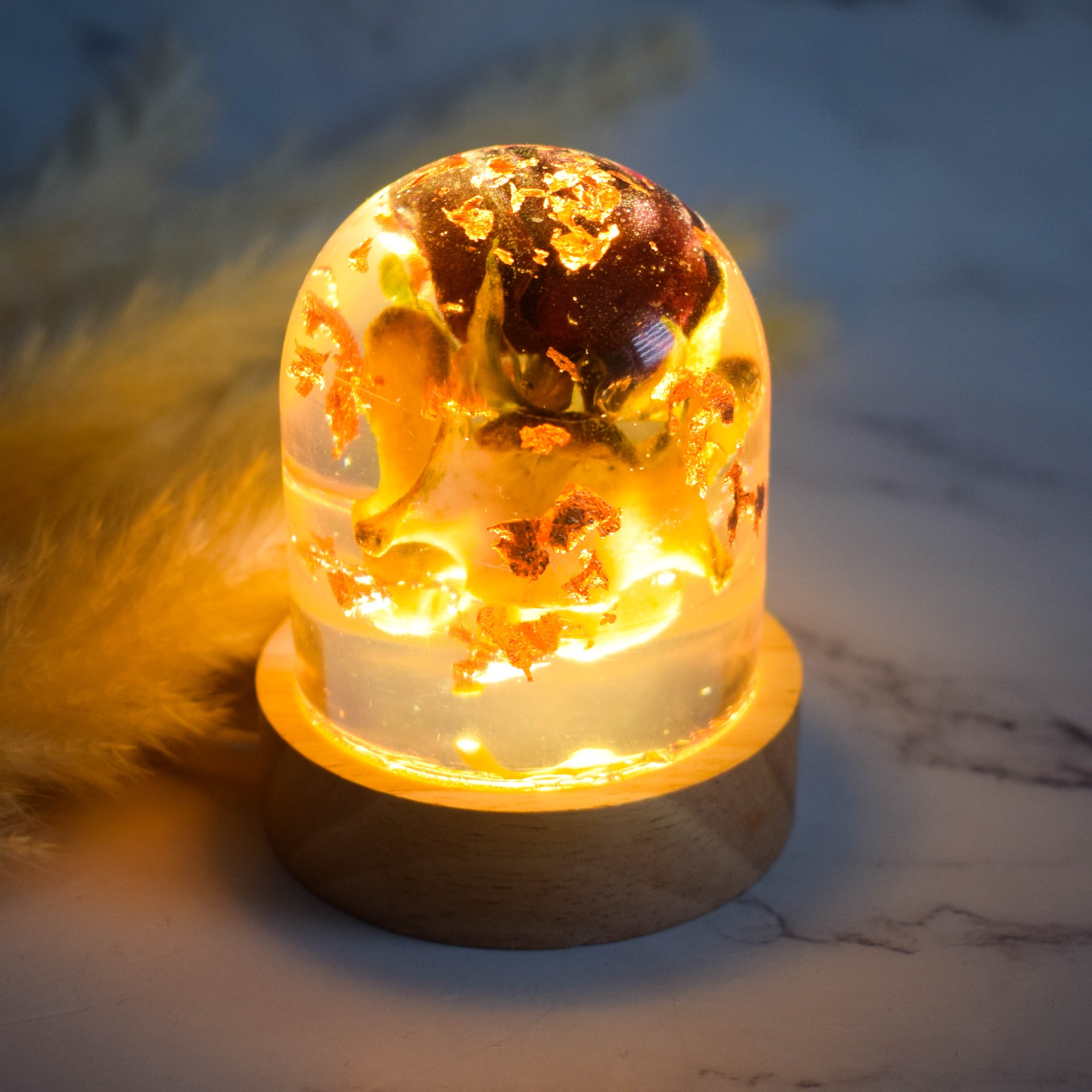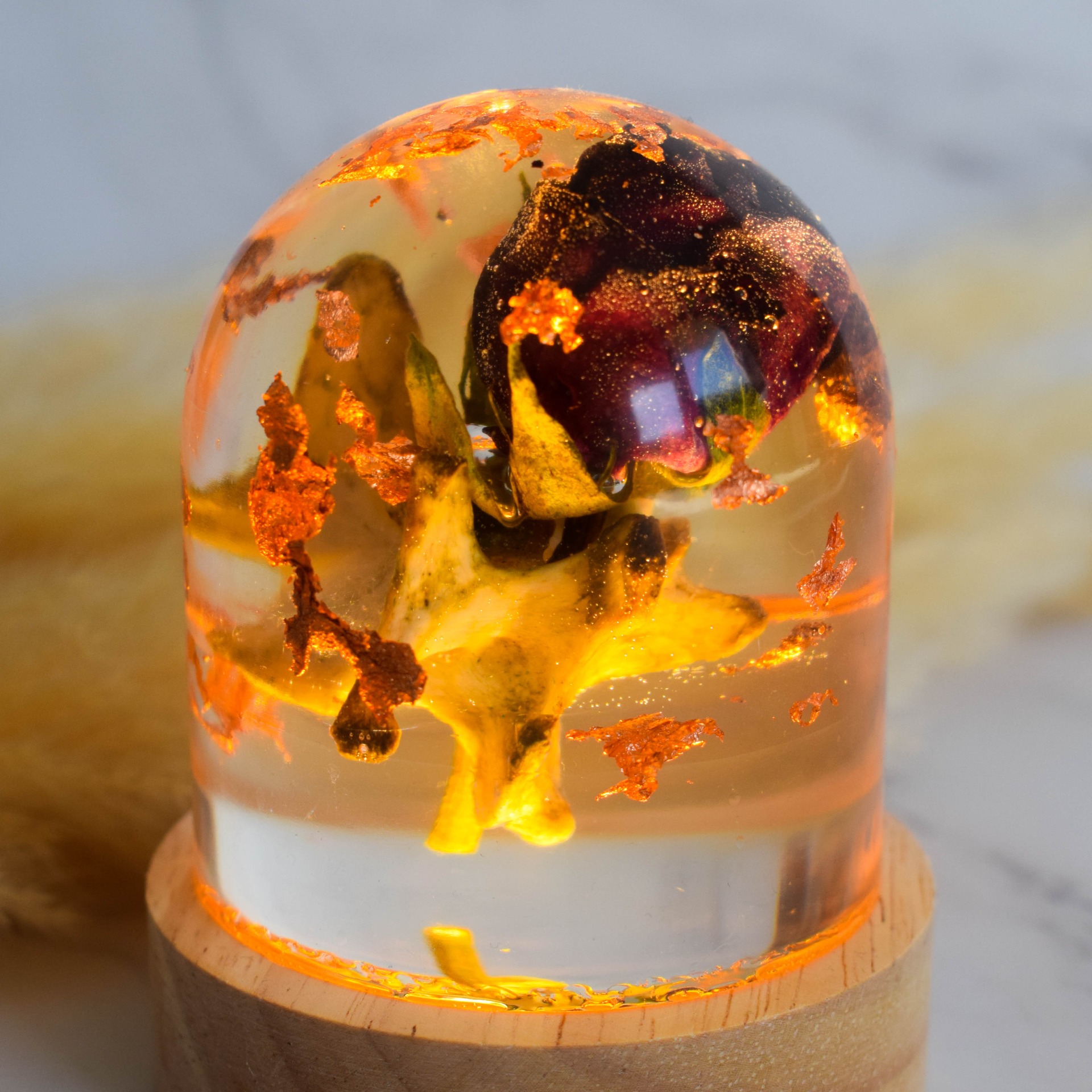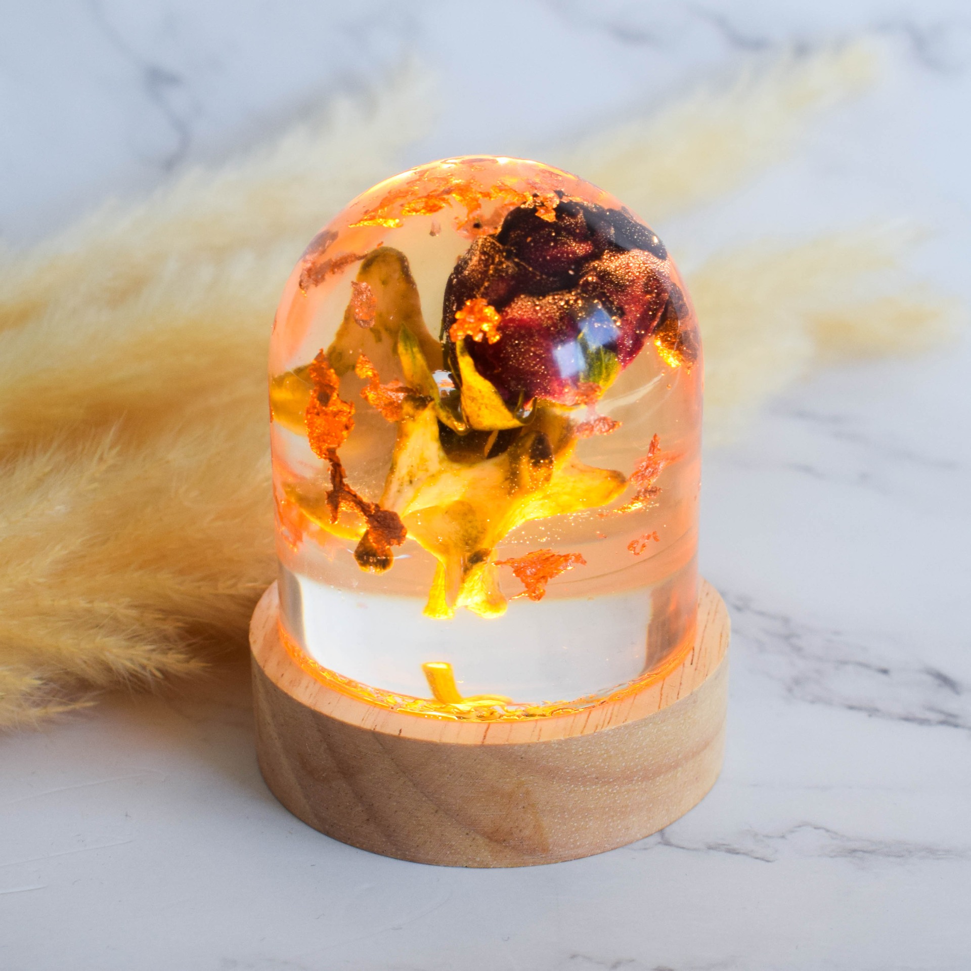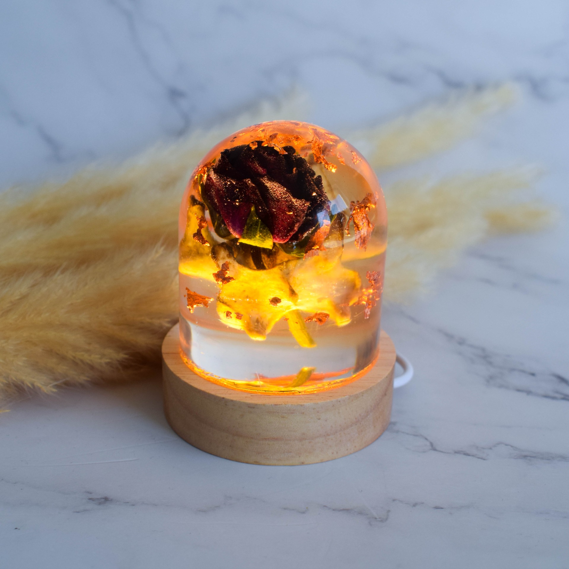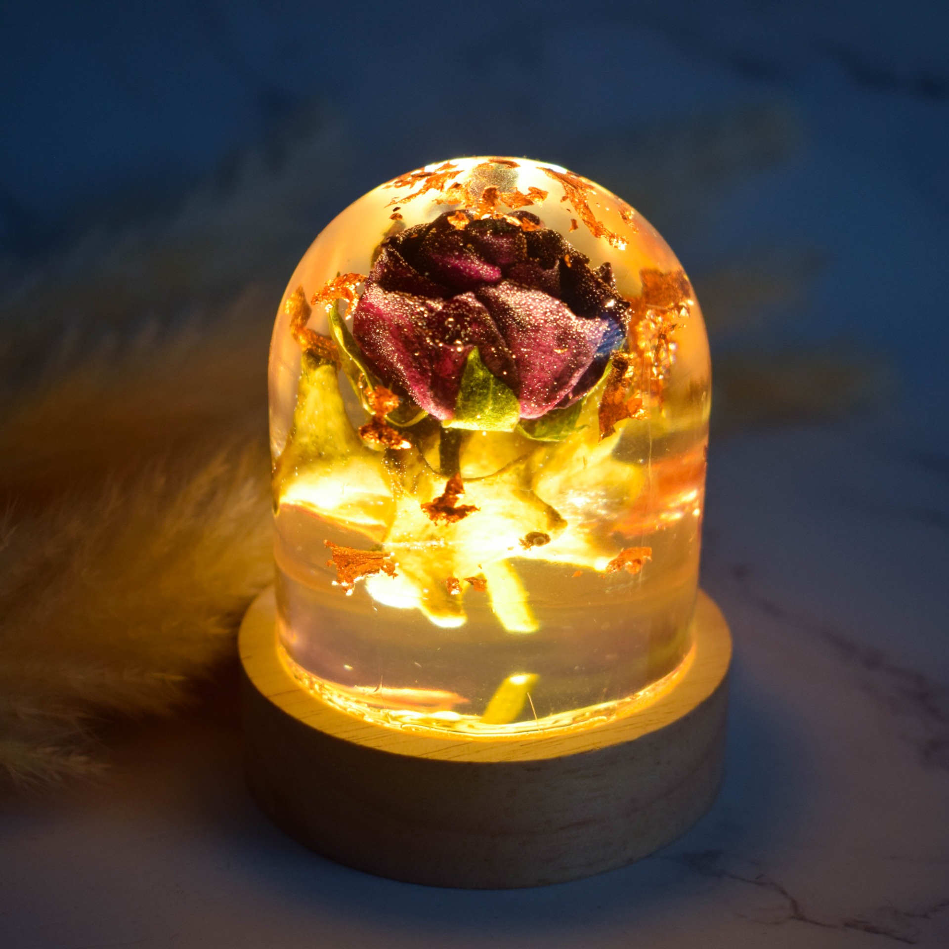 Lampička je odlitá z čiré pryskyřice ve tvaru menší kupole, uvnitř které je zalitý obratel divokého prasete a sušený květ růže. Kombinace přírodních materiálů vytváří zajímavý kontrast – kost a růže jsou při rozsvícení podsvíceny teplým světlem z dřevěného podstavce.
