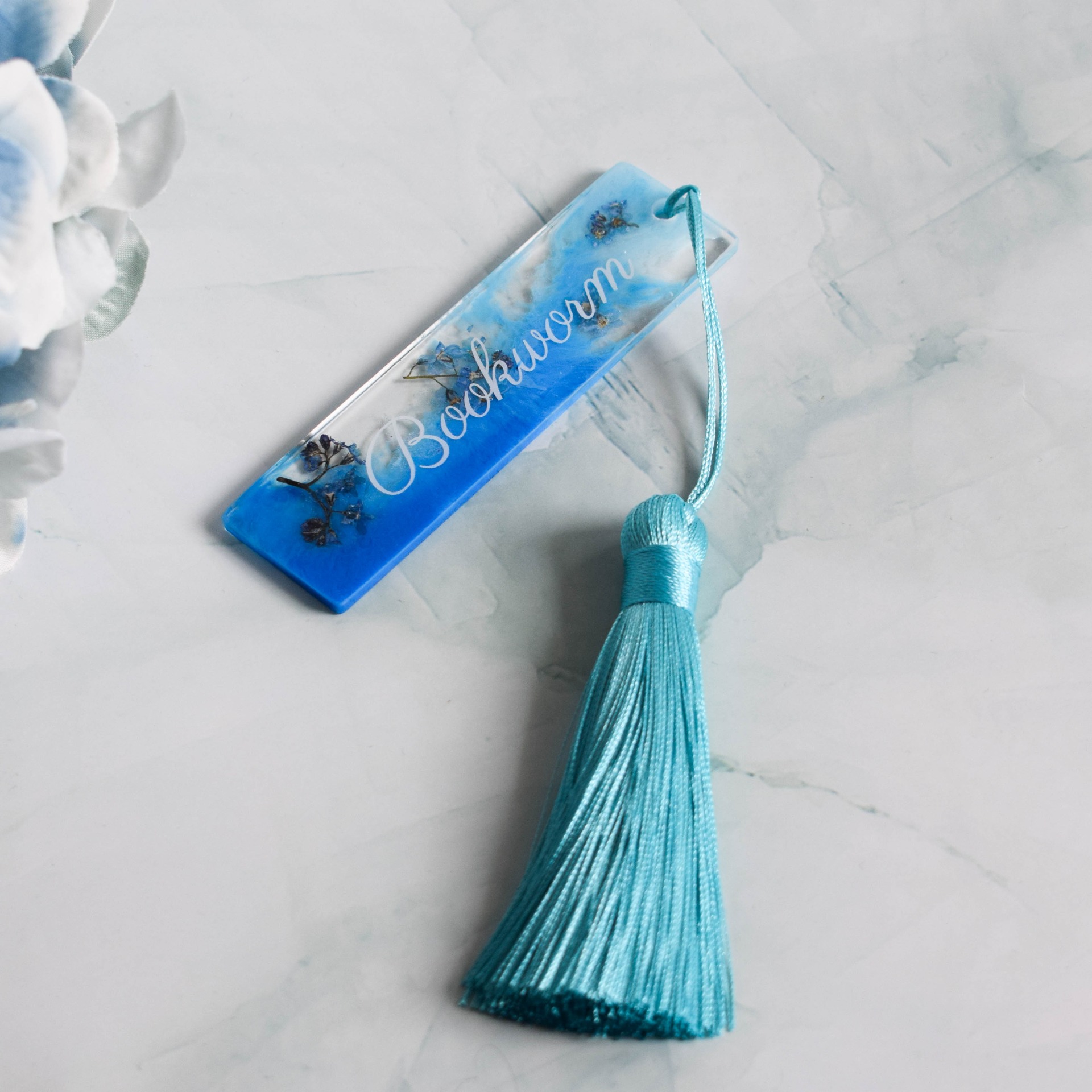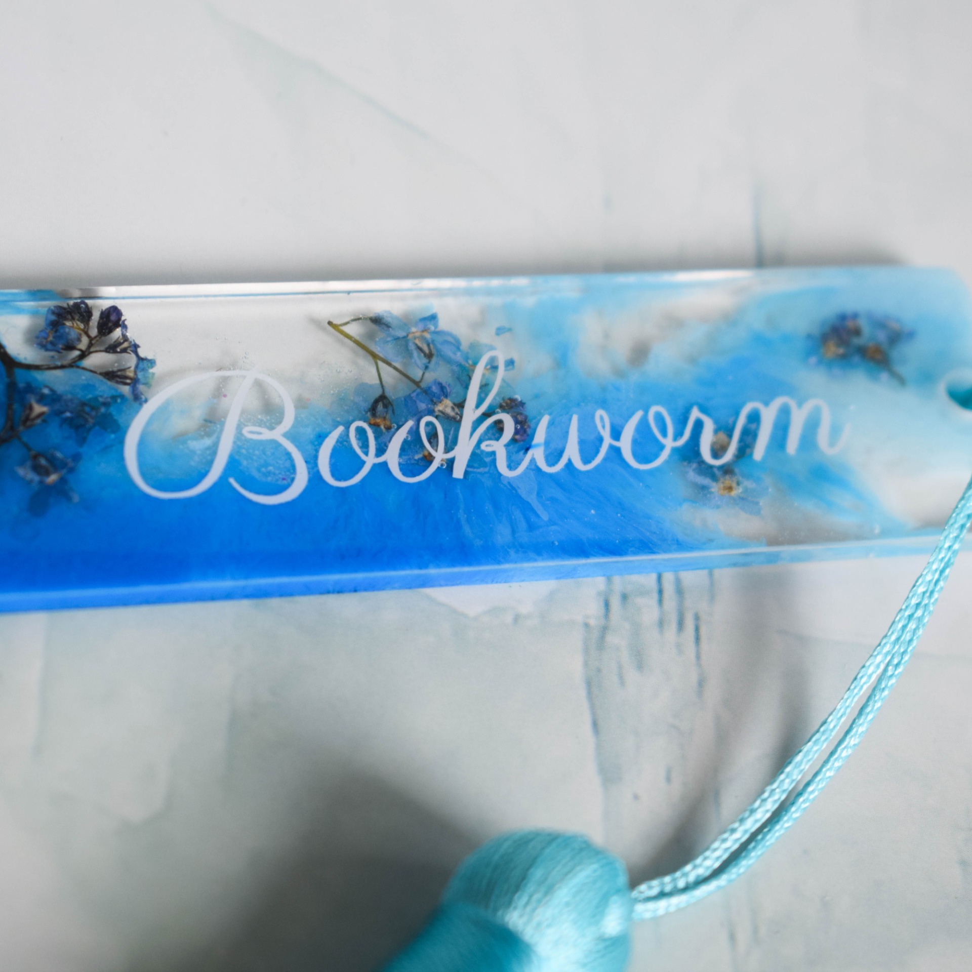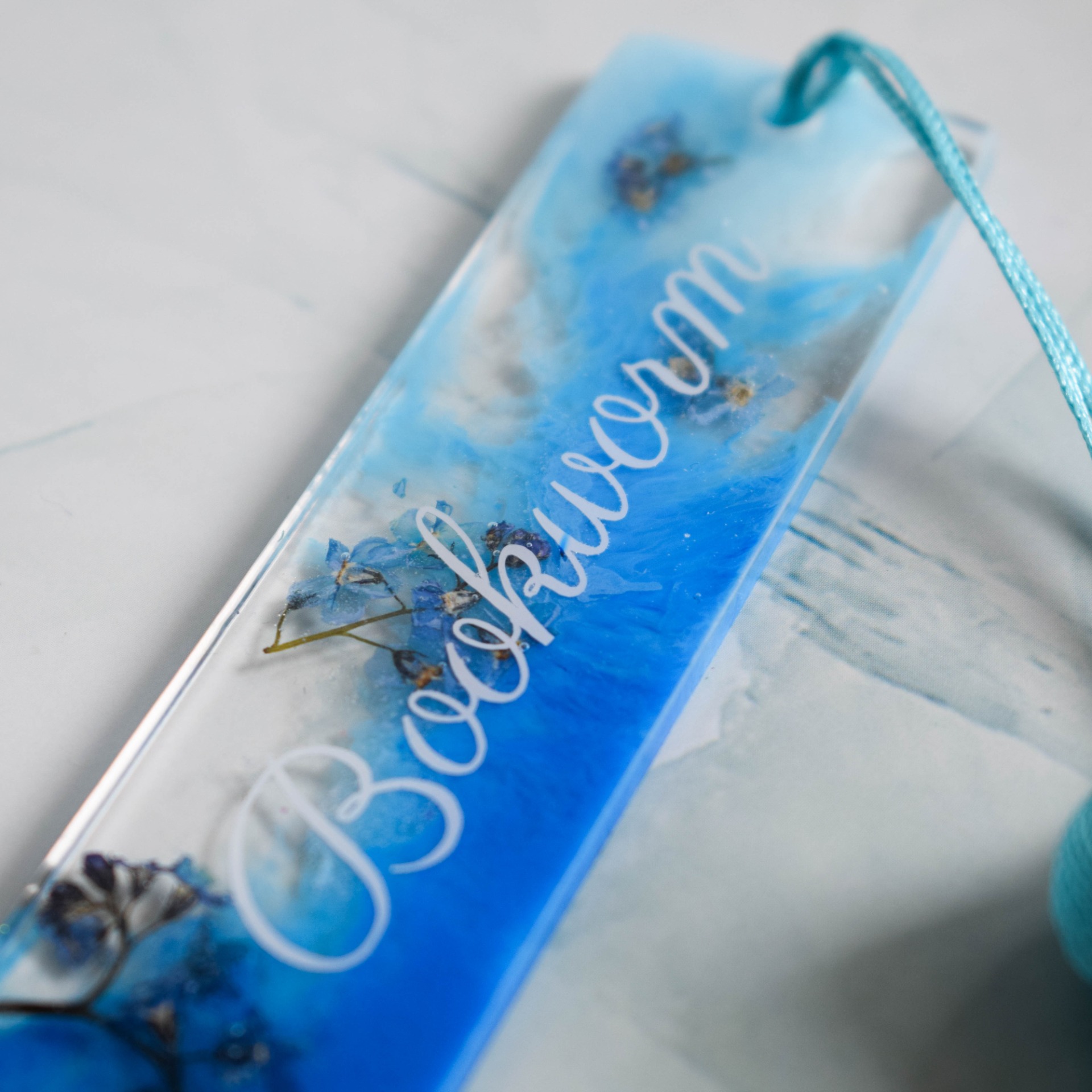 Záložka do knihy vyrobena z pryskyřice s ručně sbíranými a sušenými pomněnkami, se světle a tmavě modrým kouřovým efektem a vyřezávaným nápisem Bookworm.