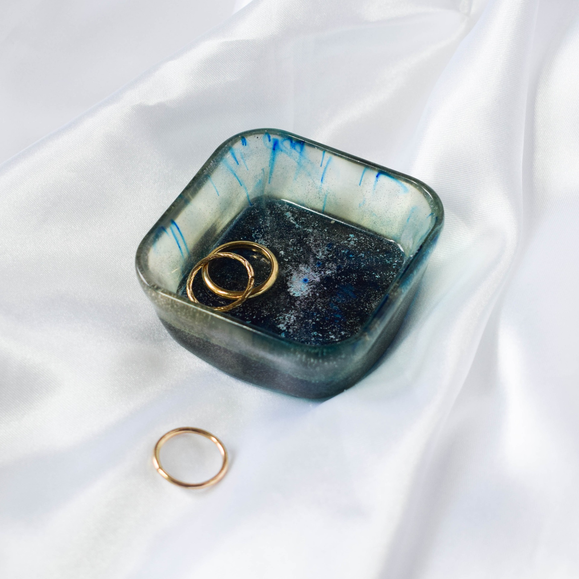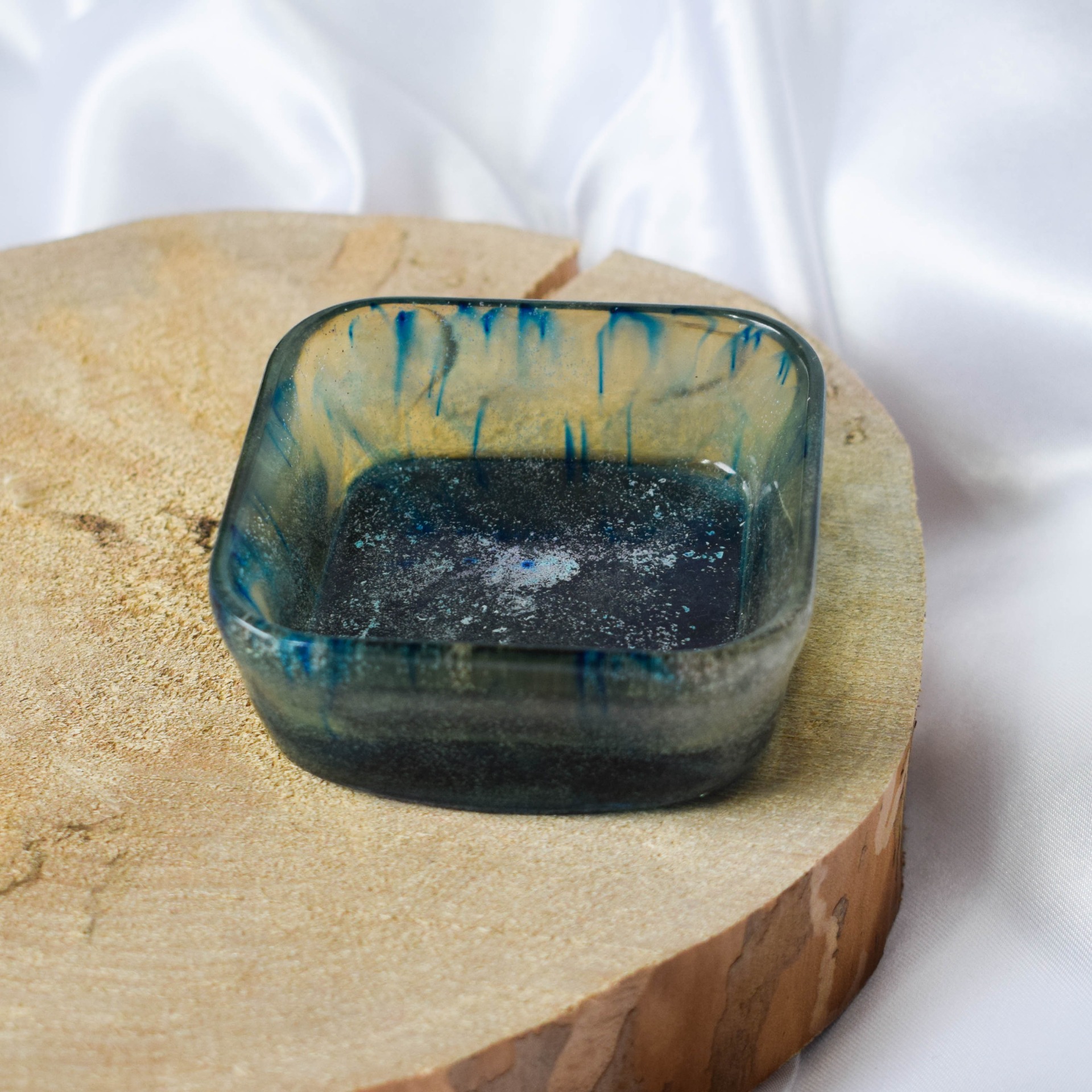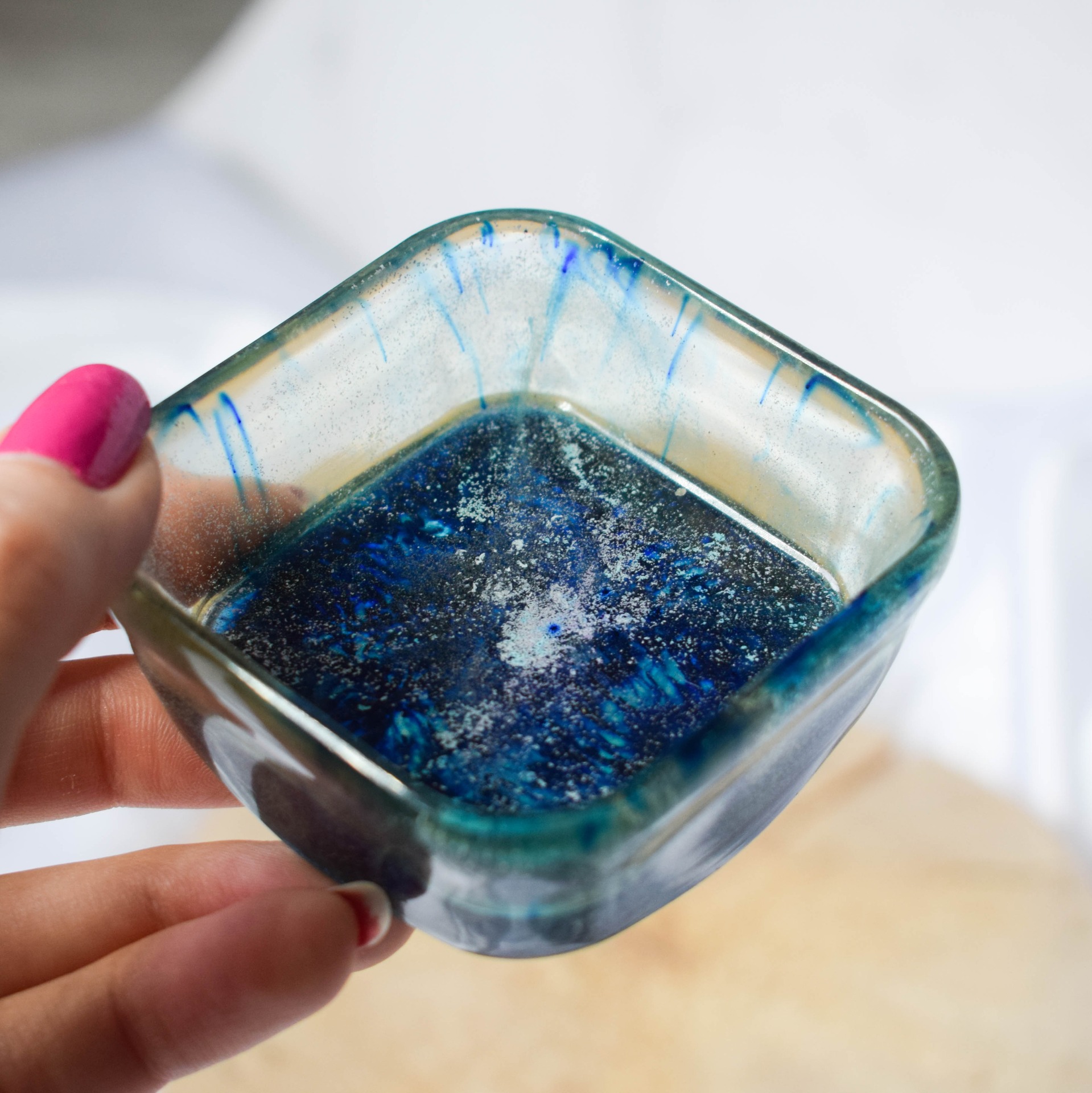 Malá dekorační mistička ve tvaru čtverce, sloužící k odkládání prstýnků či jiných drobných předmětů, v modrém designu - použit modrý a bílý pigment.