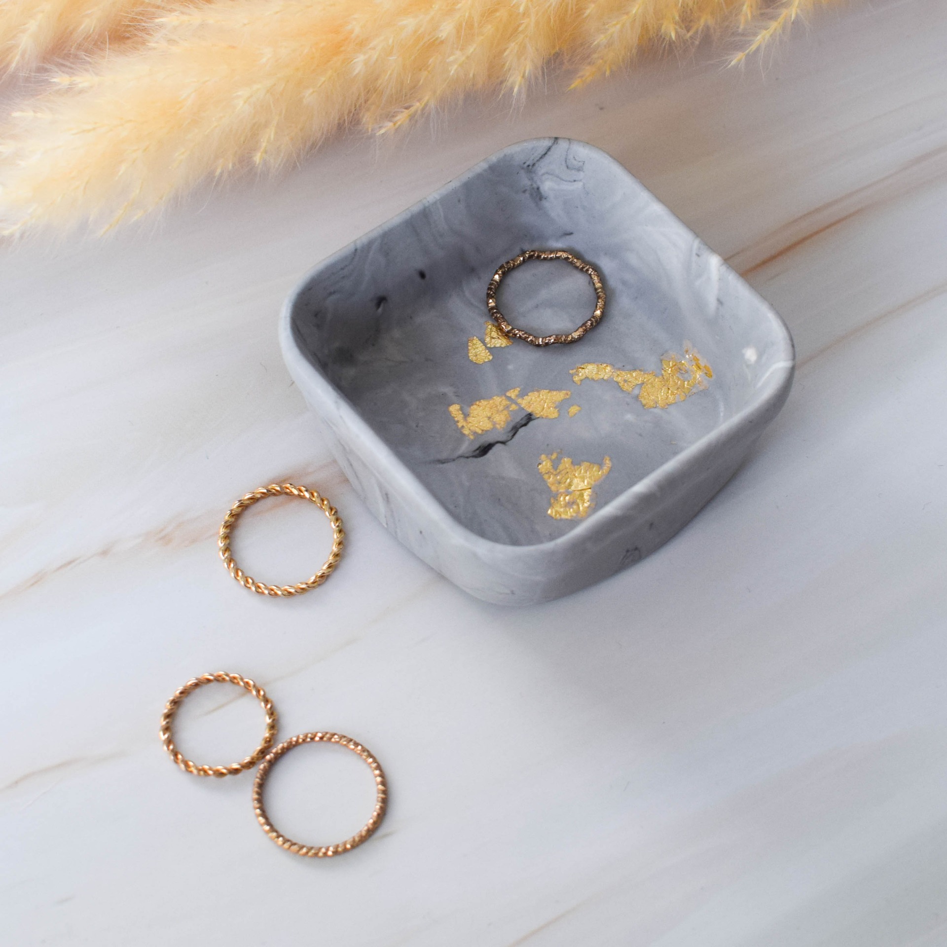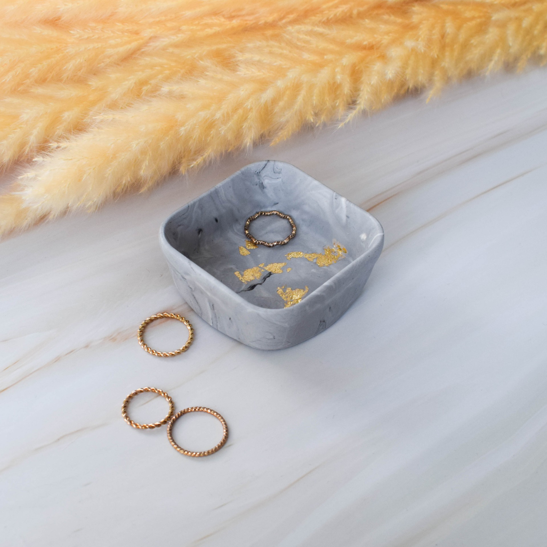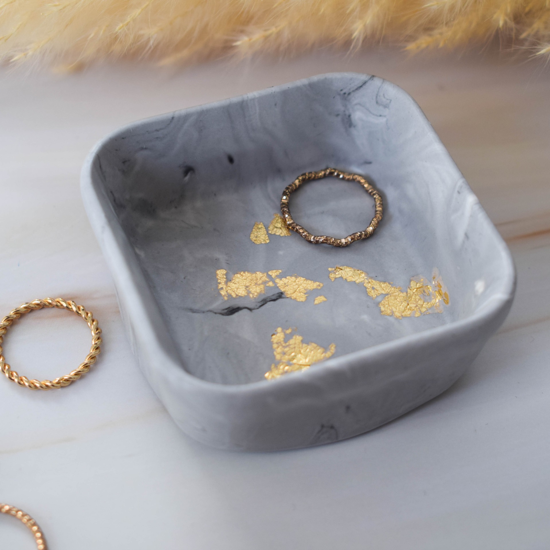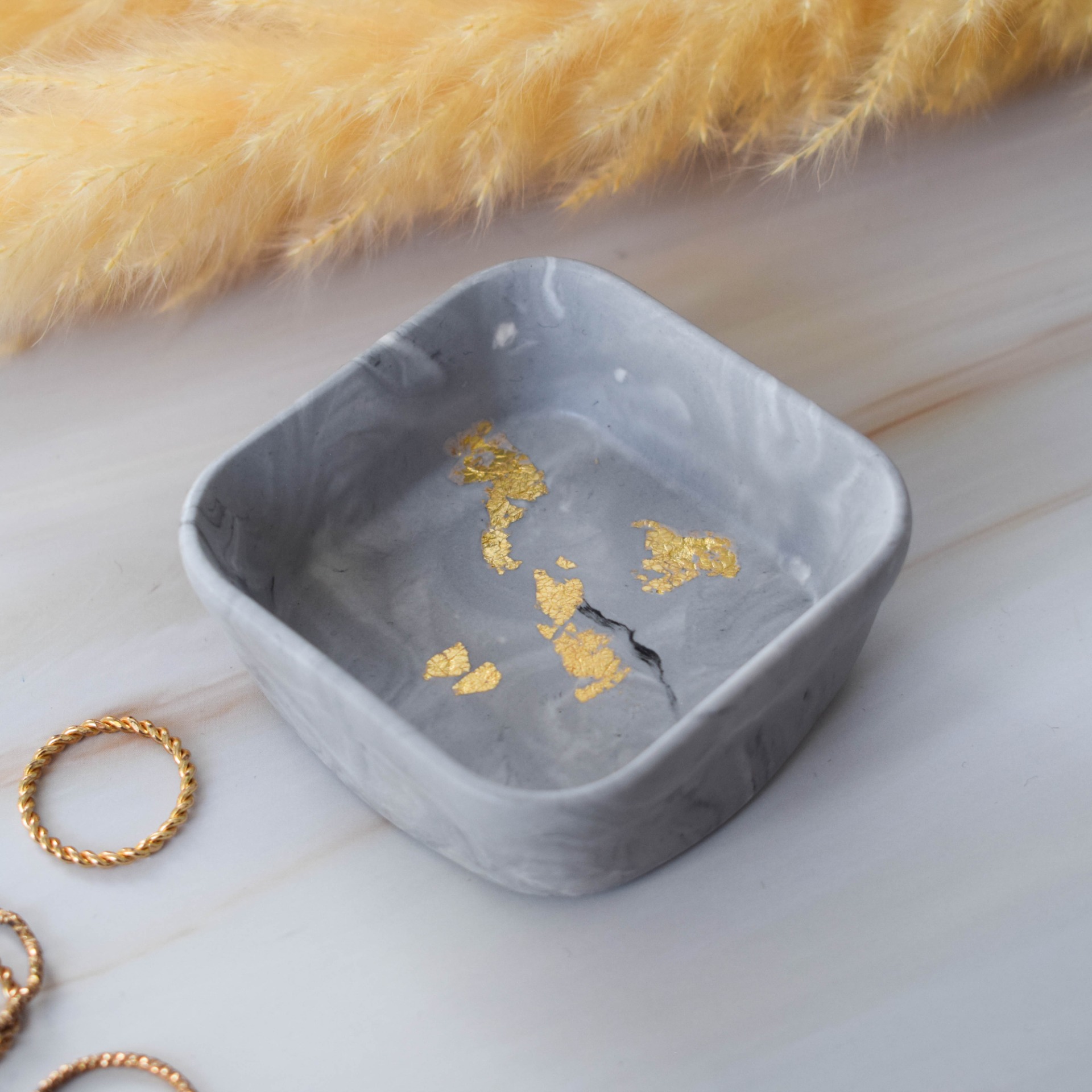 Malá dekorační mistička ve tvaru čtverce vyrobena z jesmonitu, sloužící k odkládání prstýnků či jiných drobných předmětů, v designu šedého mramoru a zlatých plátků.