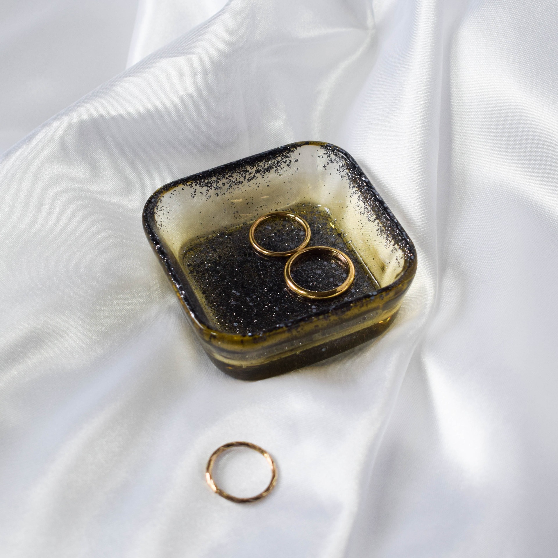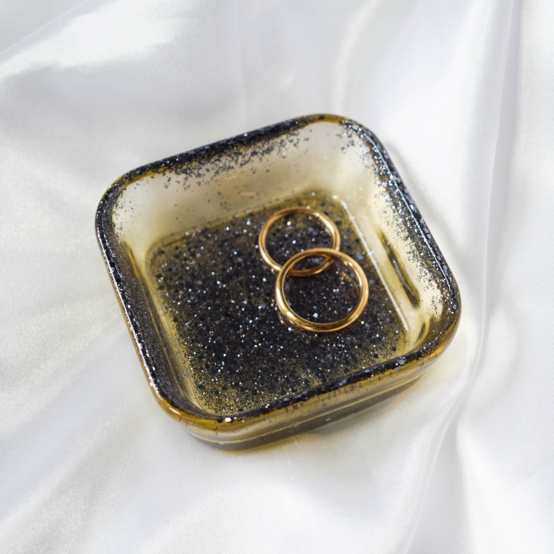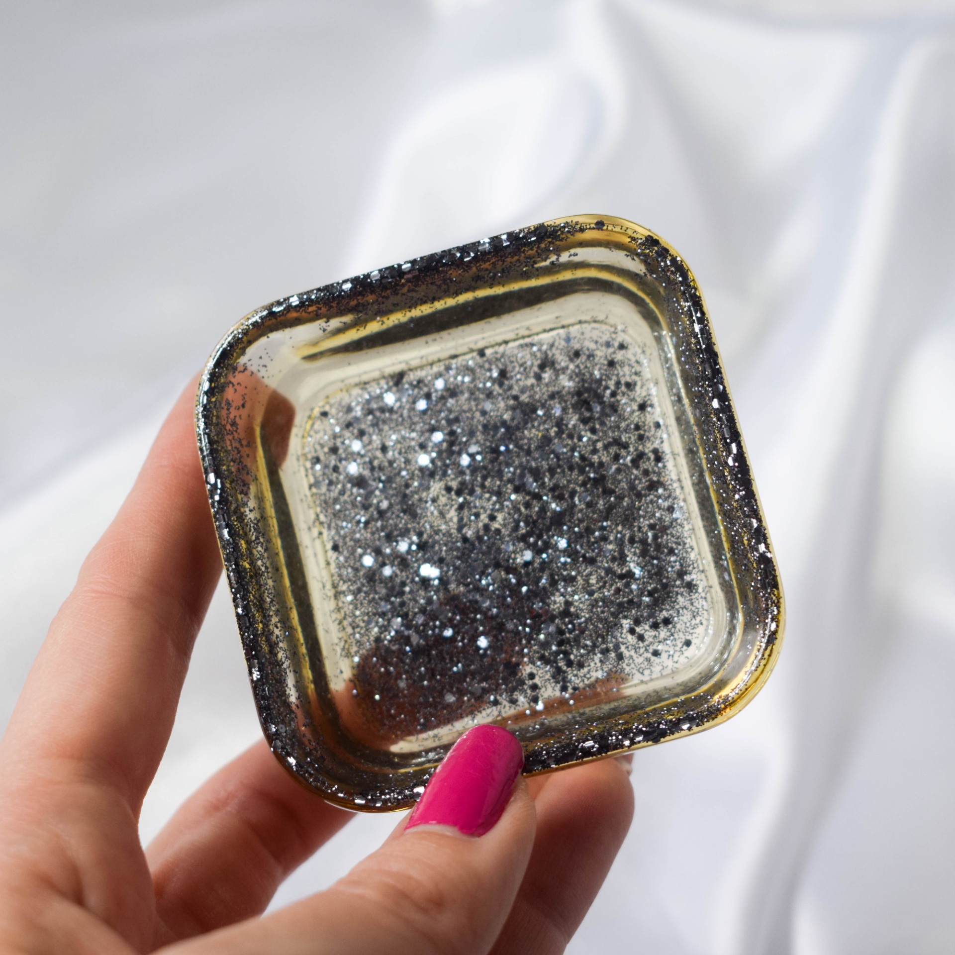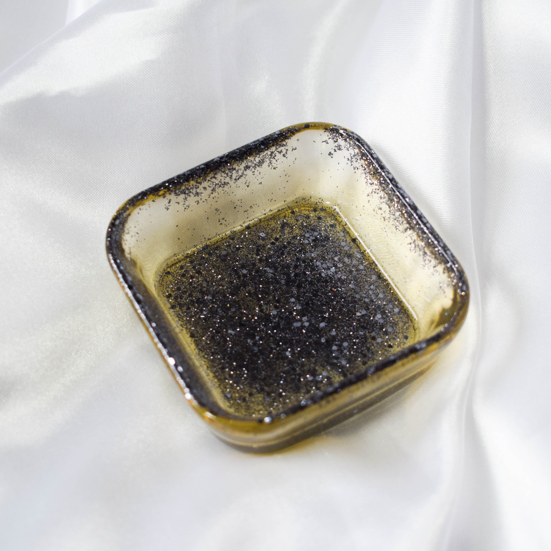 Malá dekorační mistička ve tvaru čtverce, sloužící k odkládání prstýnků či jiných drobných předmětů, v průhledné barvě se šedými třpytkami.