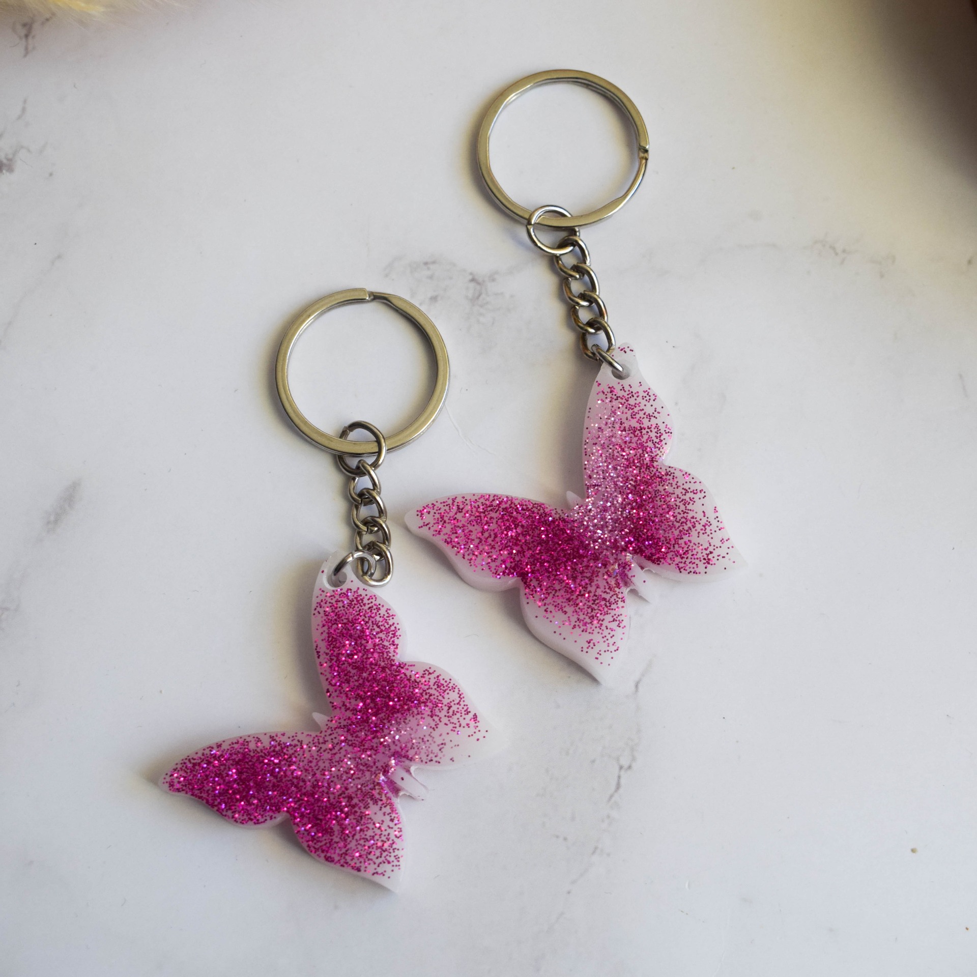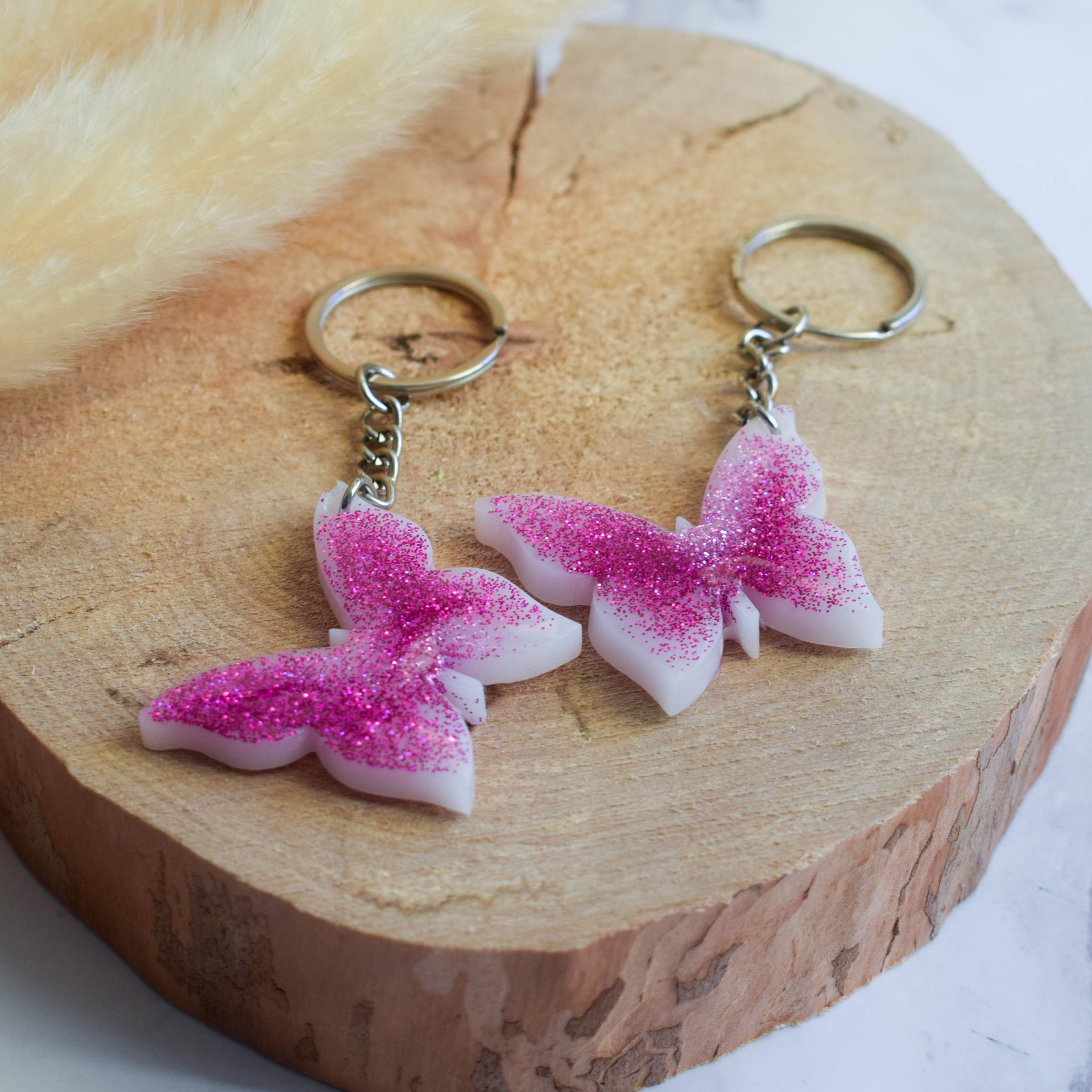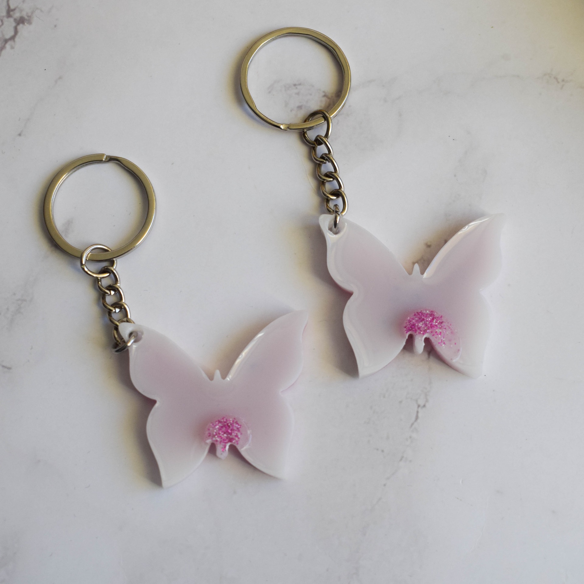 Klíčenka ve tvaru motýla ve třpytivém fialovo-růžovém provedení s bílým podkladem. Při výrobě se bohužel třpytky vylily i na druhou stranu, což lze vidět na fotkách.