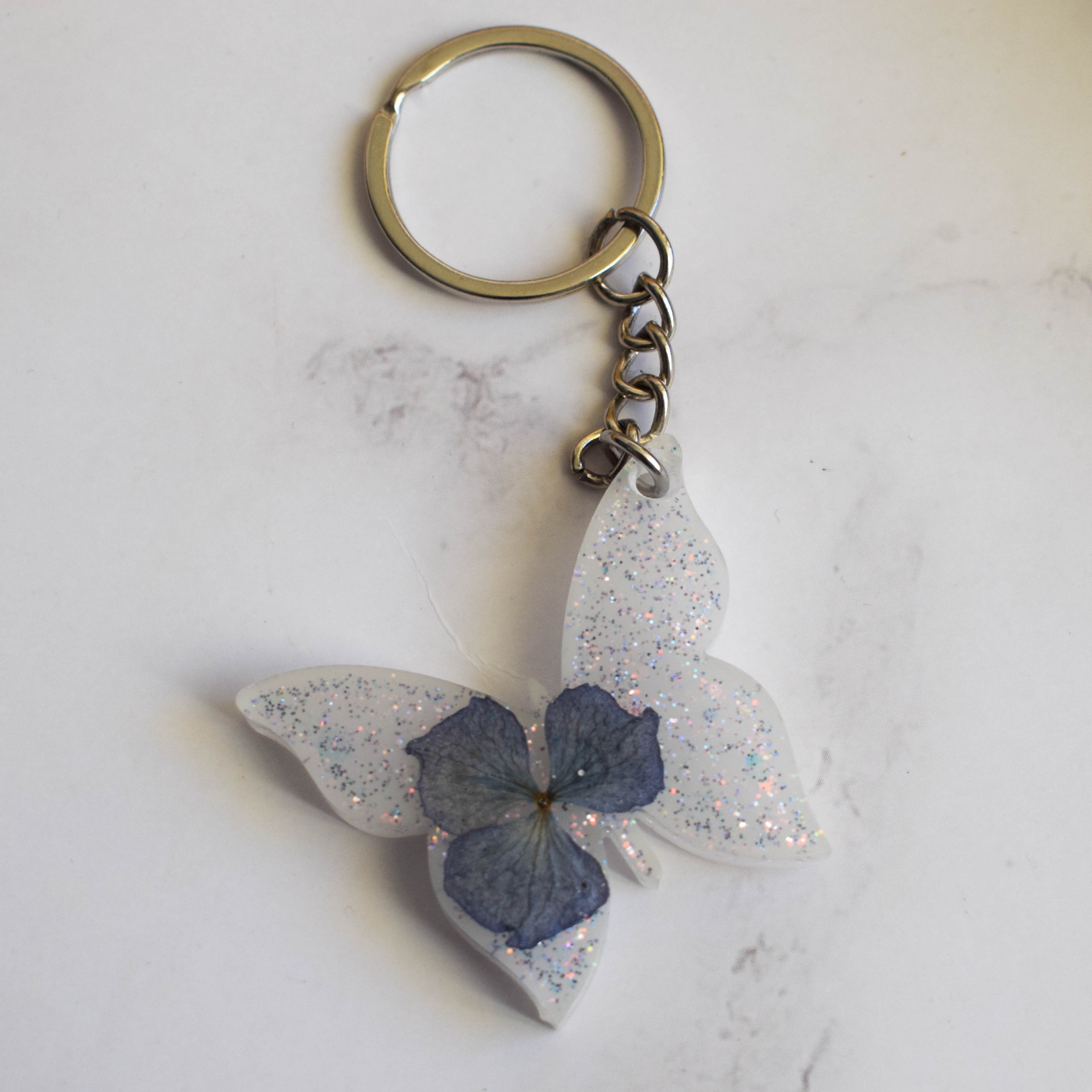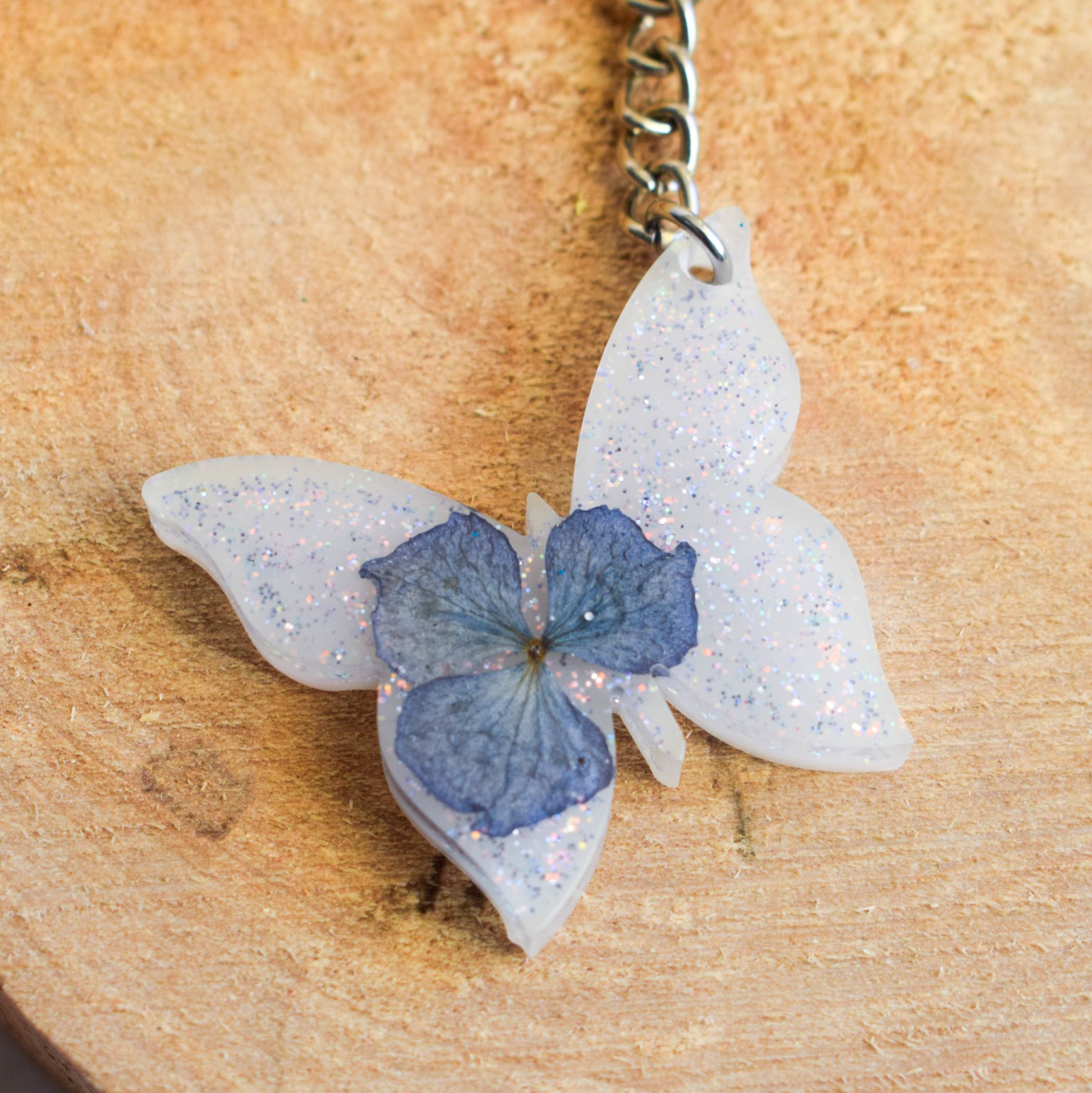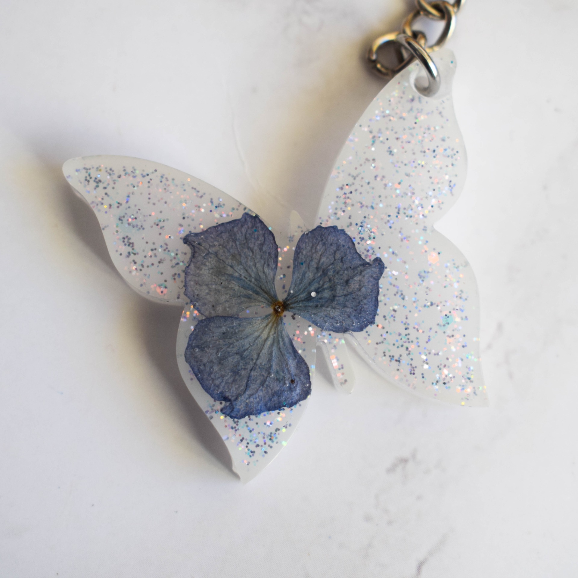 Klíčenka ve tvaru motýla se sušenou hortenzií, holografickými třpytkami a bílým pozadí.