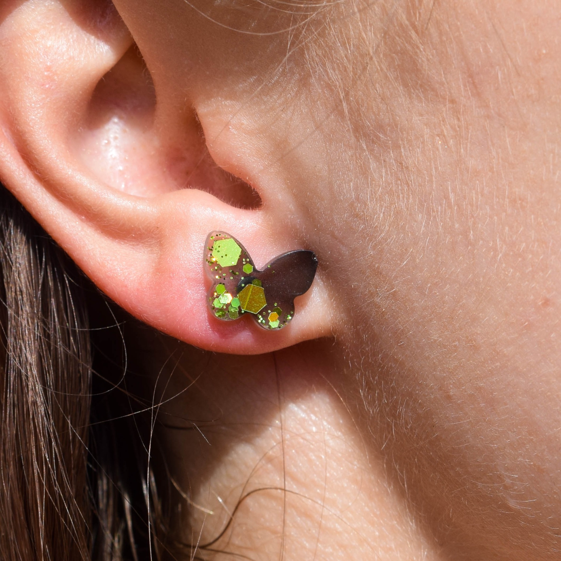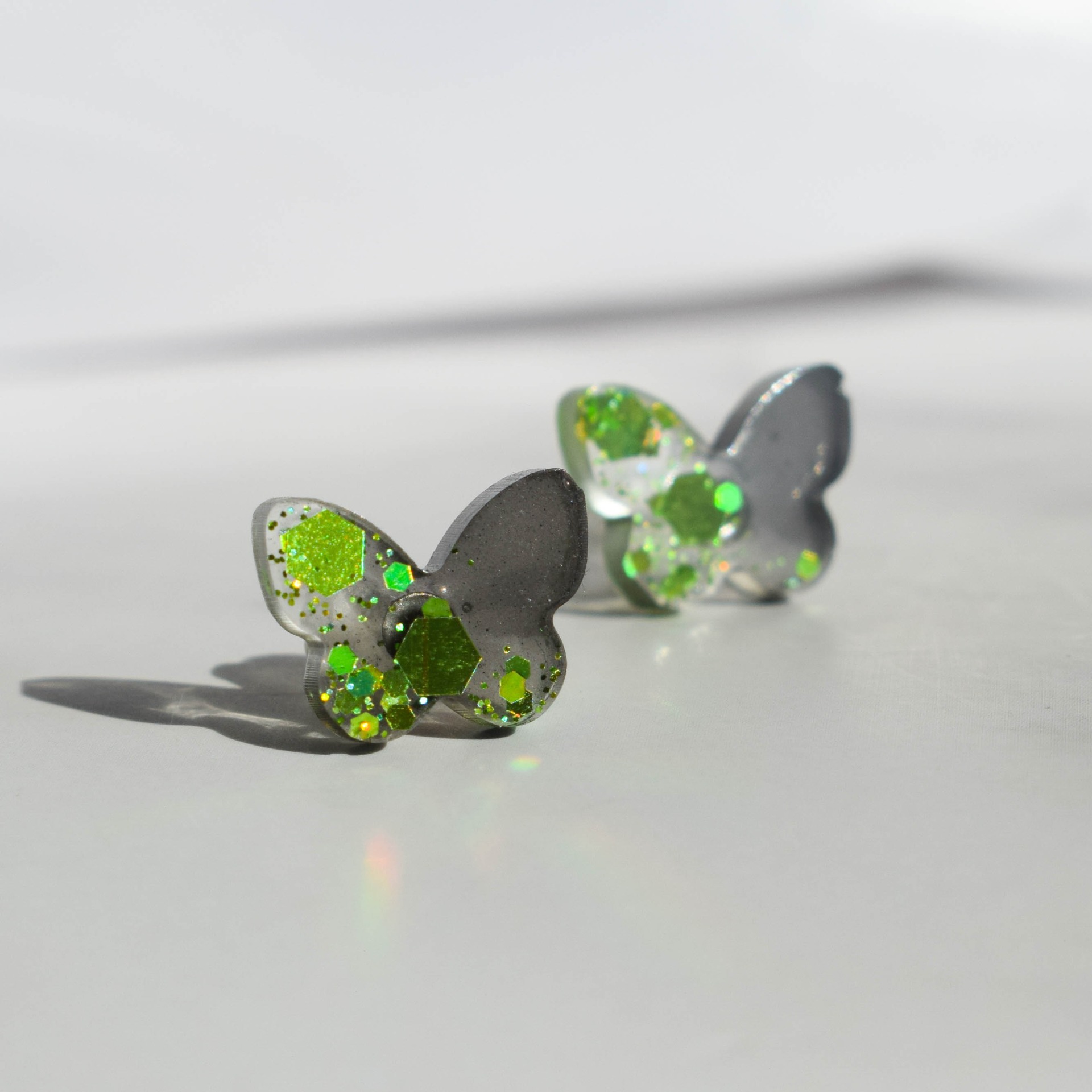 Tyto ručně vyráběné náušnice ve tvaru motýlků jsou vytvořeny z pryskyřice a zdobeny černou barvou a holografickými glitry, které se duhově lesknou na každém kroku.