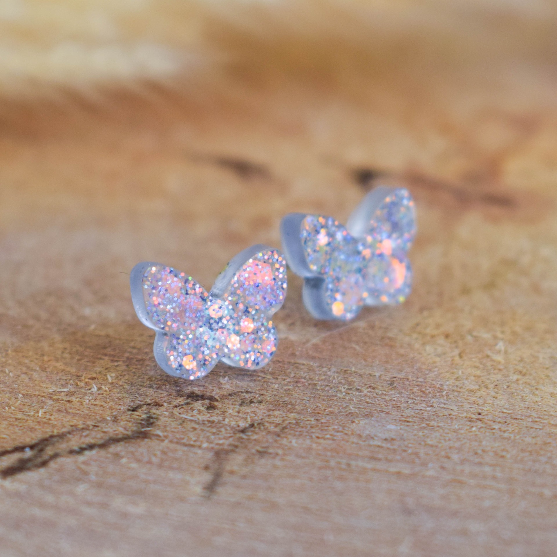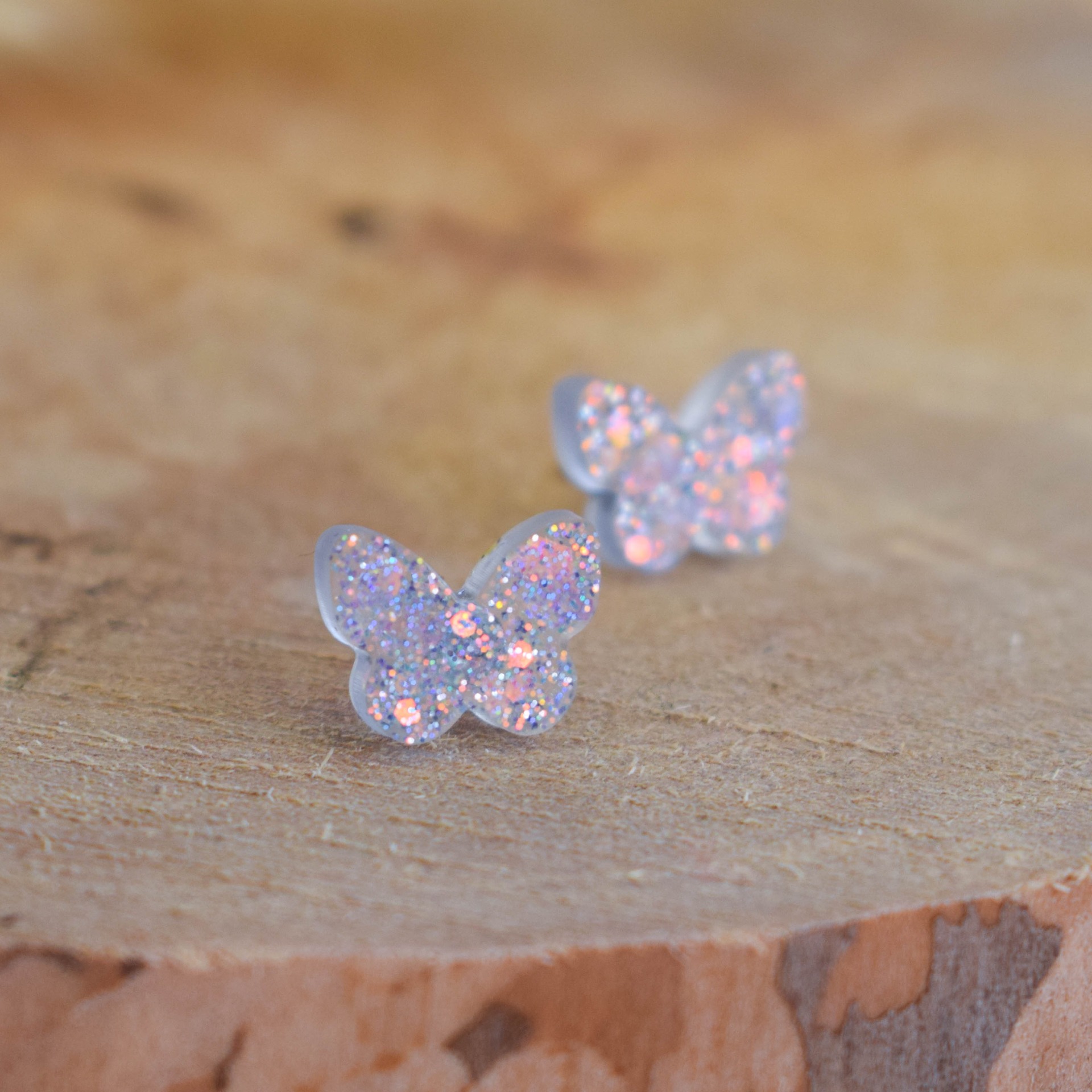 Tyto ručně vyráběné fialovo-růžové náušnice ve tvaru motýlků jsou vytvořeny z pryskyřice a zdobeny holografickými glitry, které se duhově lesknou na každém kroku.