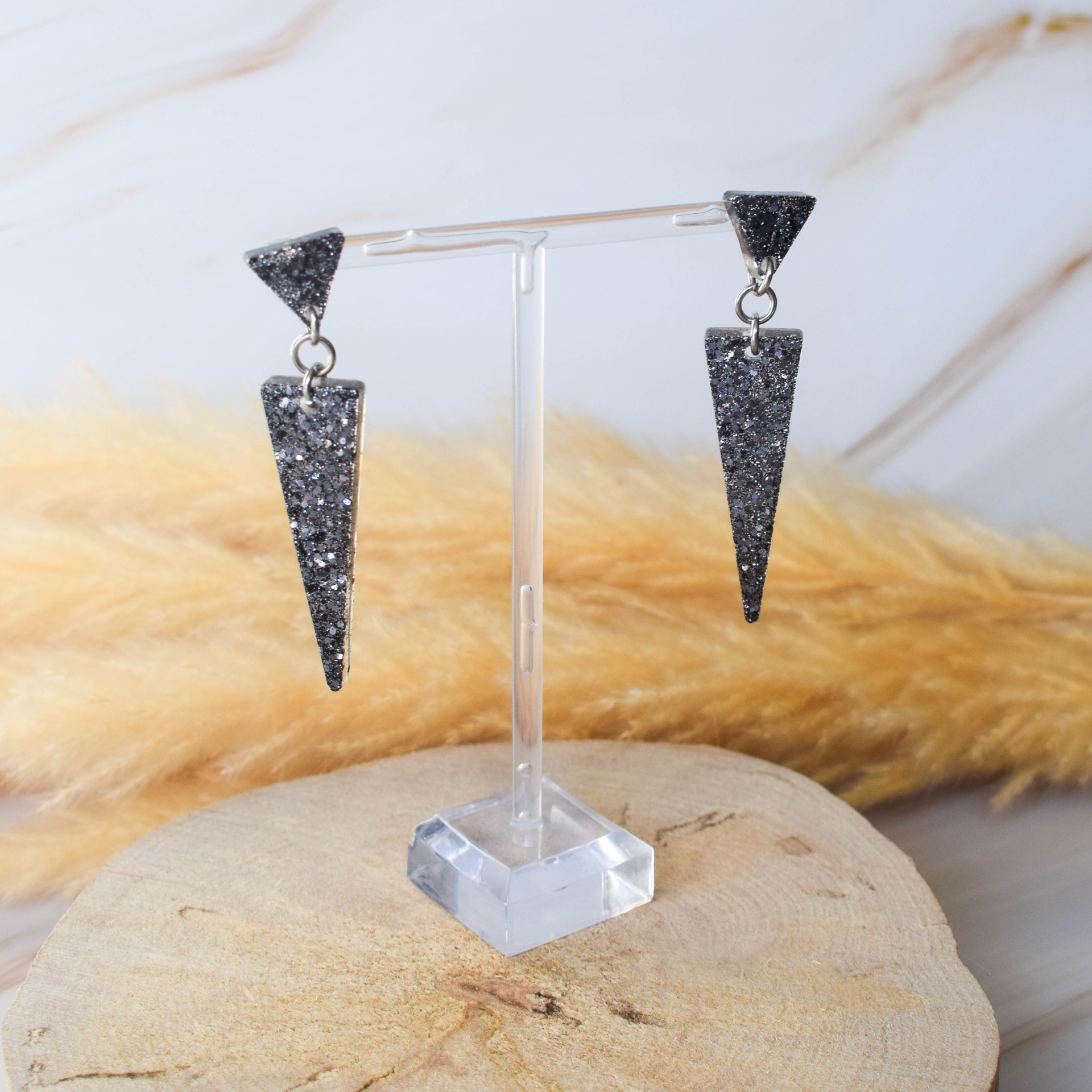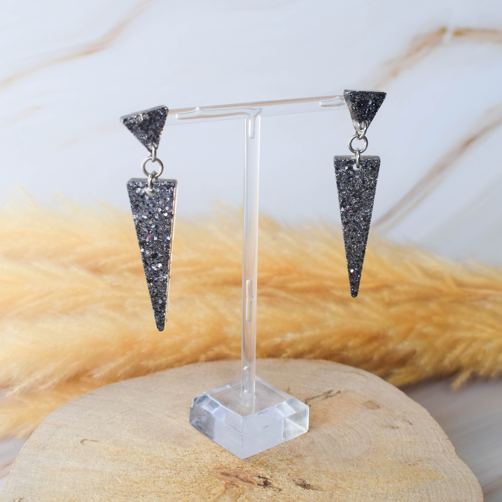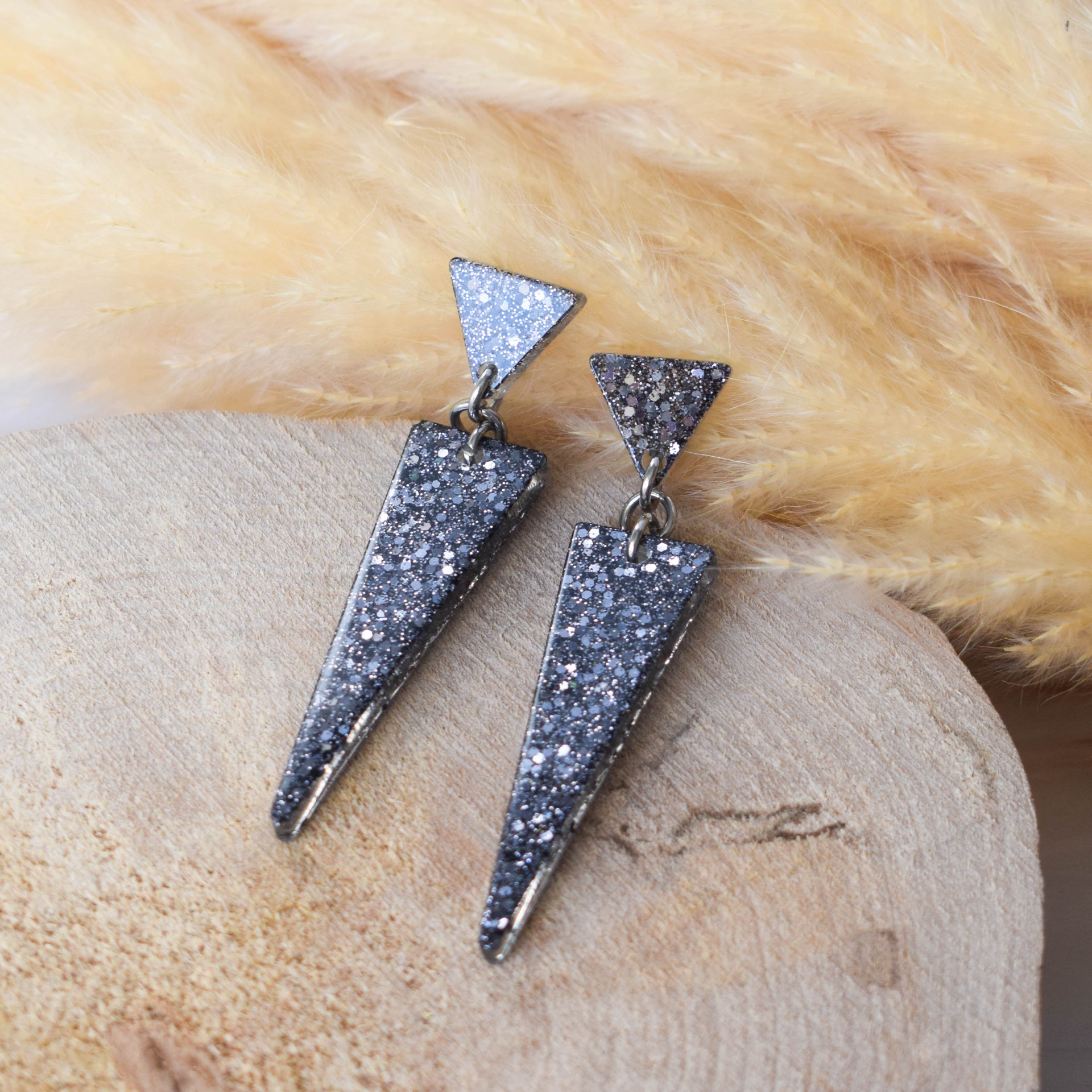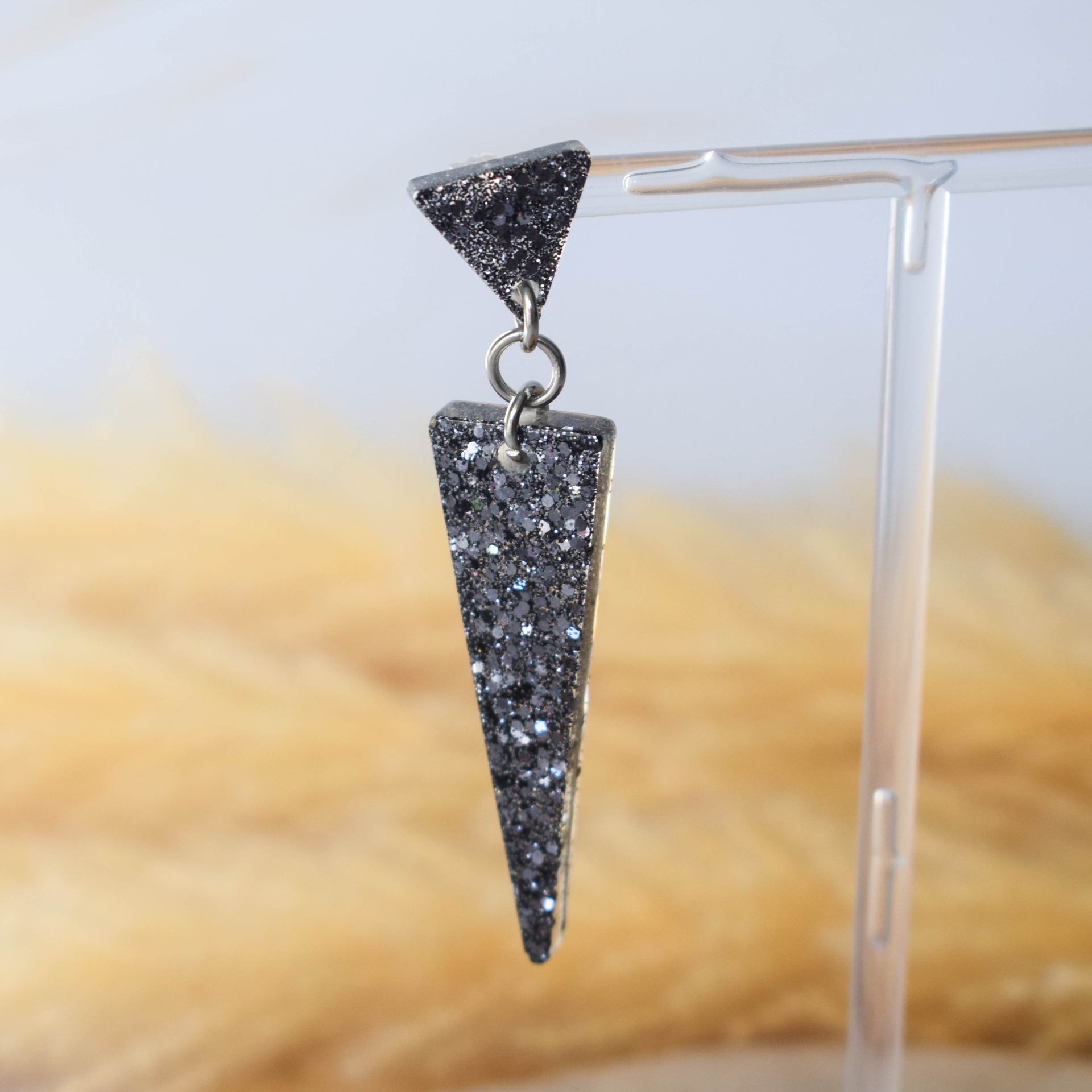 Náušnice z pryskyřice ve tvaru trojúhelníků v designu s antracitovými třpytkami. Komponenty jsou z nerezové oceli.