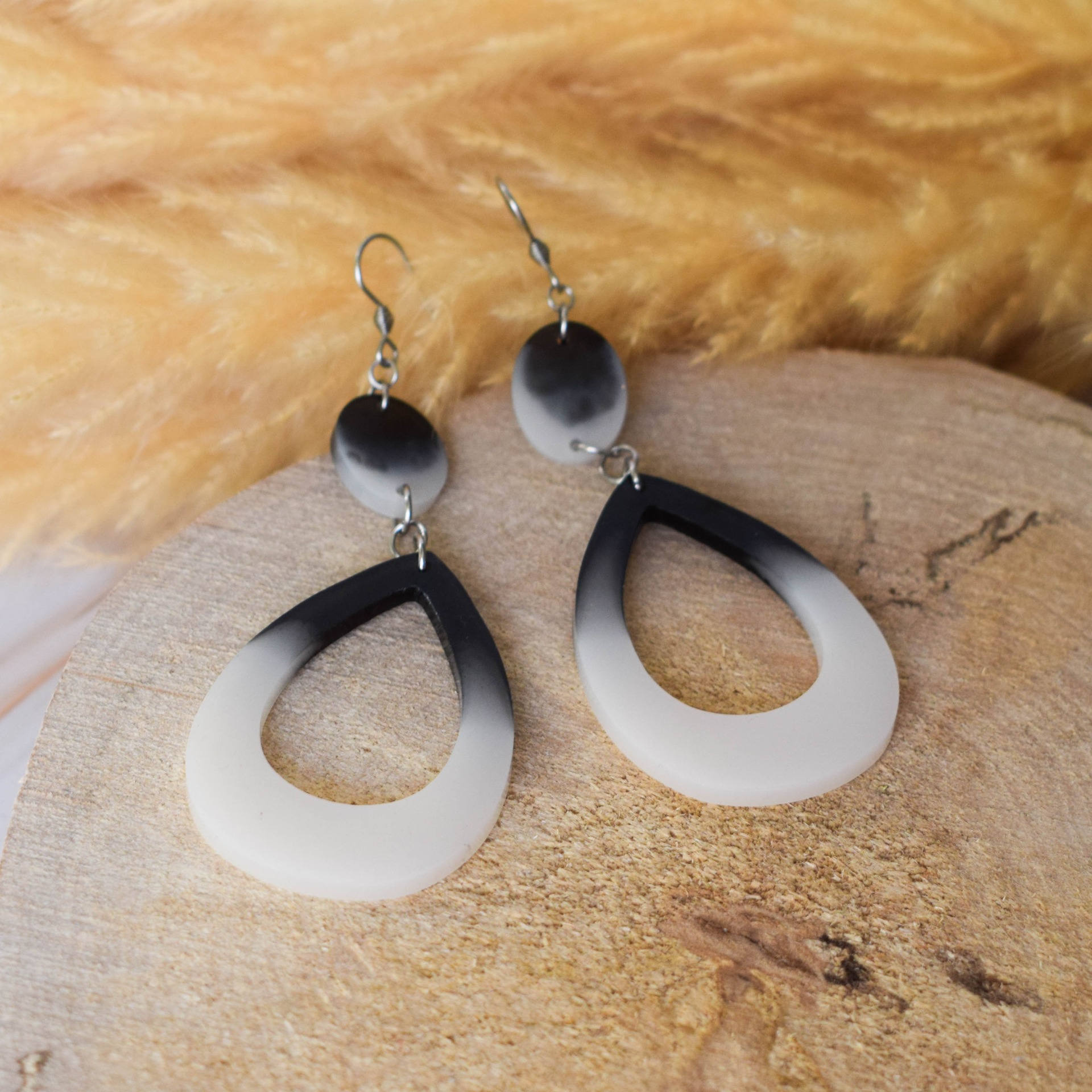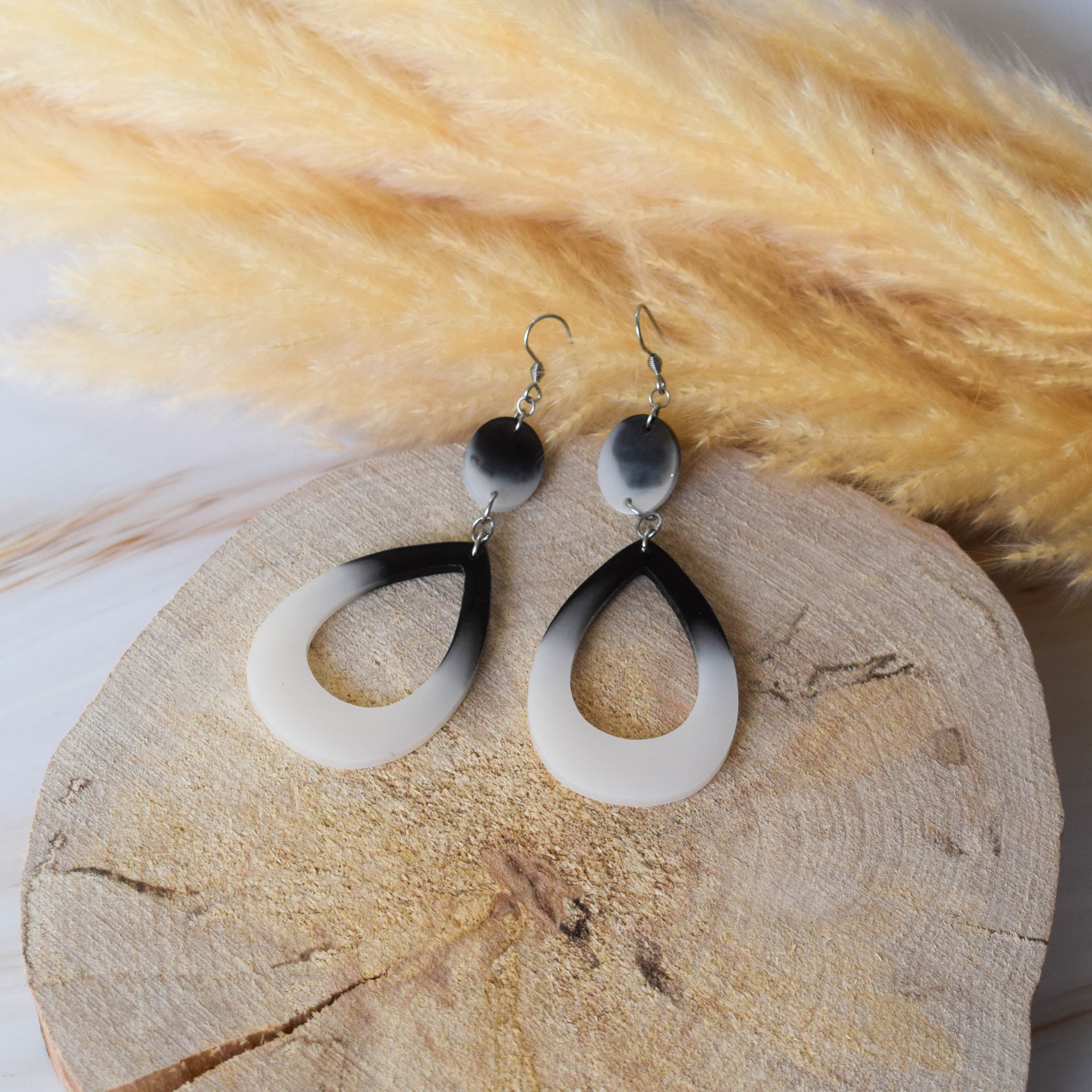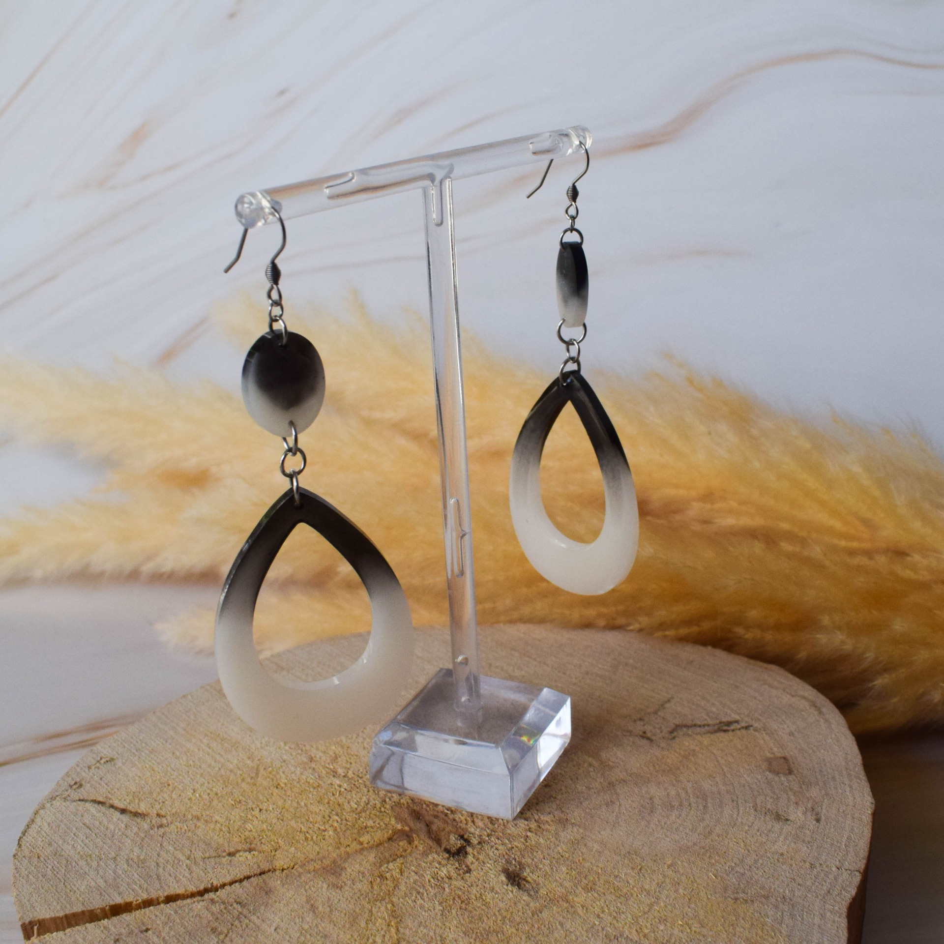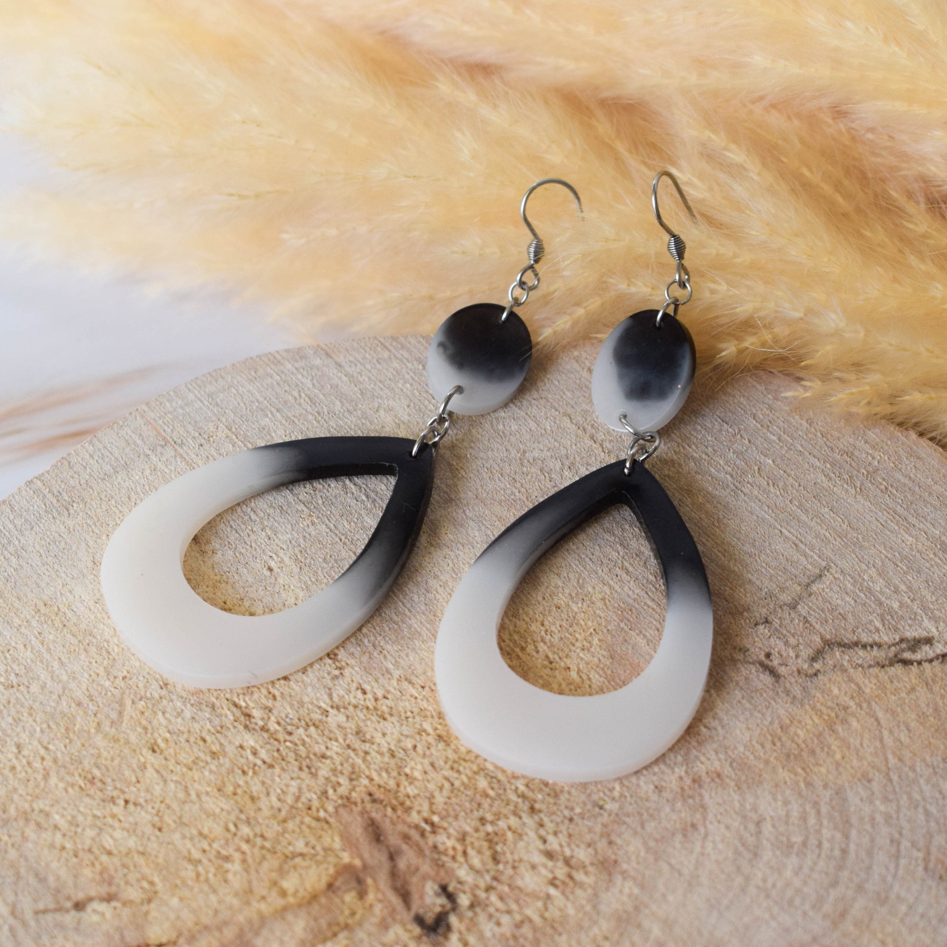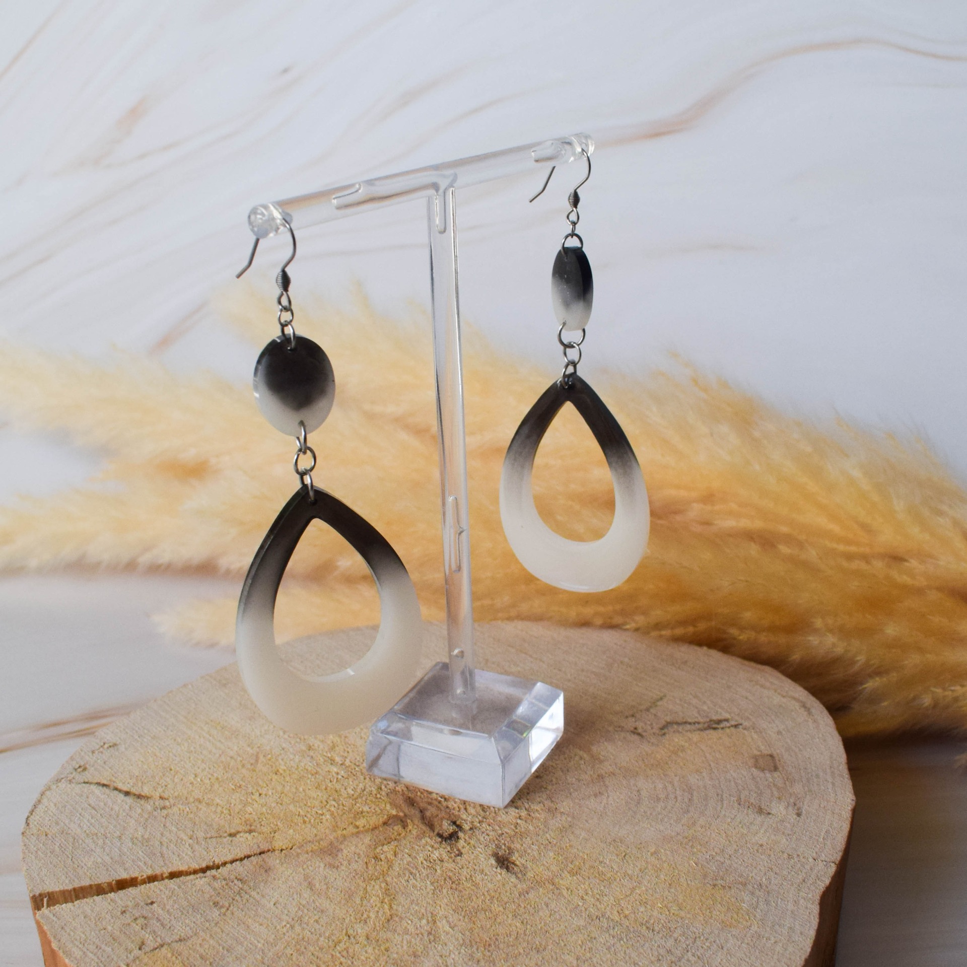 Náušnice vyrobeny z pryskyřice v černobílém designu ve tvaru slz.