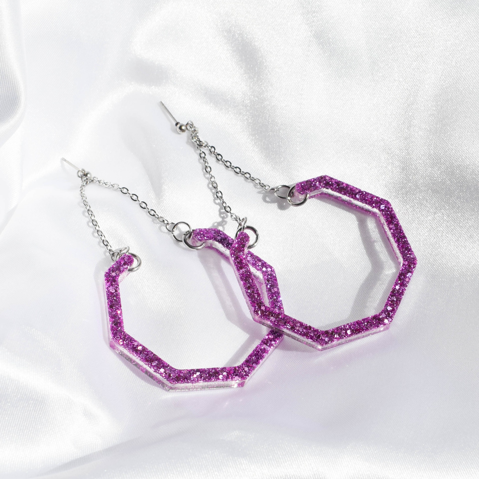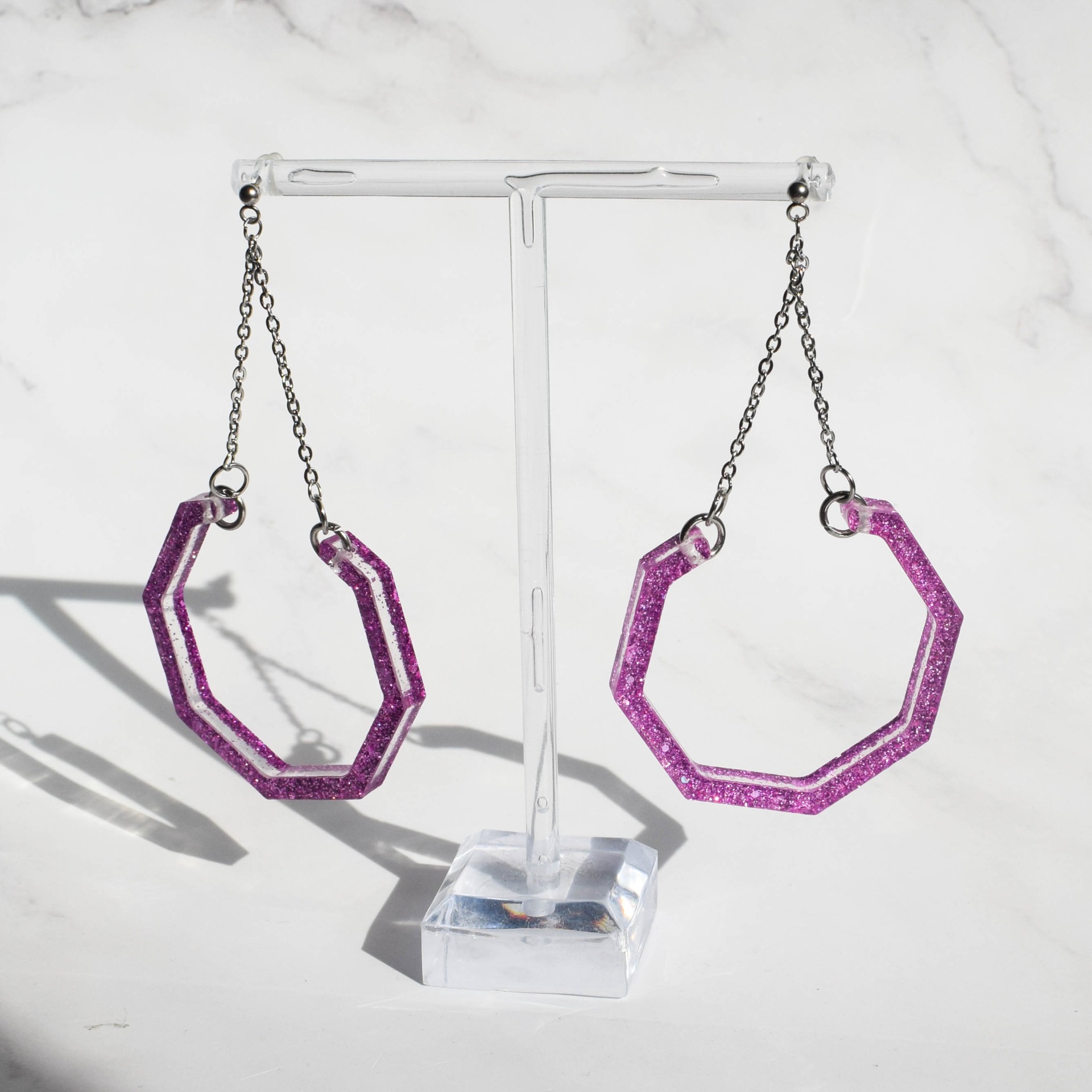 Náušnice ve tvaru oktagonu z pryskyřice v designu s fialkovými glitry. Komponenty jsou z nerezové oceli.