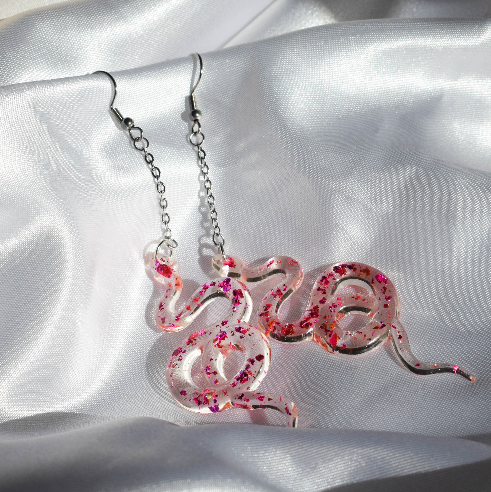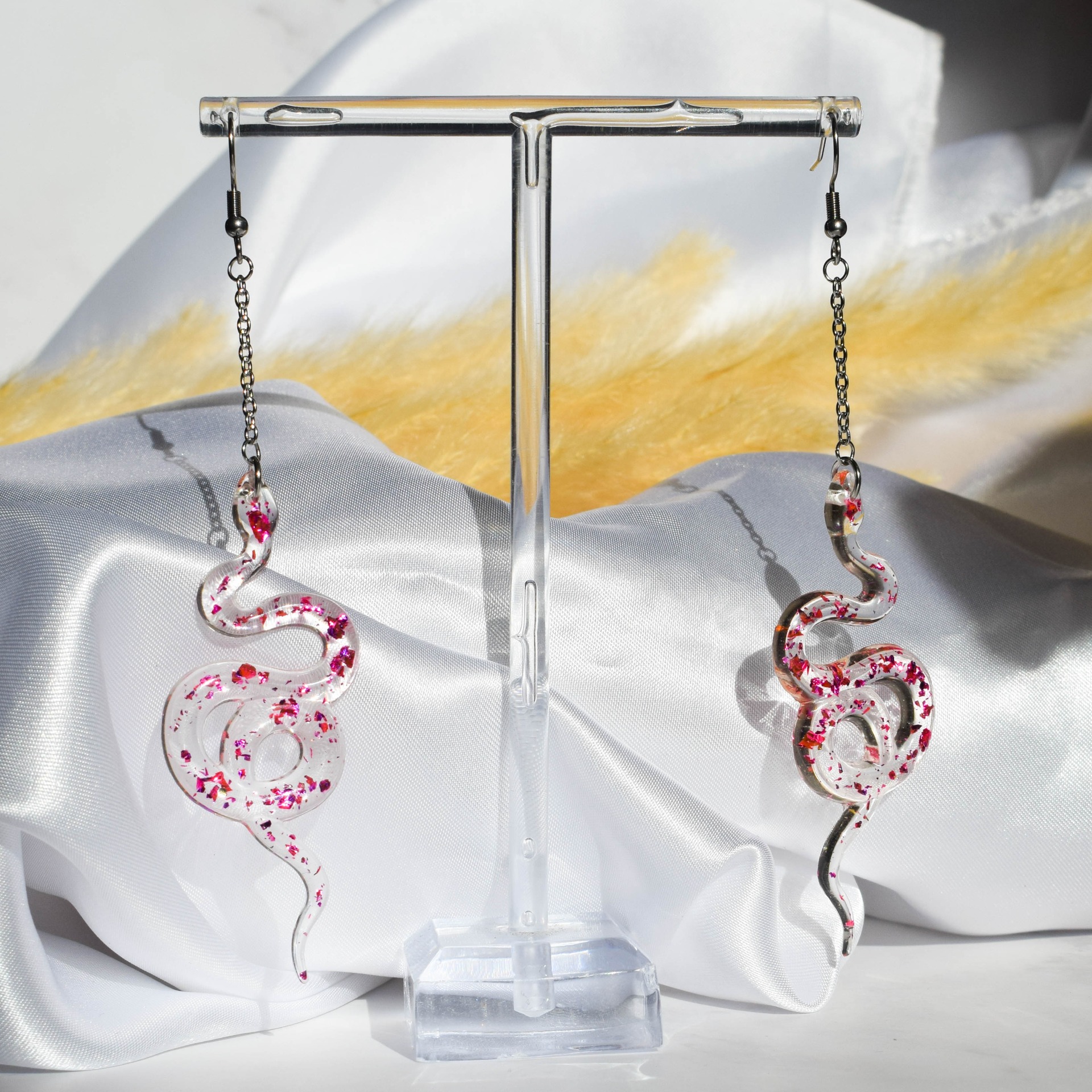 Náušnice vyrobeny z pryskyřice ve tvaru hadů v transparentním designu s fialovými plátky.