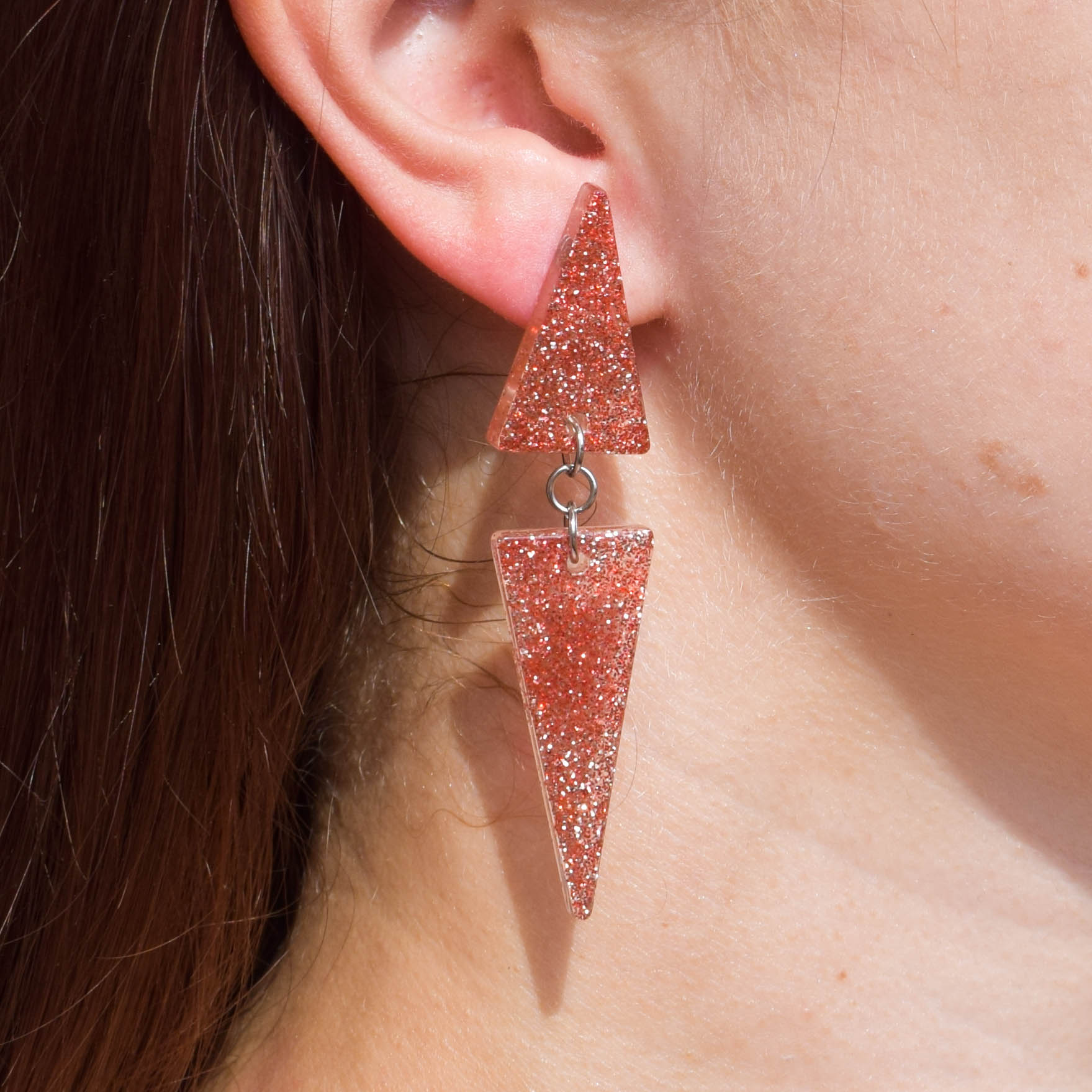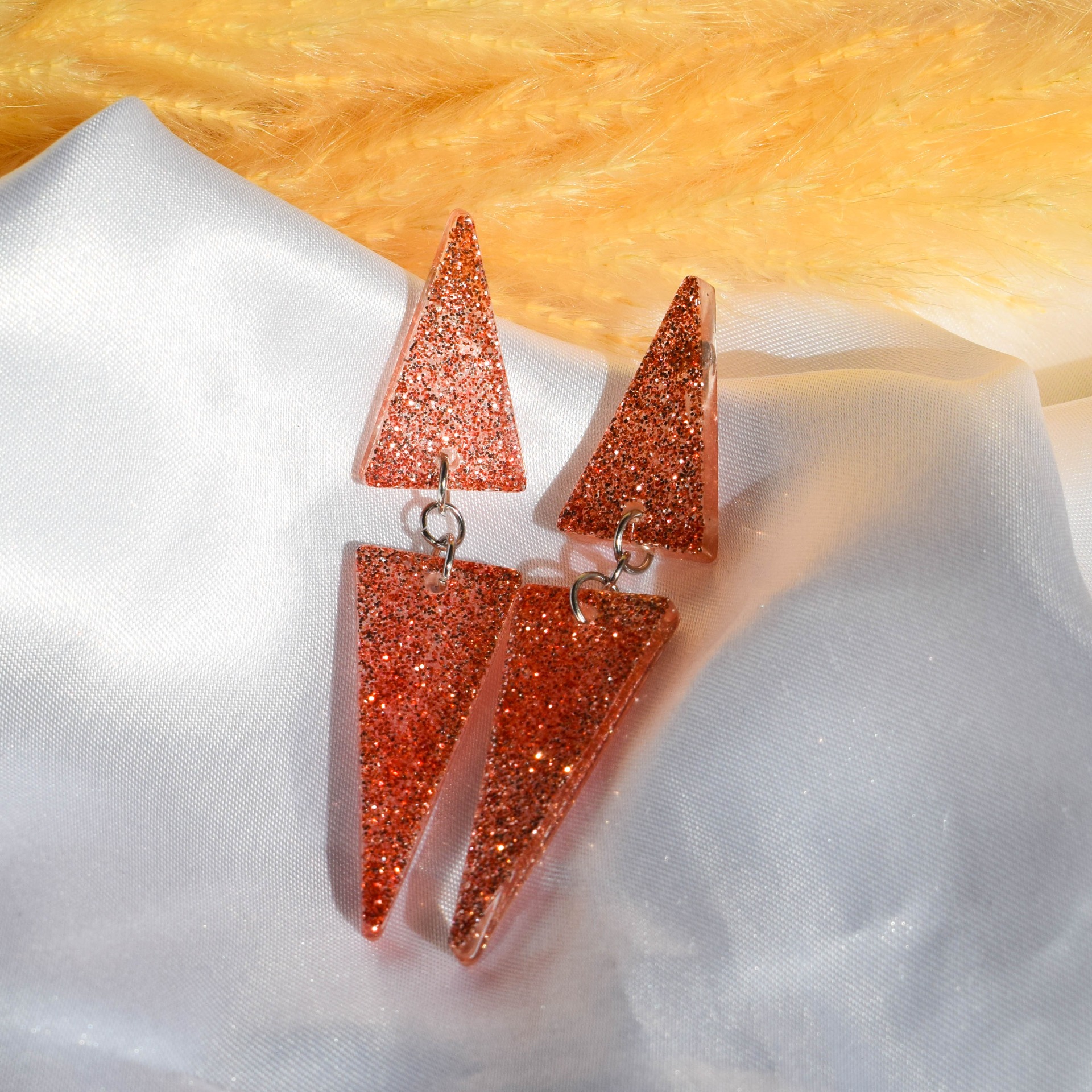Ručně vyrobené náušnice z pryskyřice ve tvaru trojúhelníku v třpytivém designu lososové barvy. Komponenty jsou z nerezové oceli.