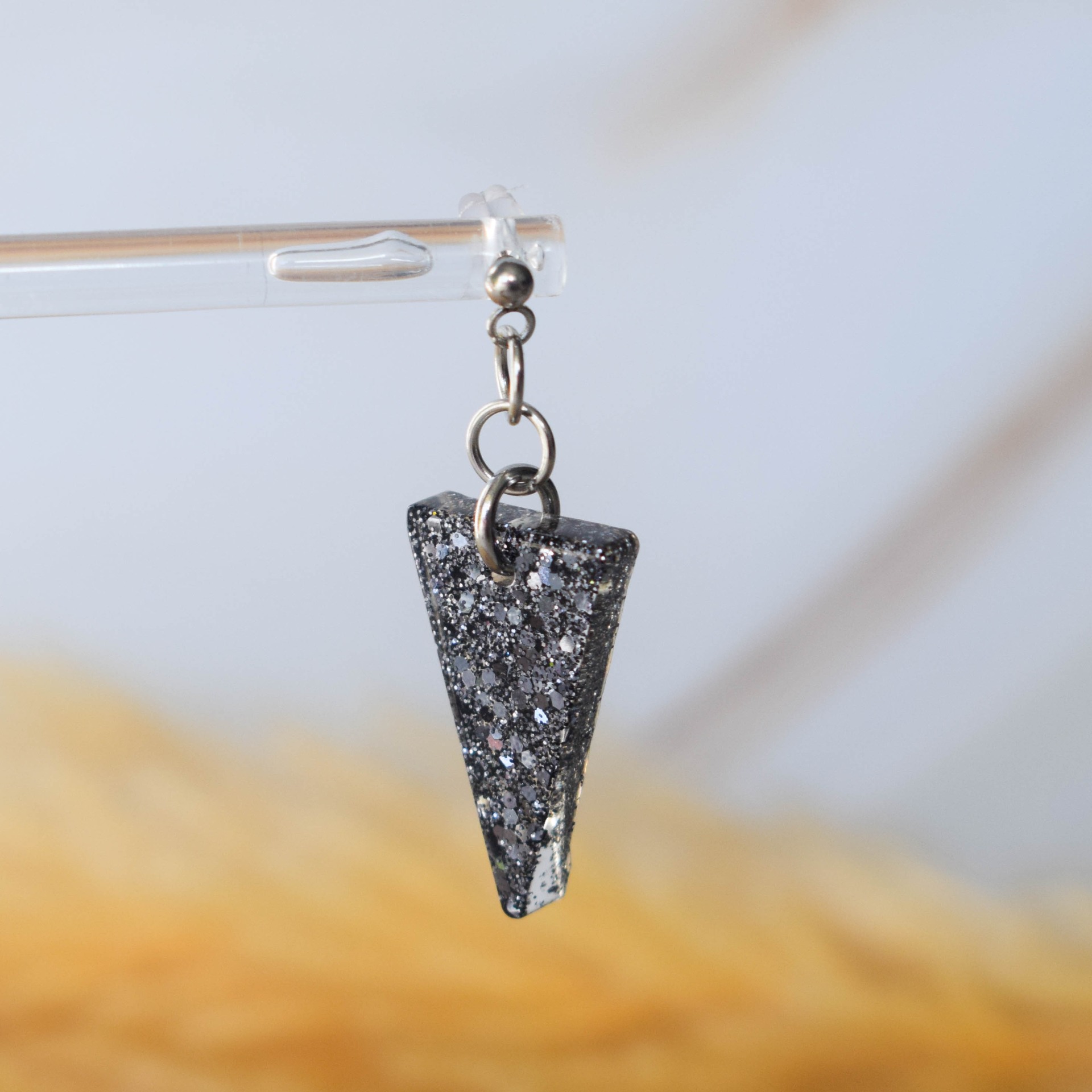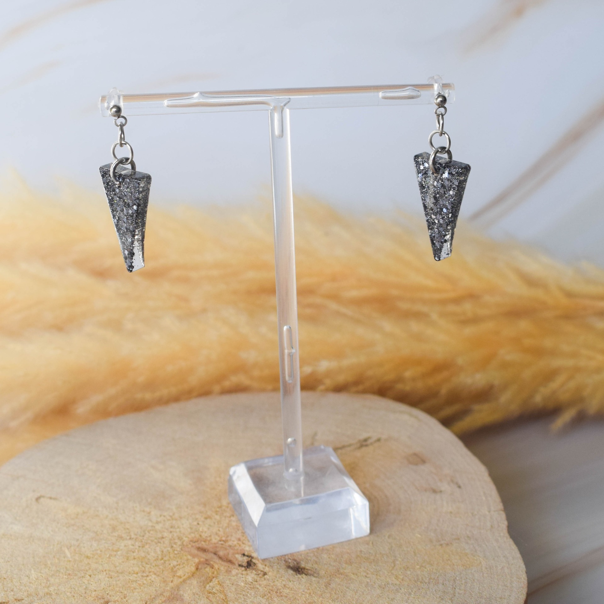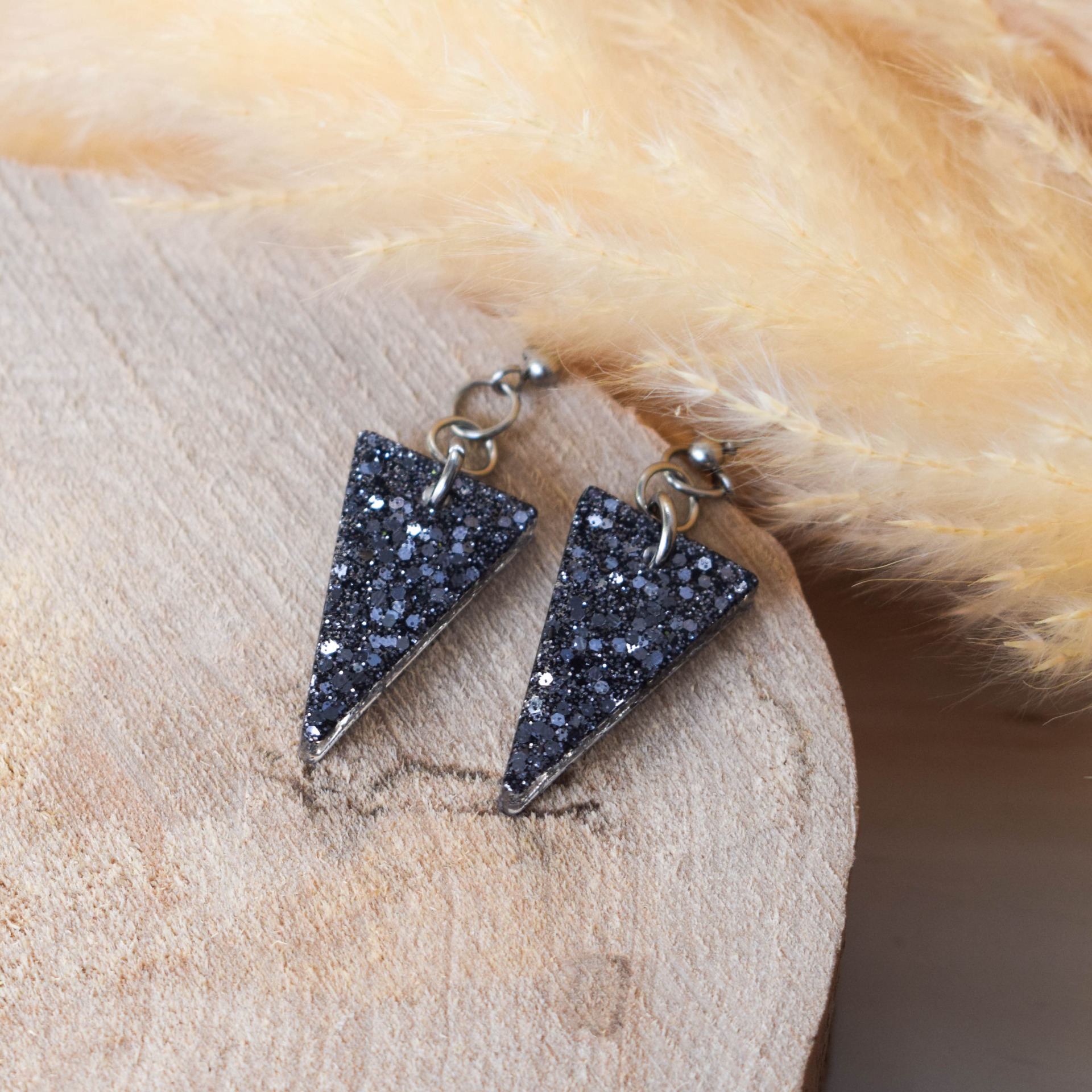 Náušnice z pryskyřice ve tvaru trojúhelníků v designu antracitových třpytek. Komponenty jsou z chirurgické oceli.