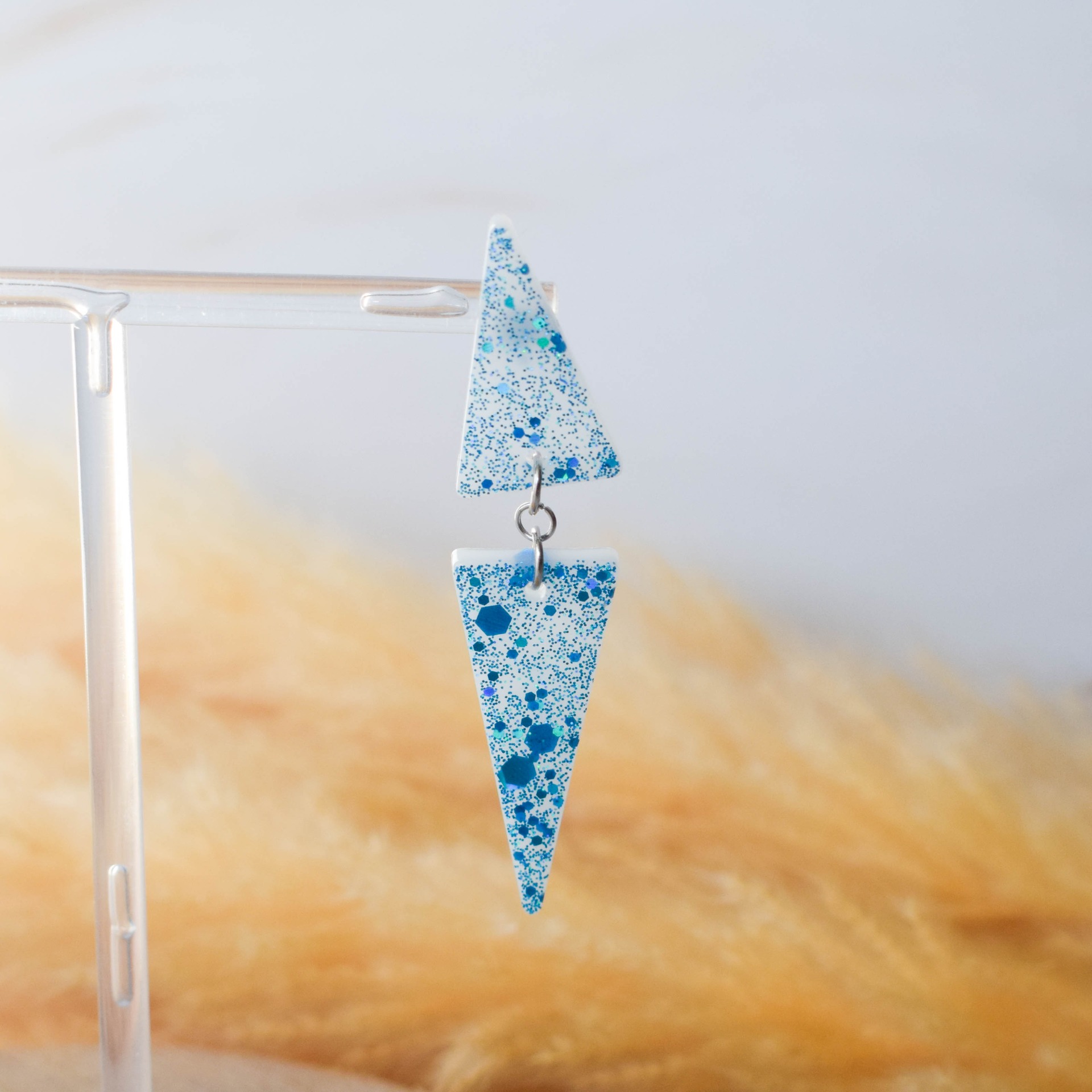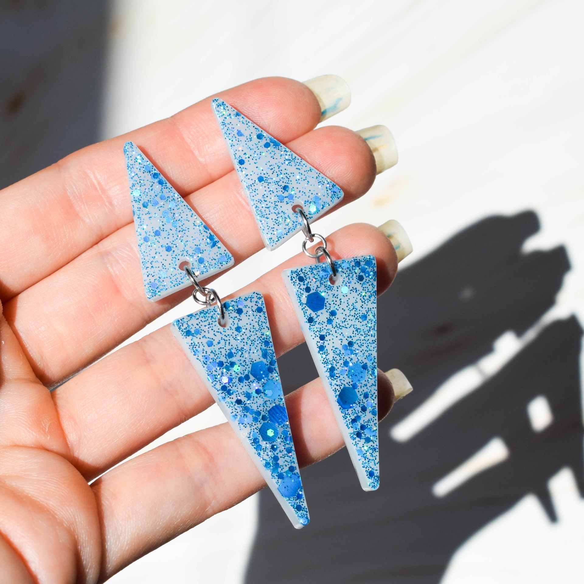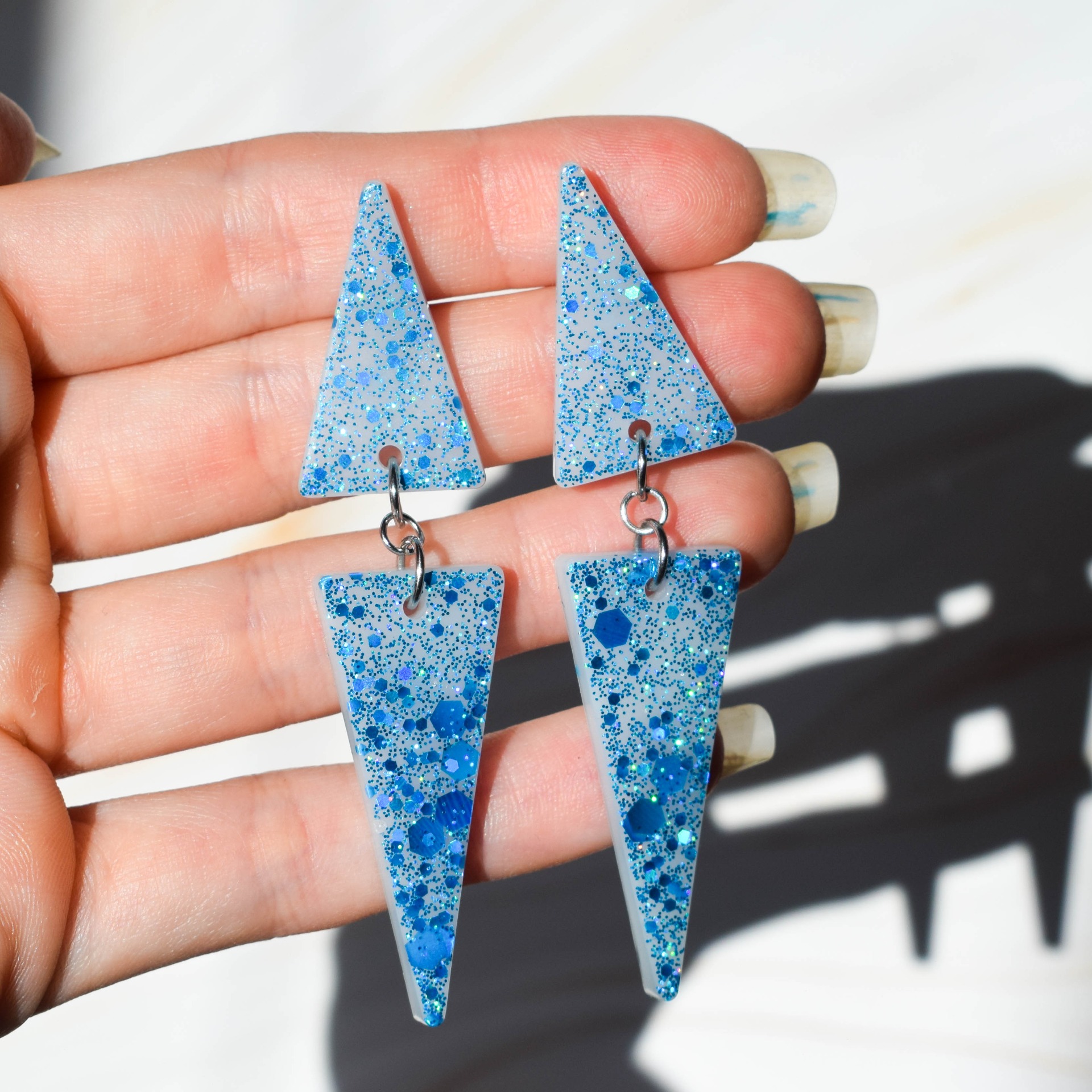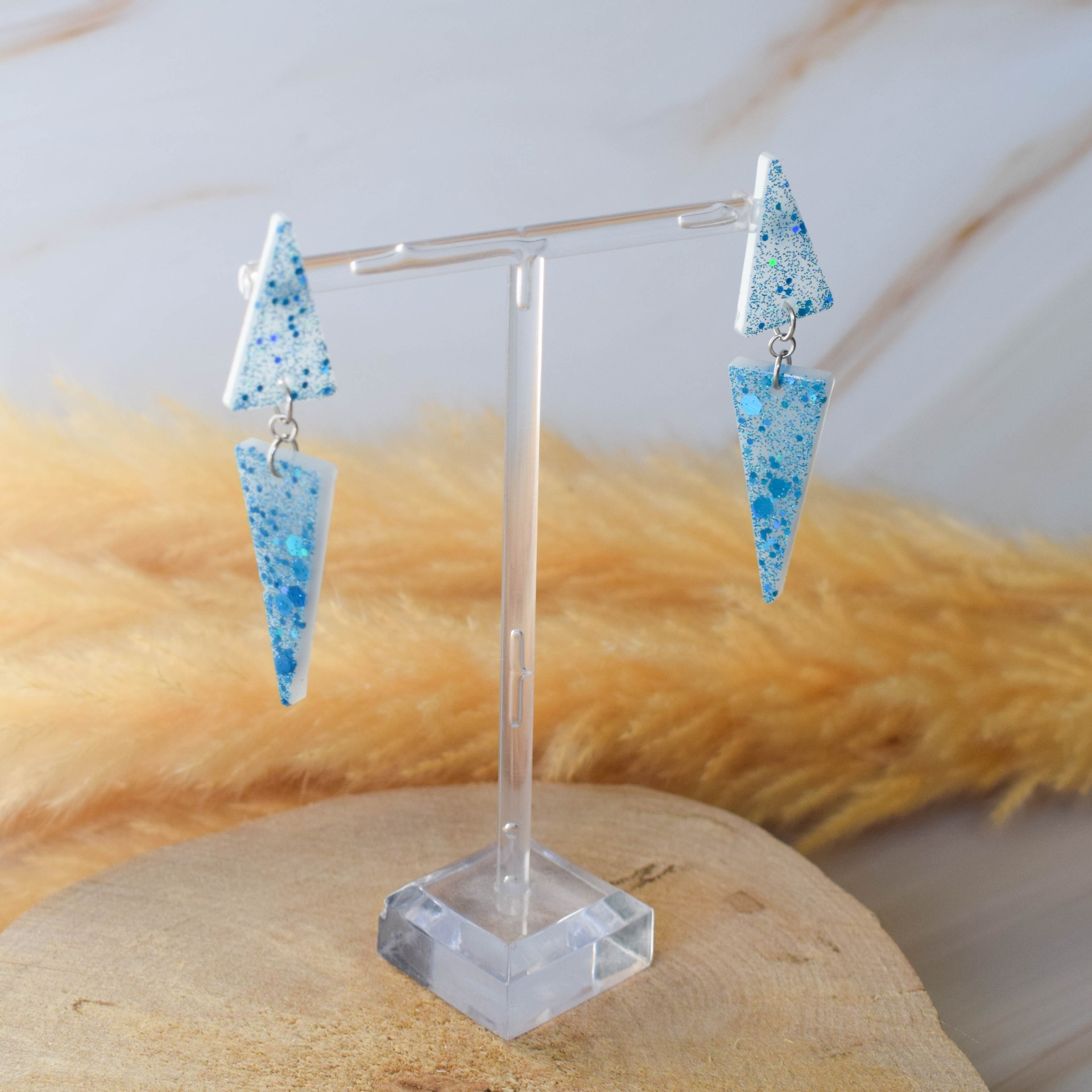 Ručně vyrobené náušnice z pryskyřice ve tvaru trojúhelníku v třpytivém designu s modrými holografickými glitry a bílým pozadím. Komponenty jsou z nerezové oceli.