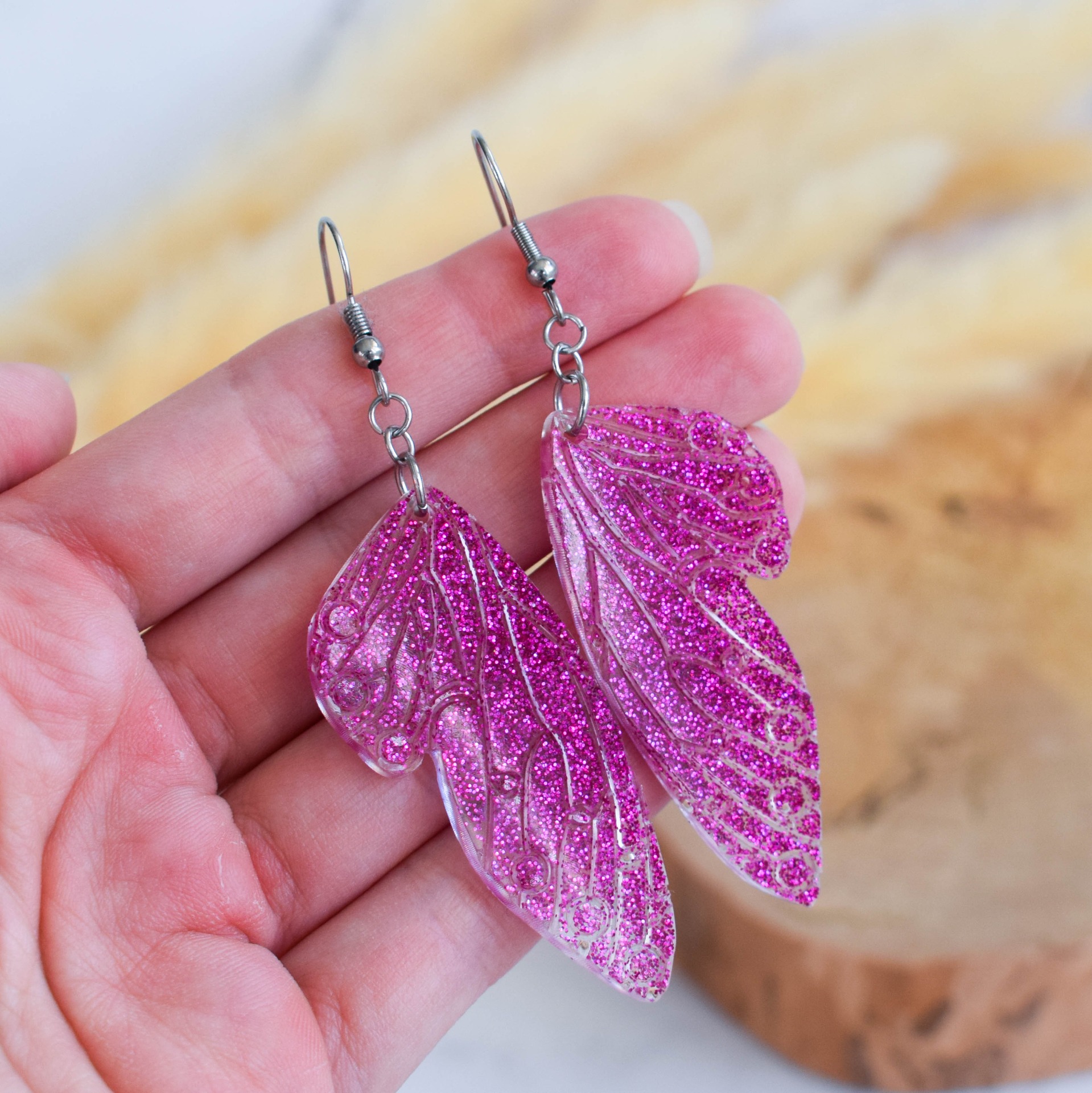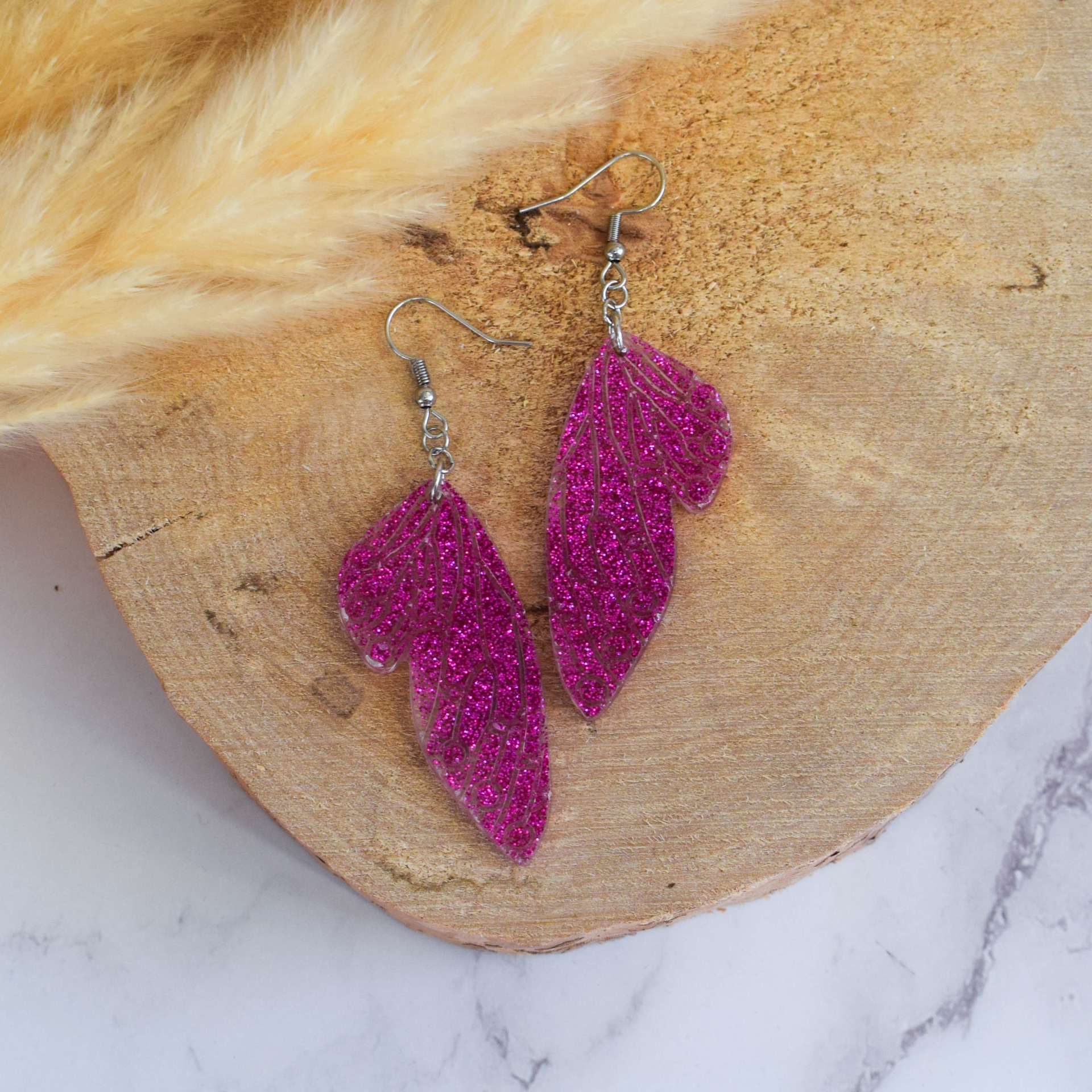 Náušnice z epoxidové pryskyřice ve tvaru motýlích křídel, v designu růžových třpytek. Komponenty jsou z nerezové oceli, řetízek je z bižuterního kovu.
