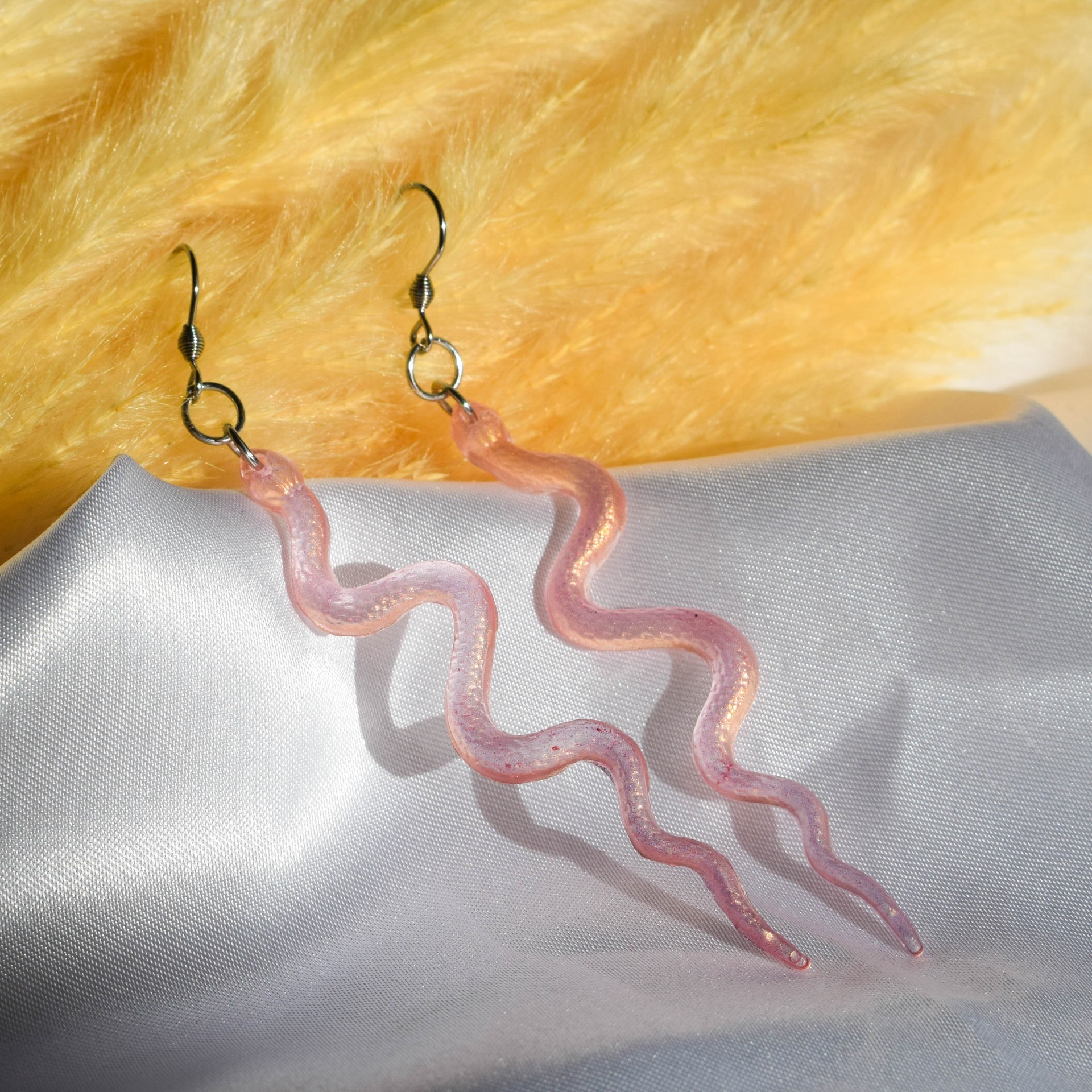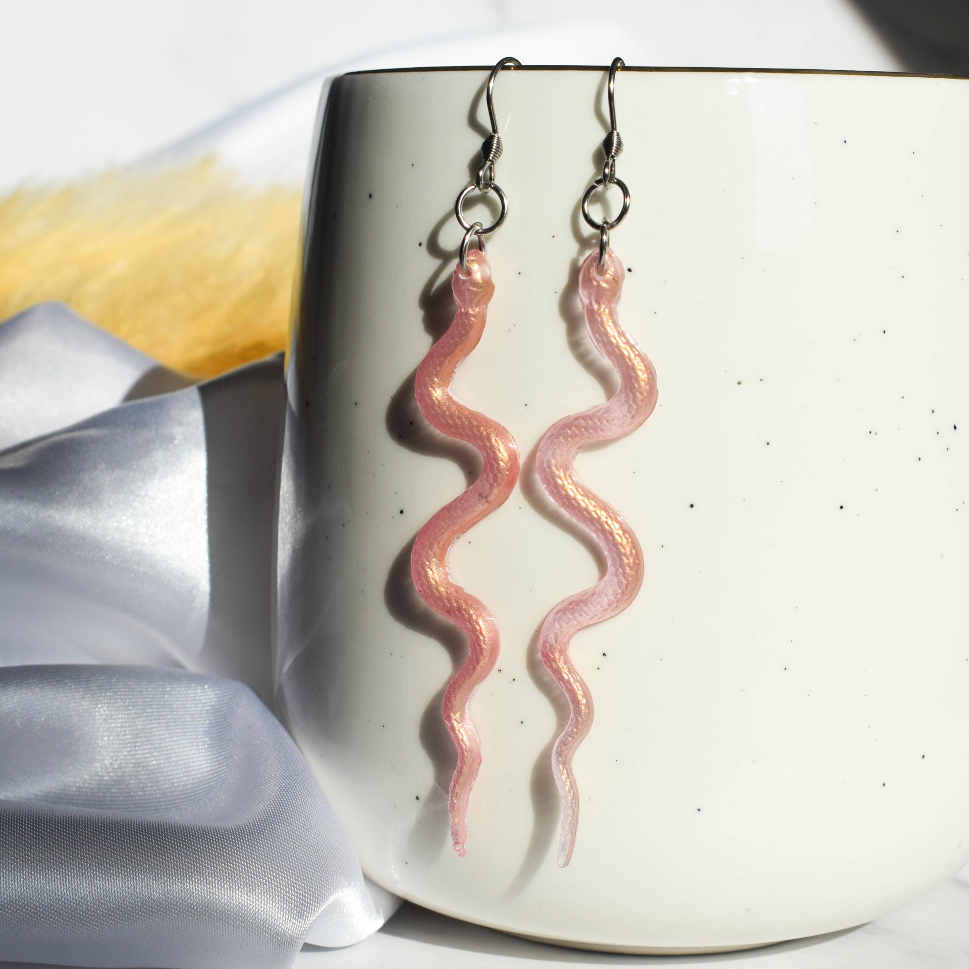 Náušnice vyrobeny z pryskyřice ve tvaru hadů v růžové barvě s jemným duochromatickým efektem.