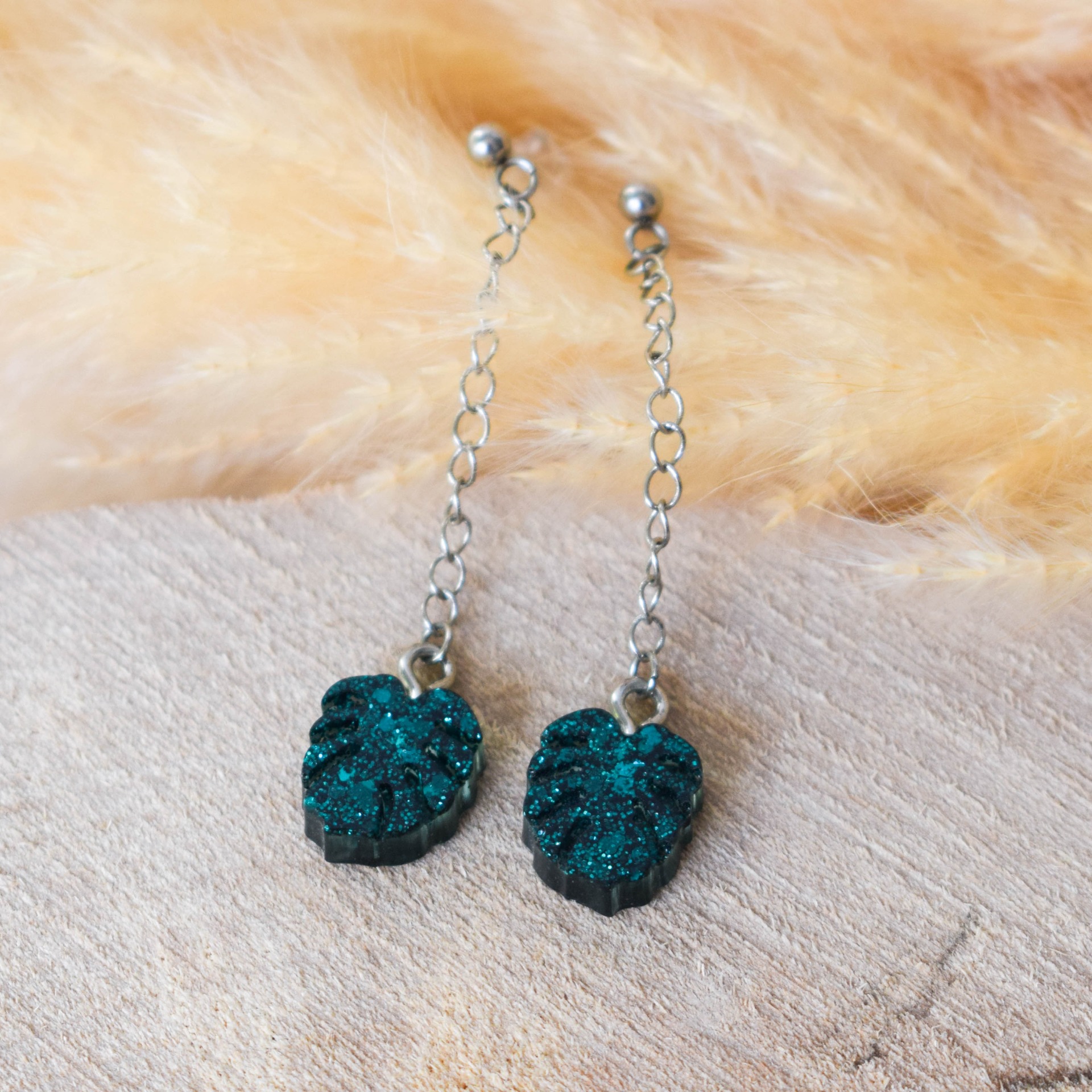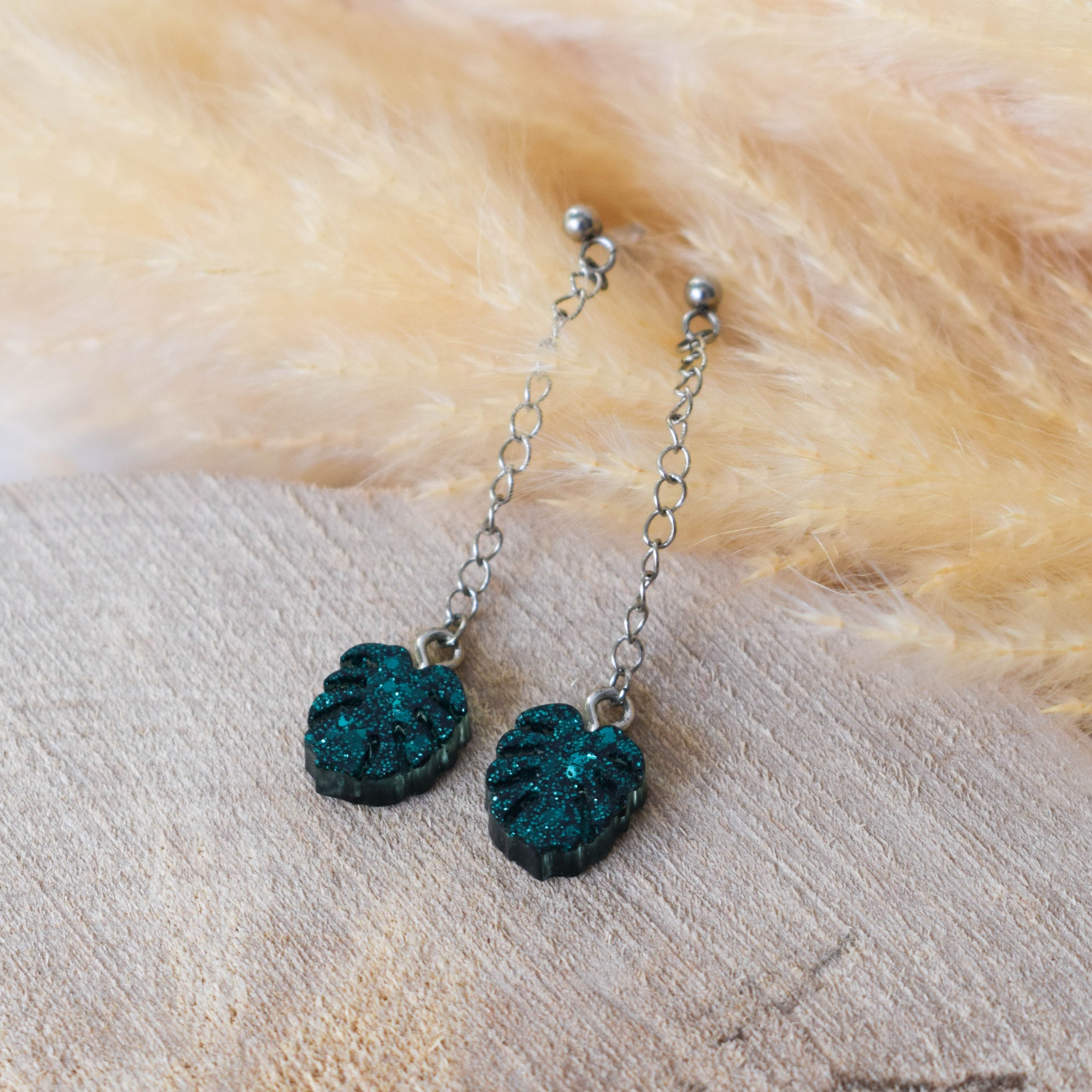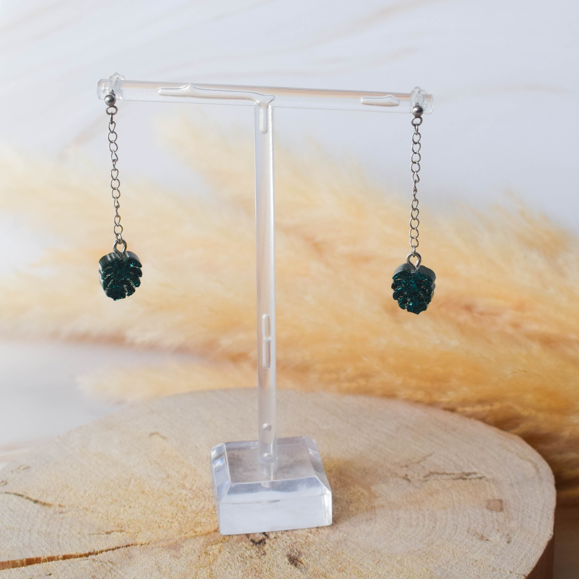 Ručně vyrobené náušnice z pryskyřice v třpytivém tmavě zeleném designu.