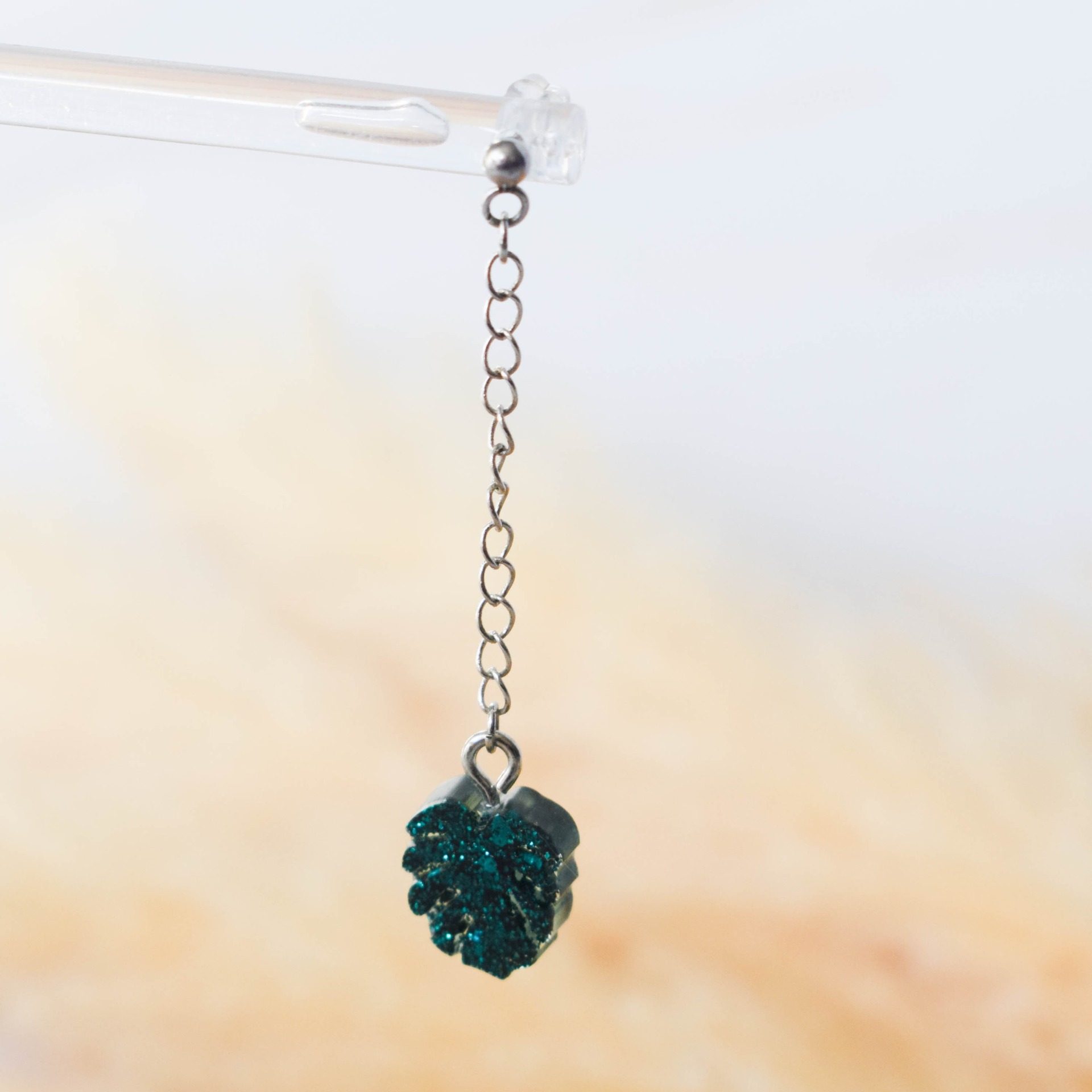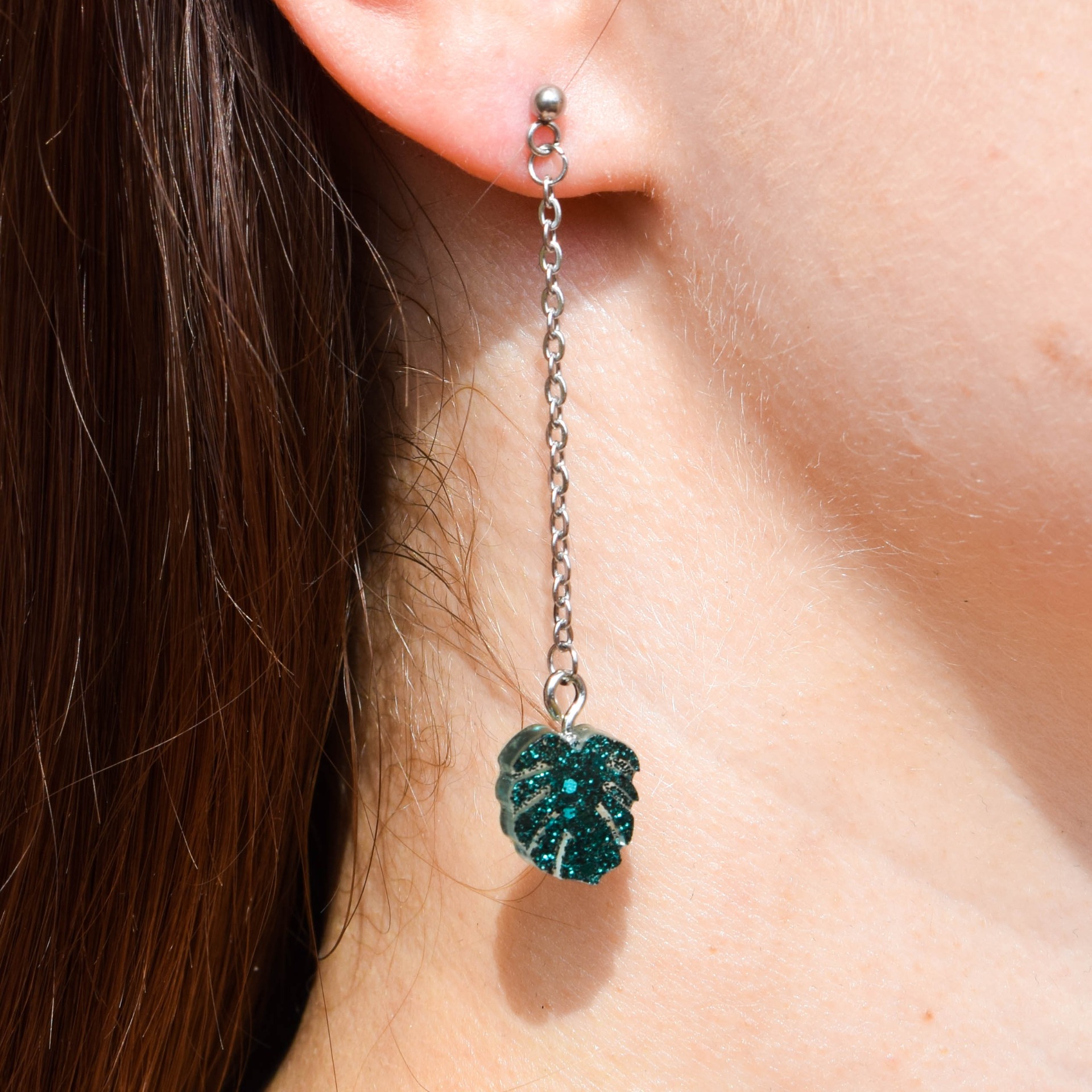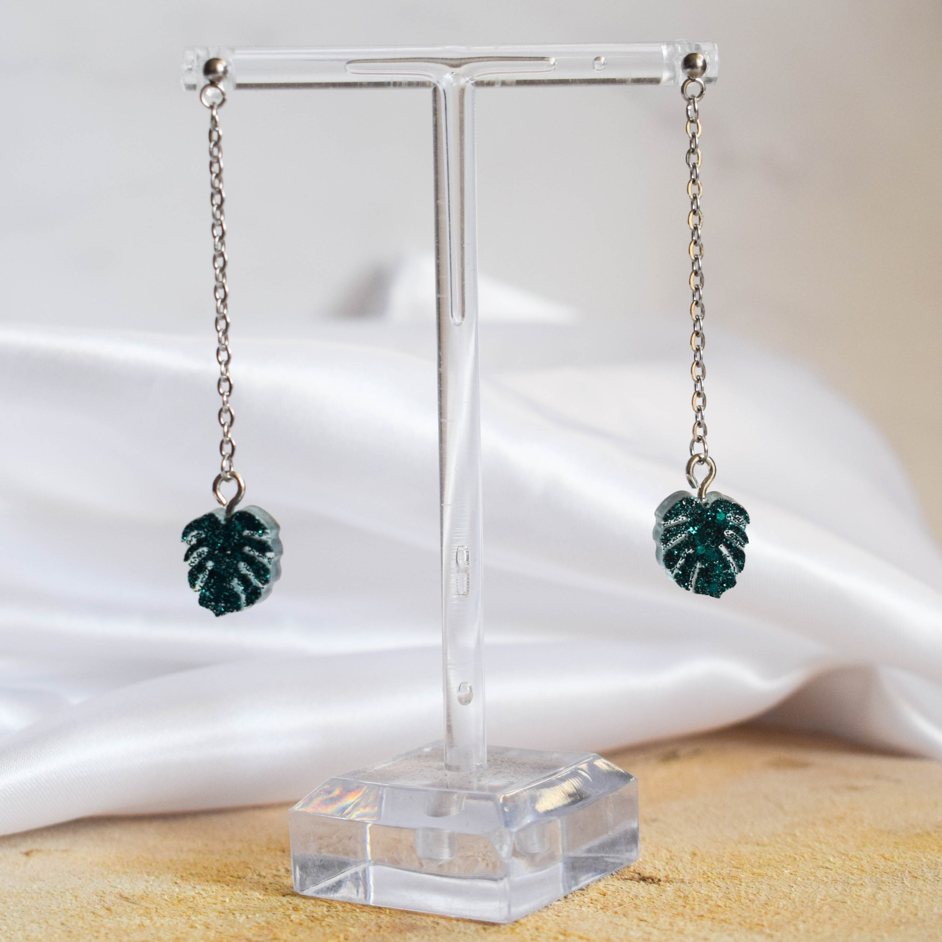 Ručně vyrobené náušnice z pryskyřice v třpytivém tmavě zeleném designu.