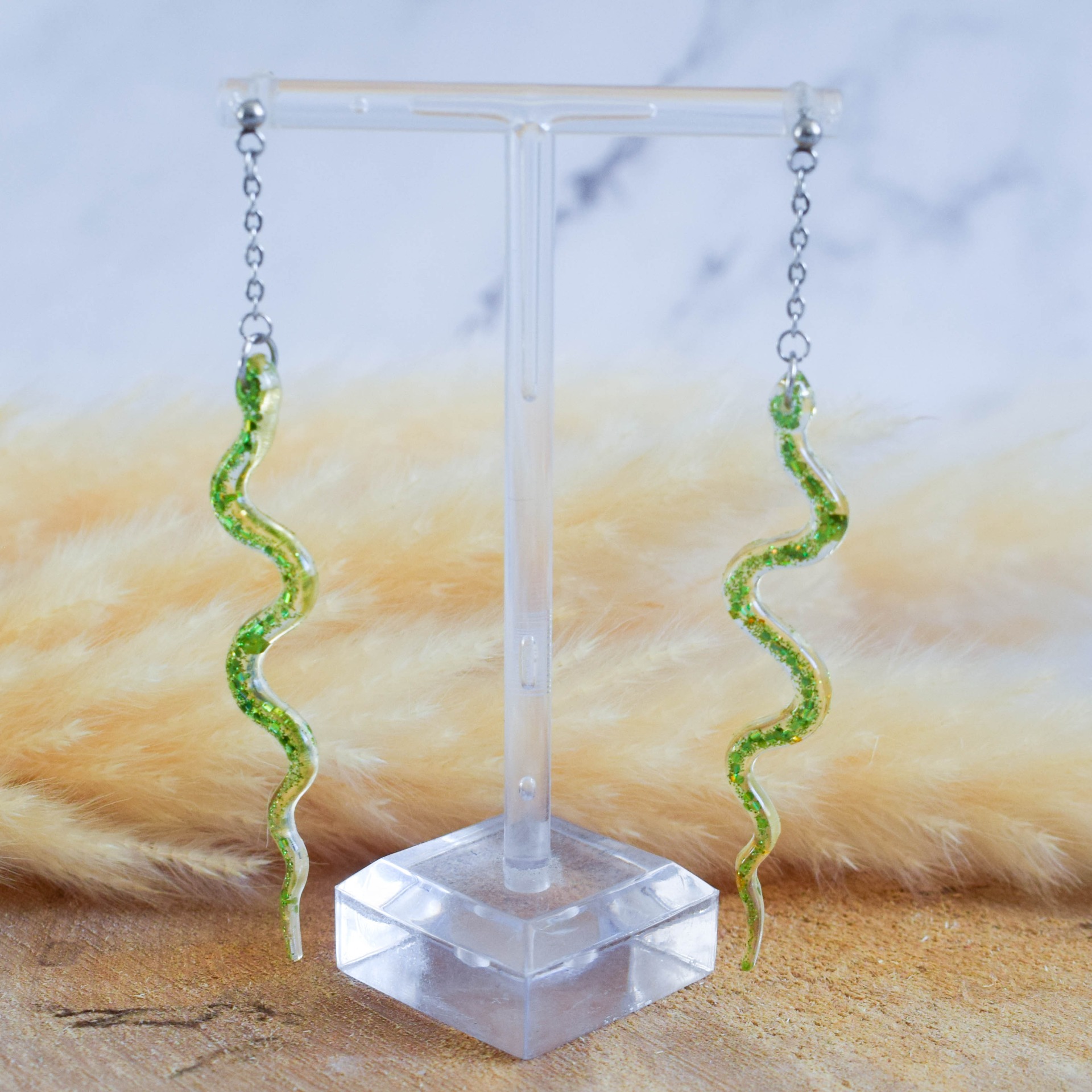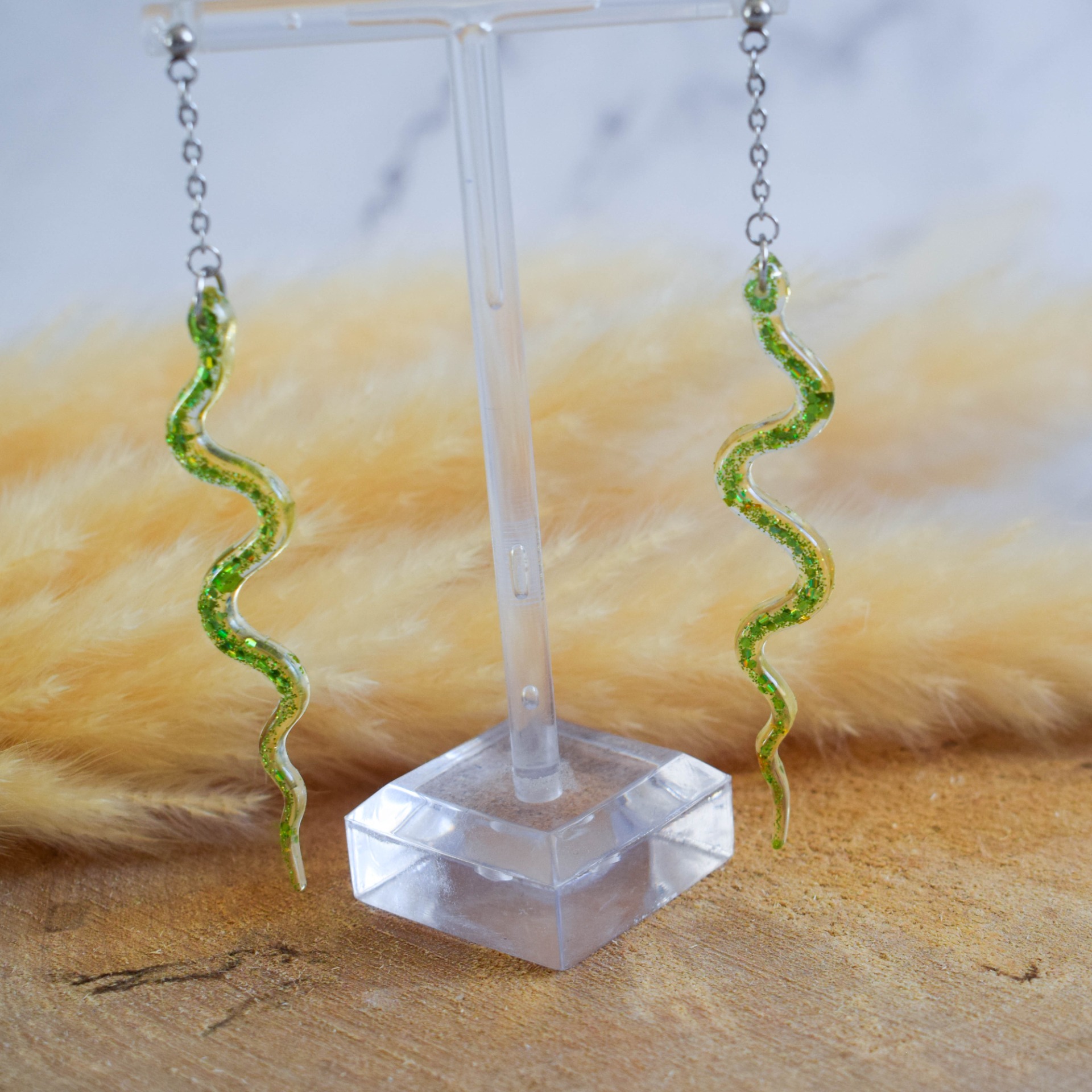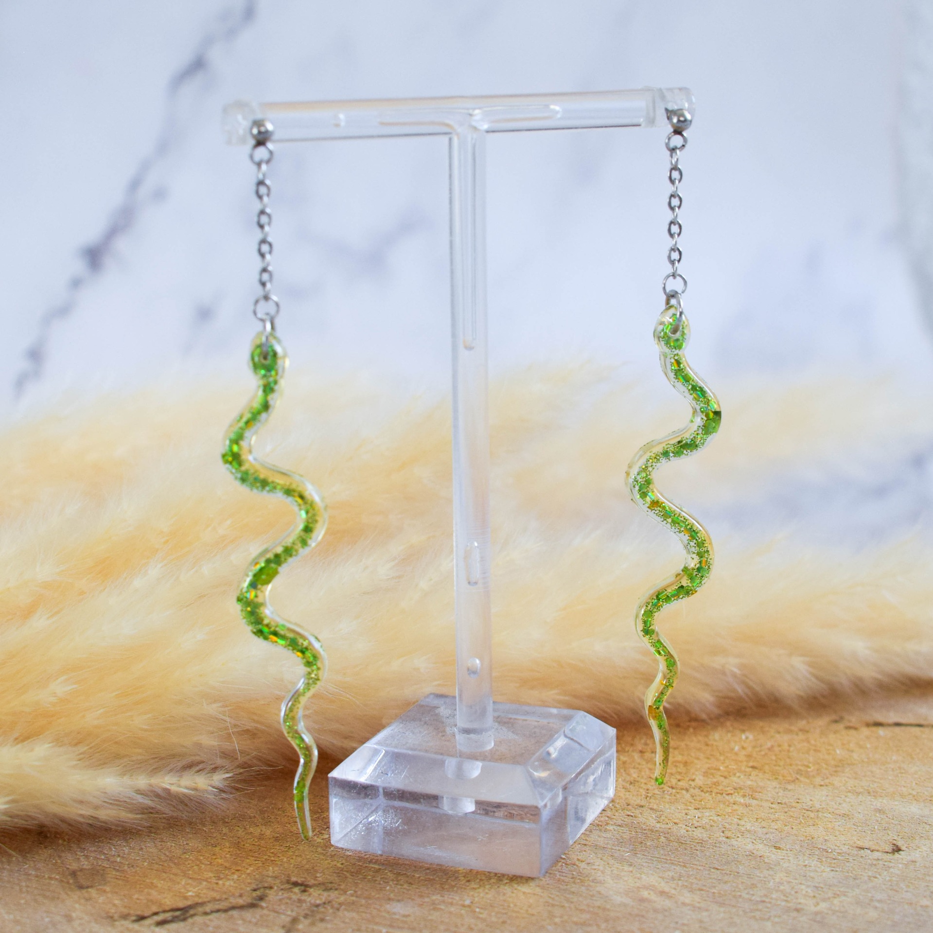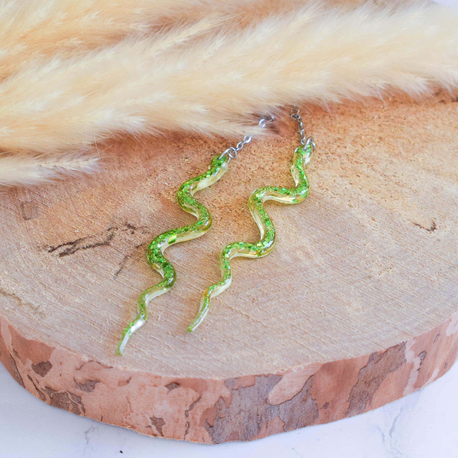 Ručně vyrobené náušnice ve tvaru hadů se zelenými holografickými glitry.