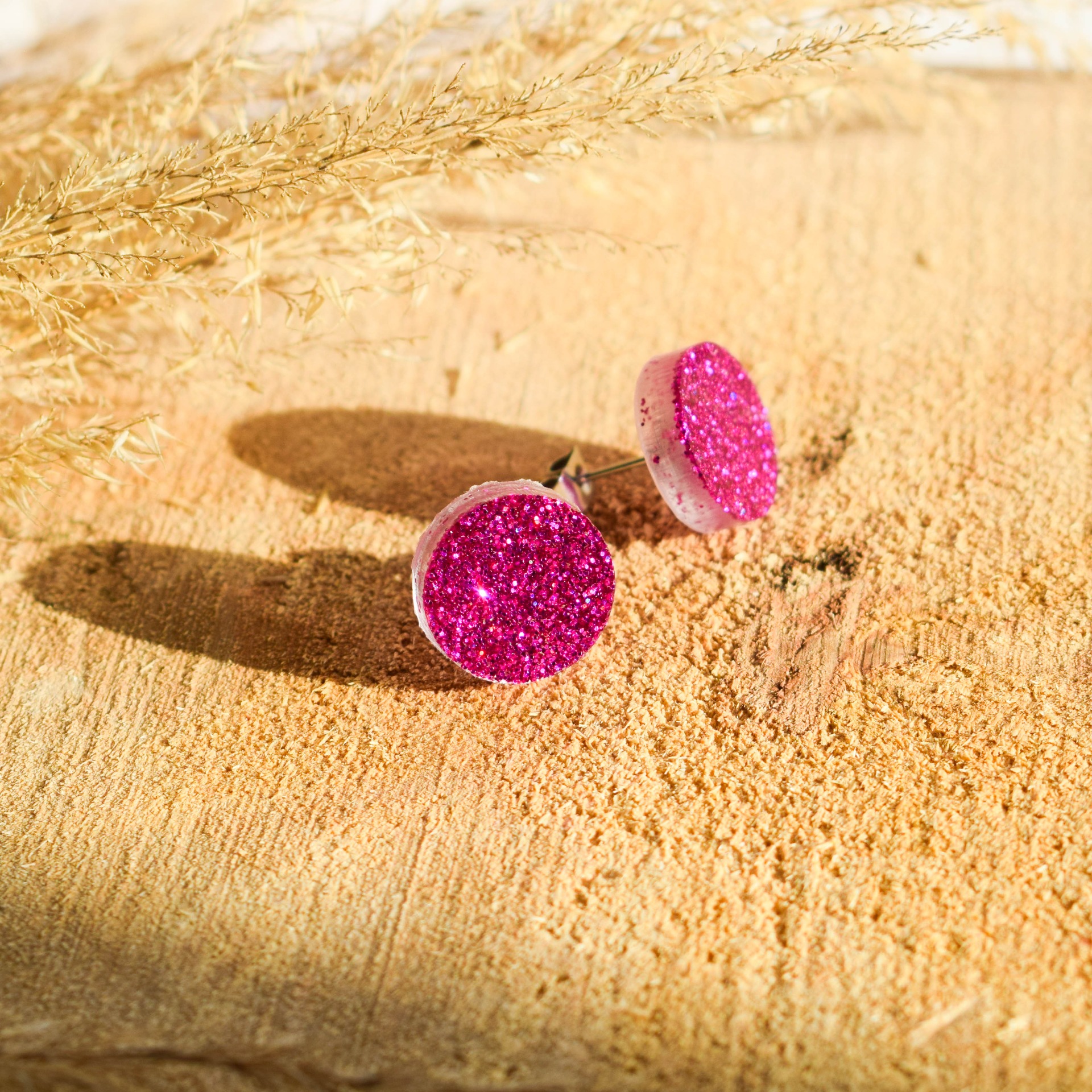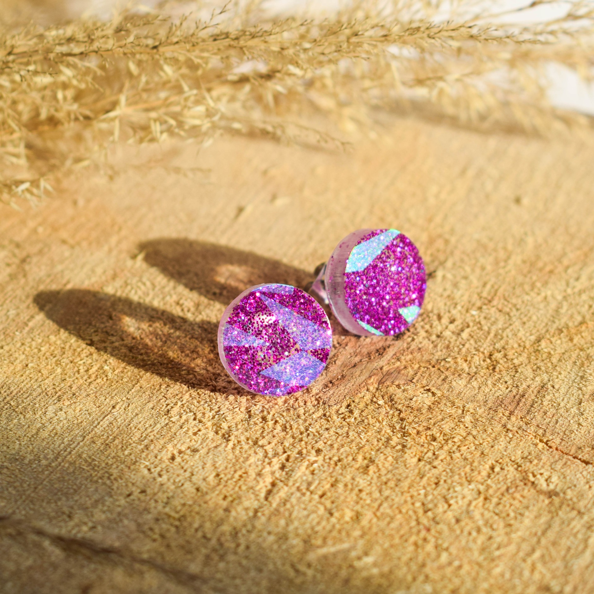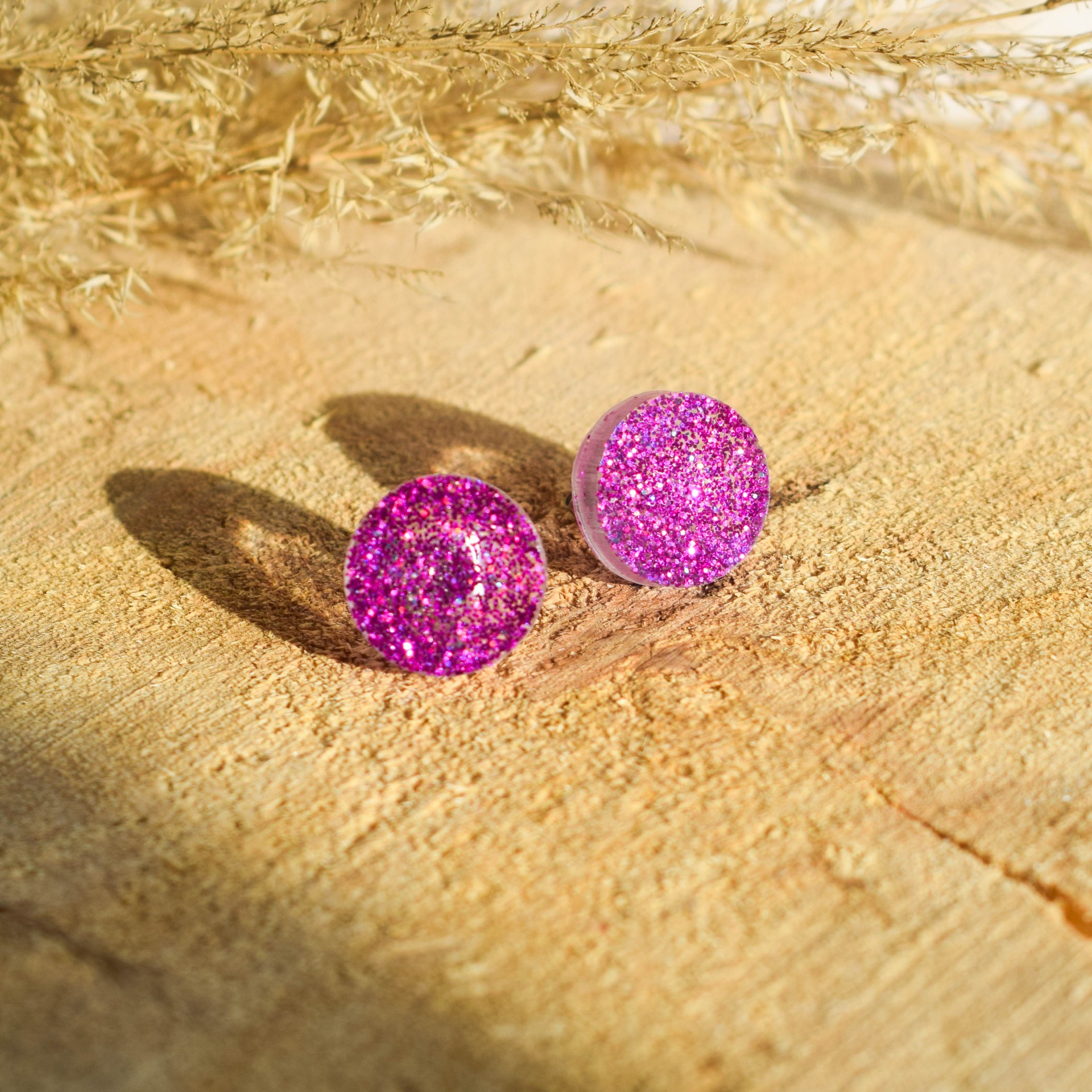 Ručně vyráběné náušnice z epoxidové pryskyřice v designu růžových třpytek.
