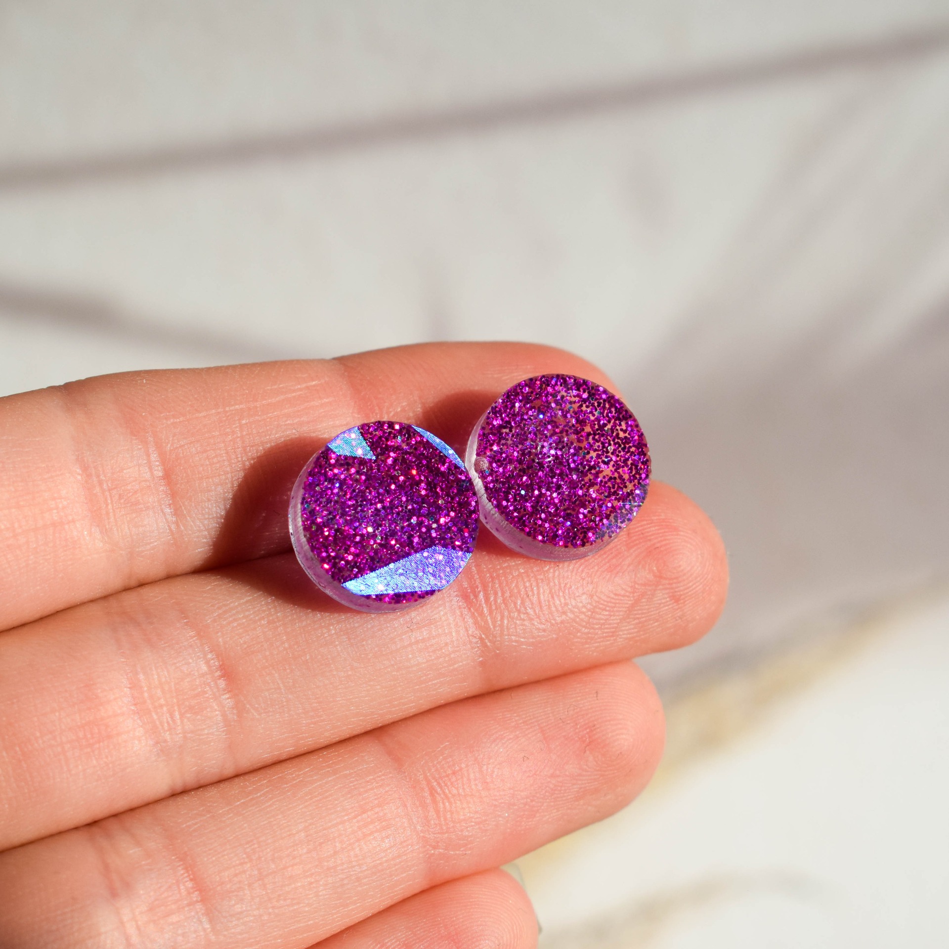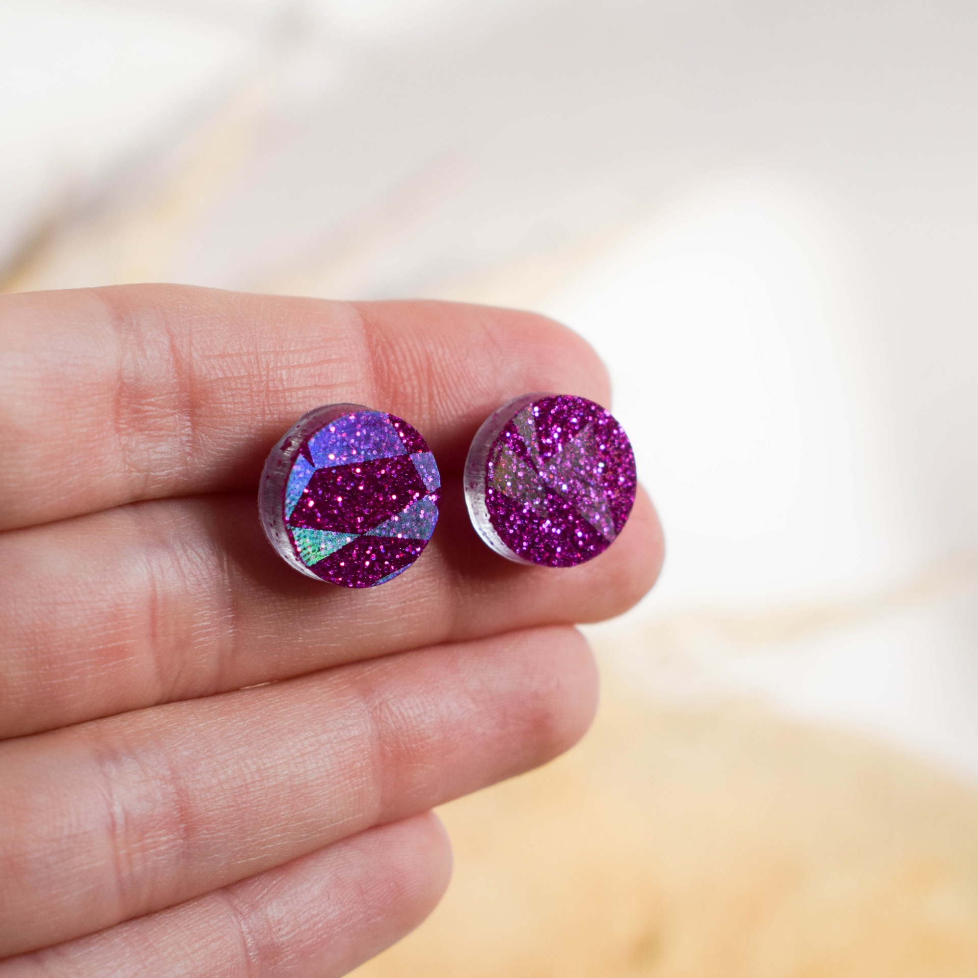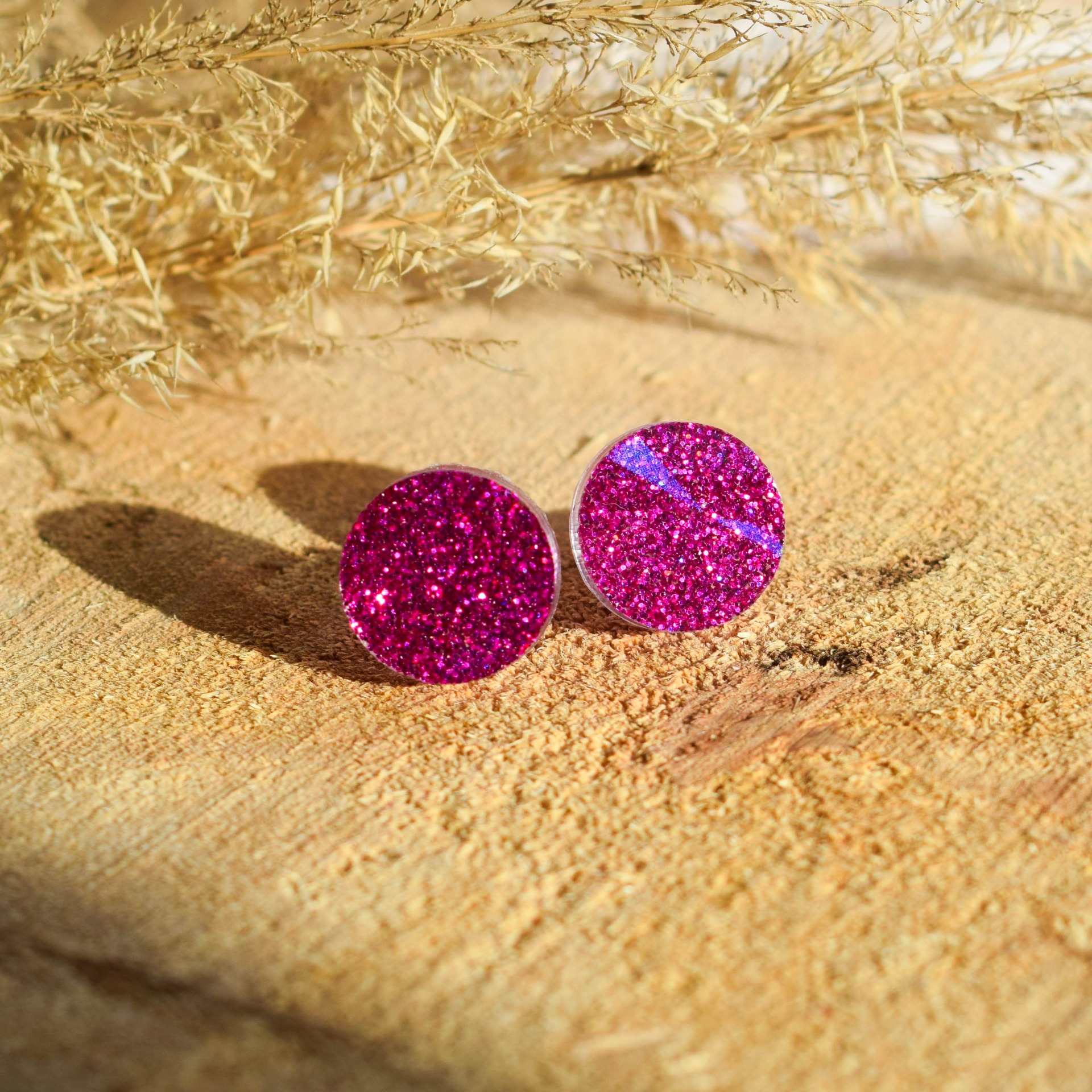 Ručně vyráběné náušnice z epoxidové pryskyřice v designu růžových třpytek.