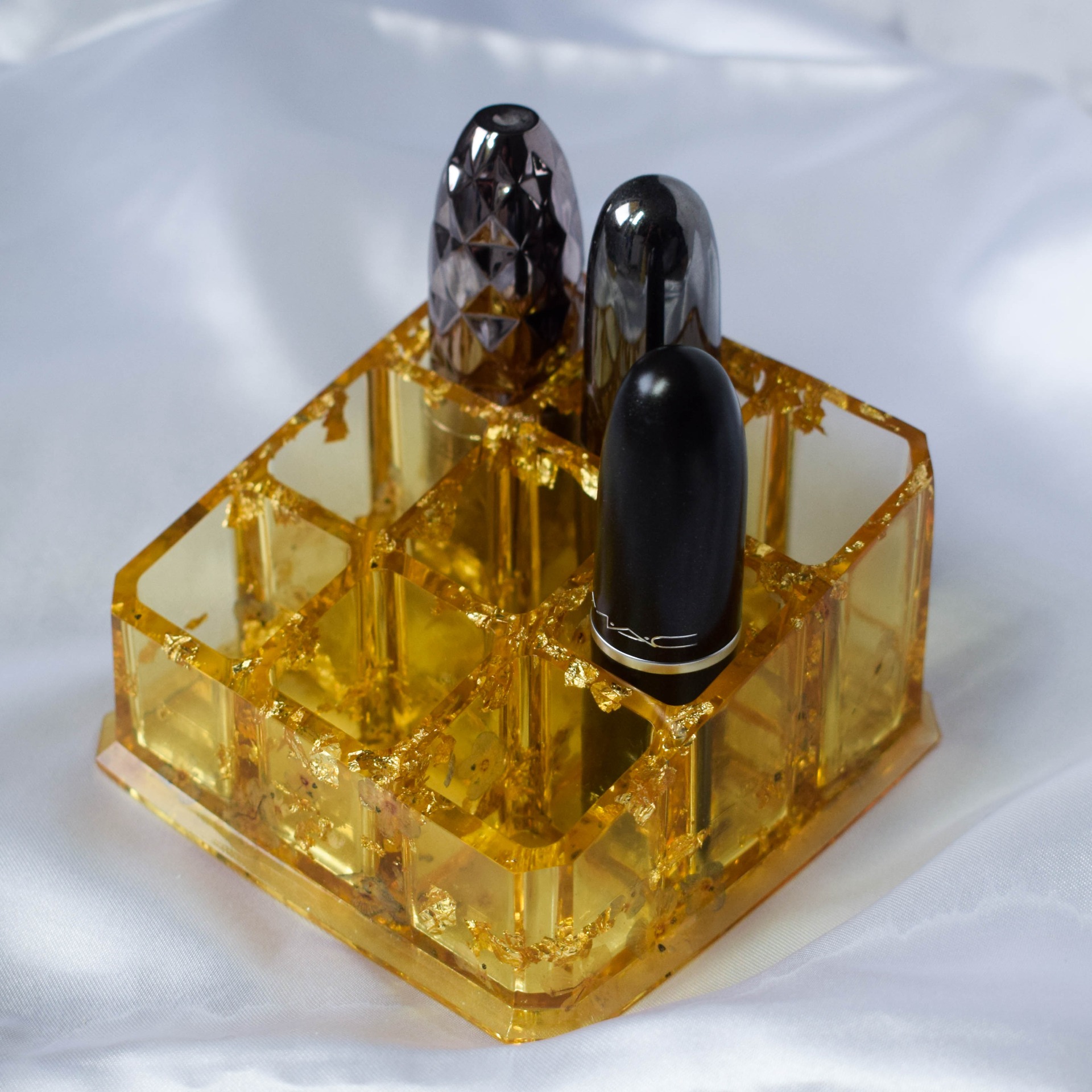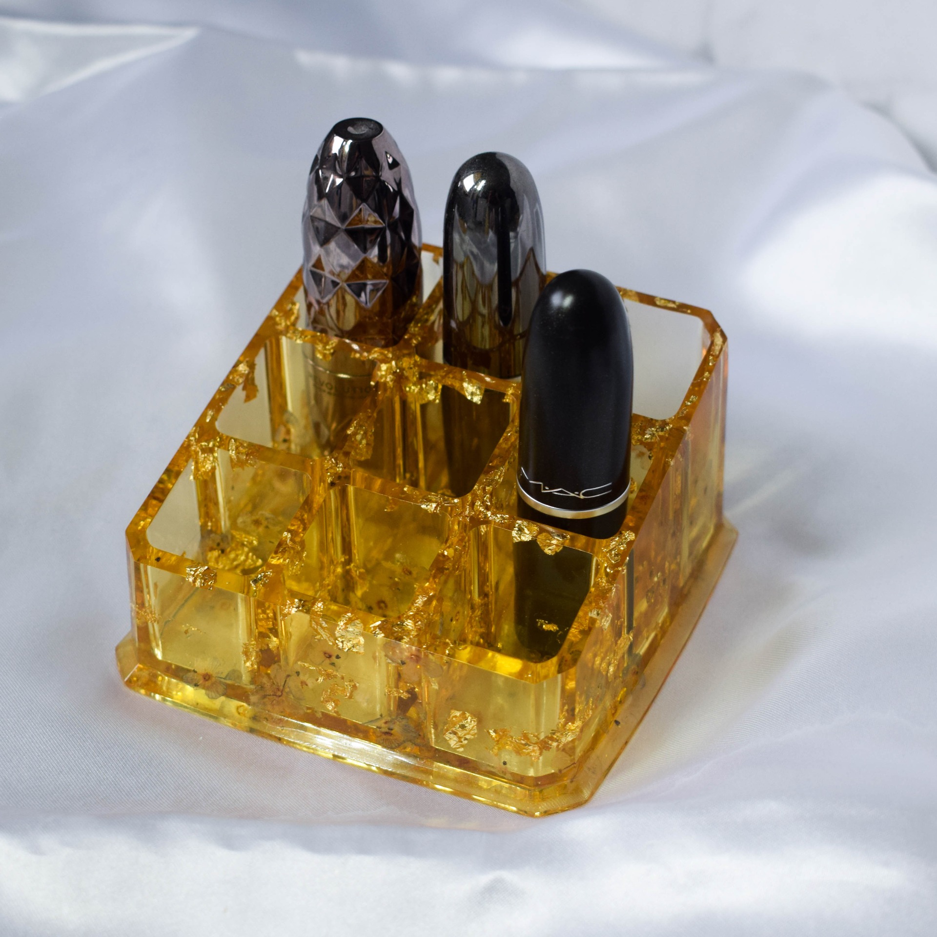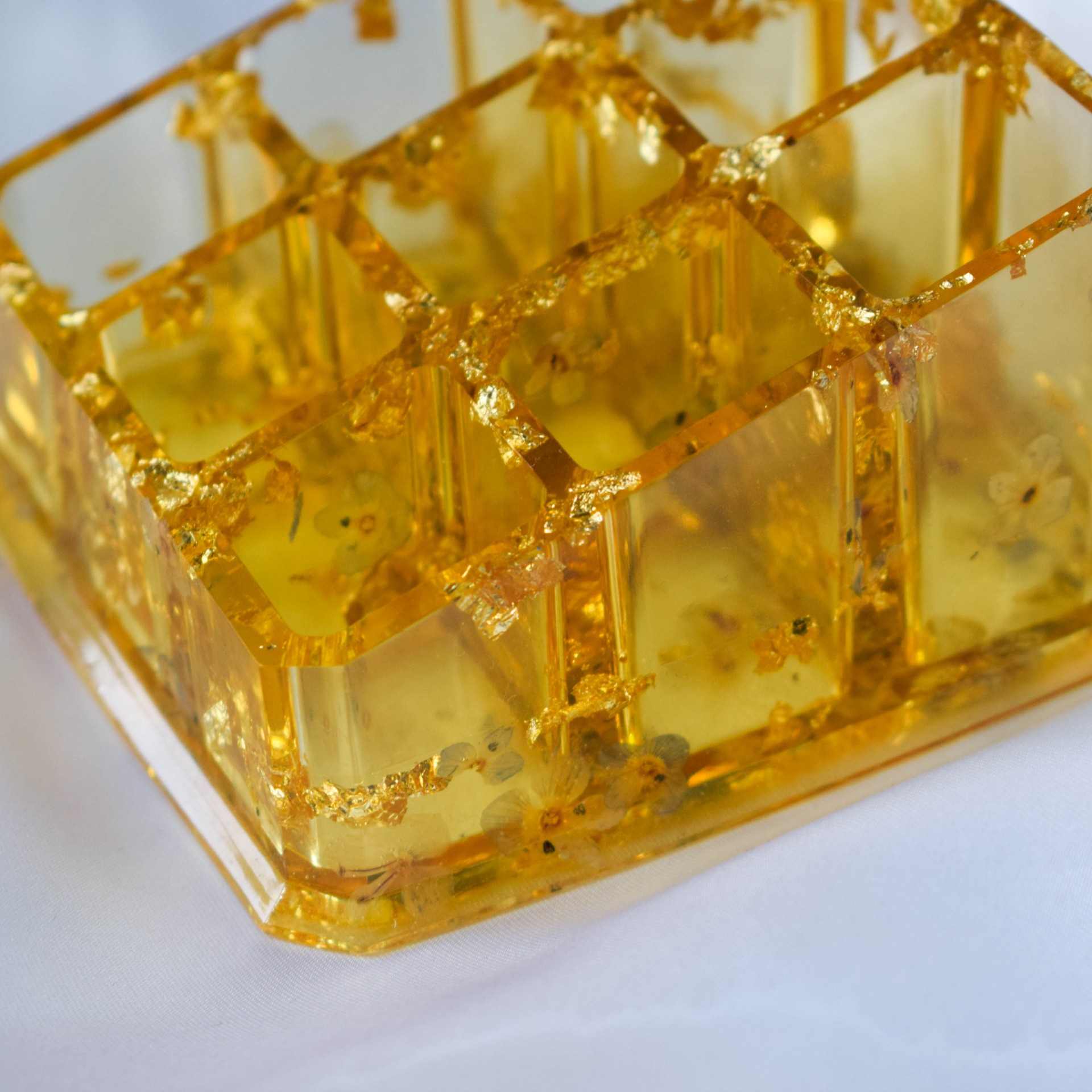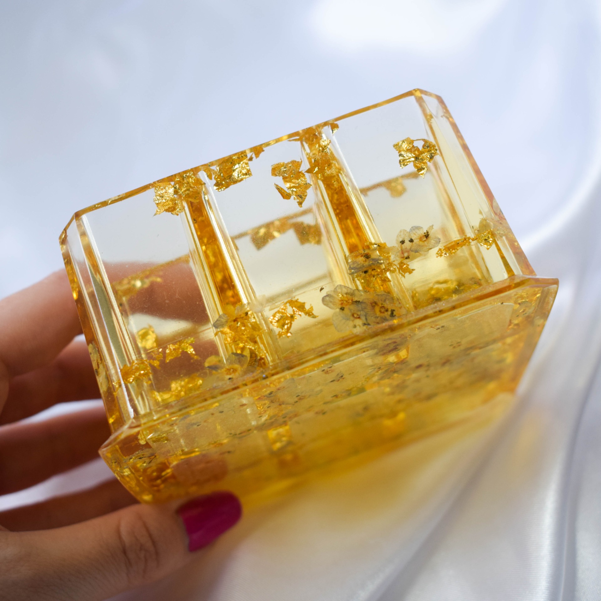 Organizér na rtěnky, nebo podobné drobné věci. V organizéru jsou zalité zlaté plátky a sušené květy Rozrazilu.