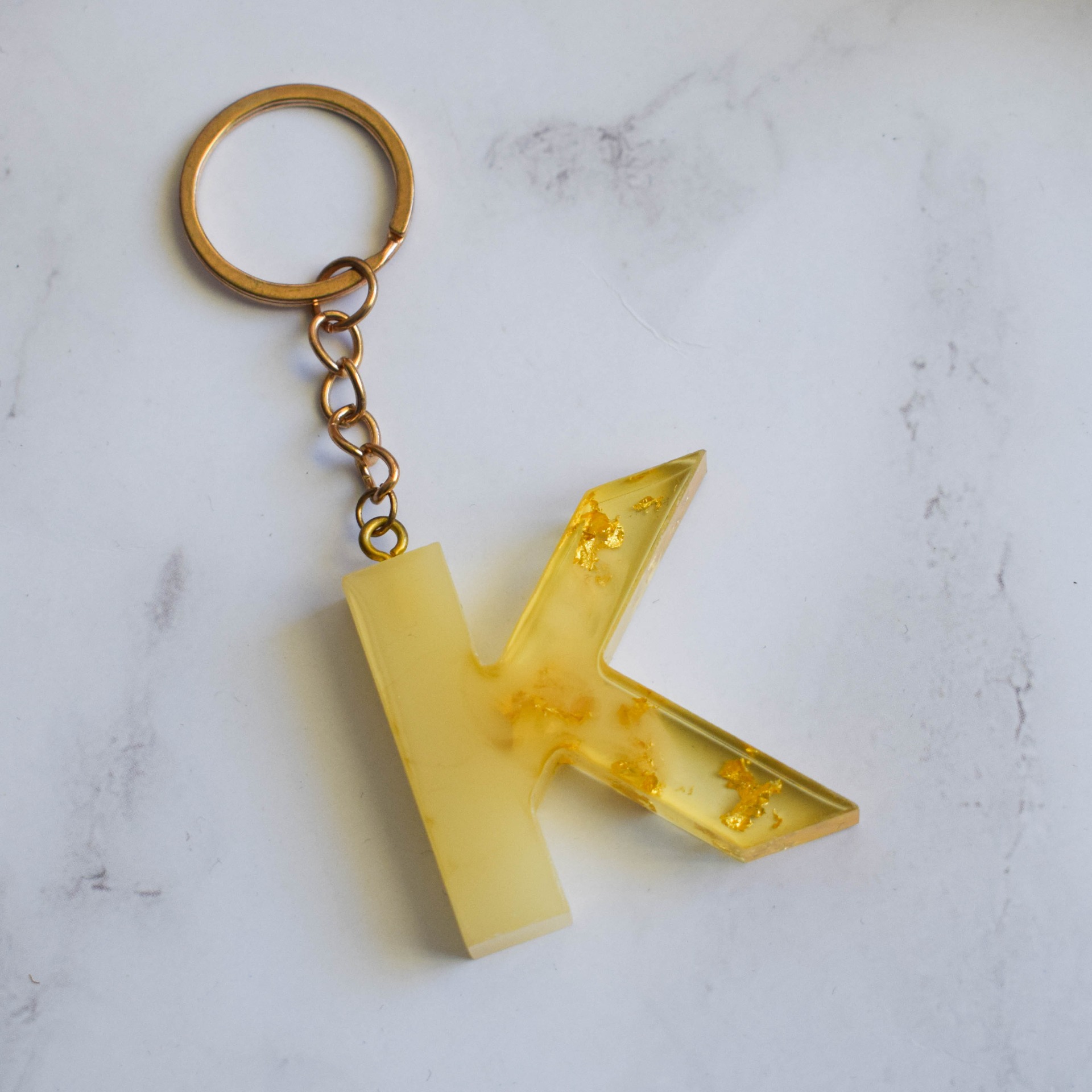 Klíčenka tvaru písmenka K z pryskyřice. Ve žluté a čiré barvě se zlatými plátky.