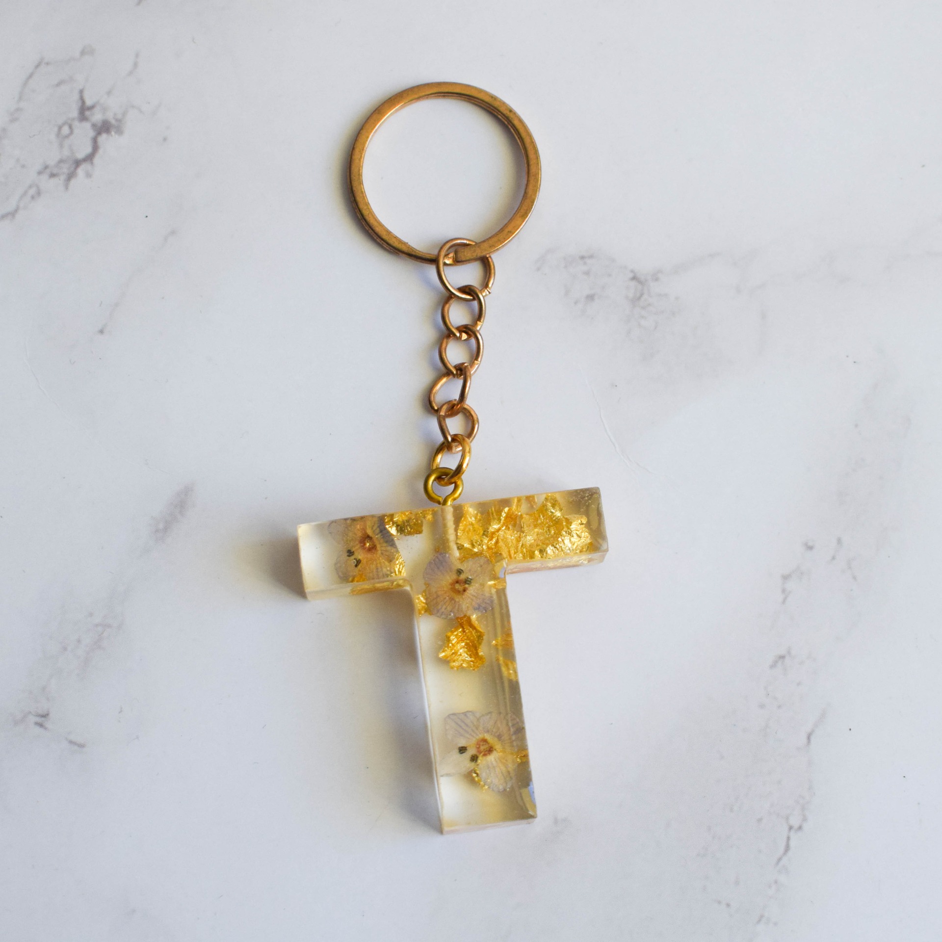 Klíčenka tvaru písmenka T z pryskyřice. V čiré barvě s ručně trhaným a sušeným rozrazilem a zlatými plátky.