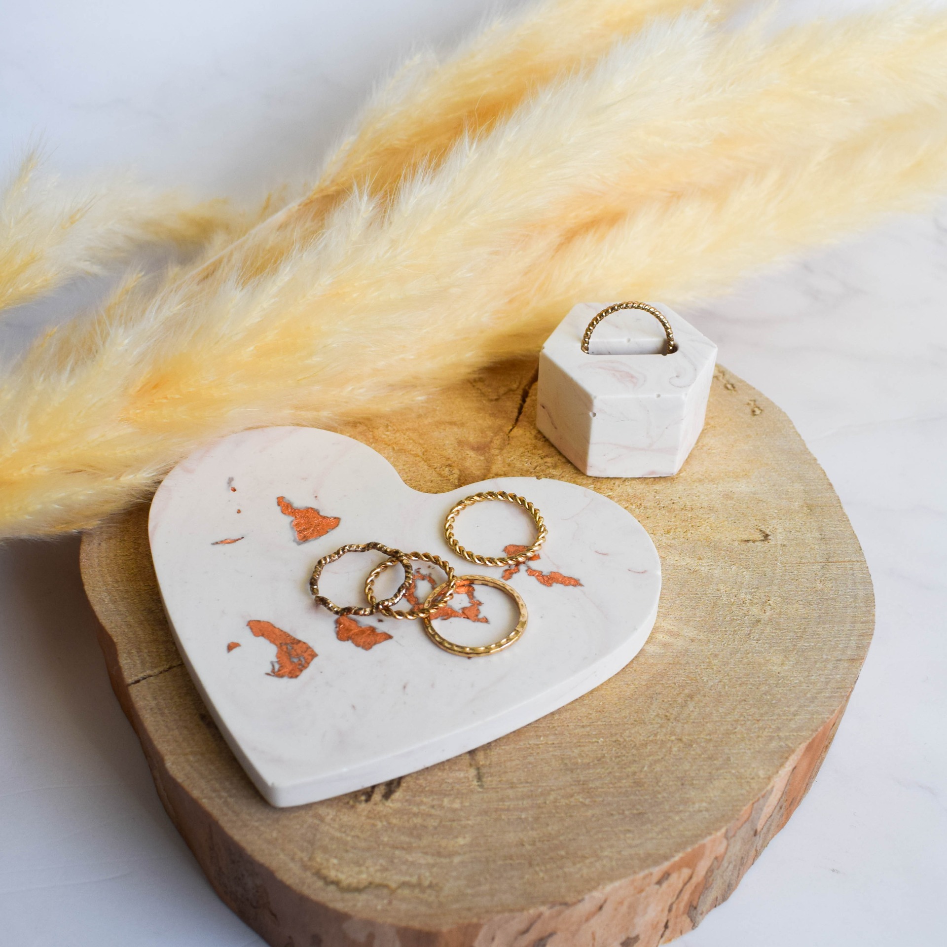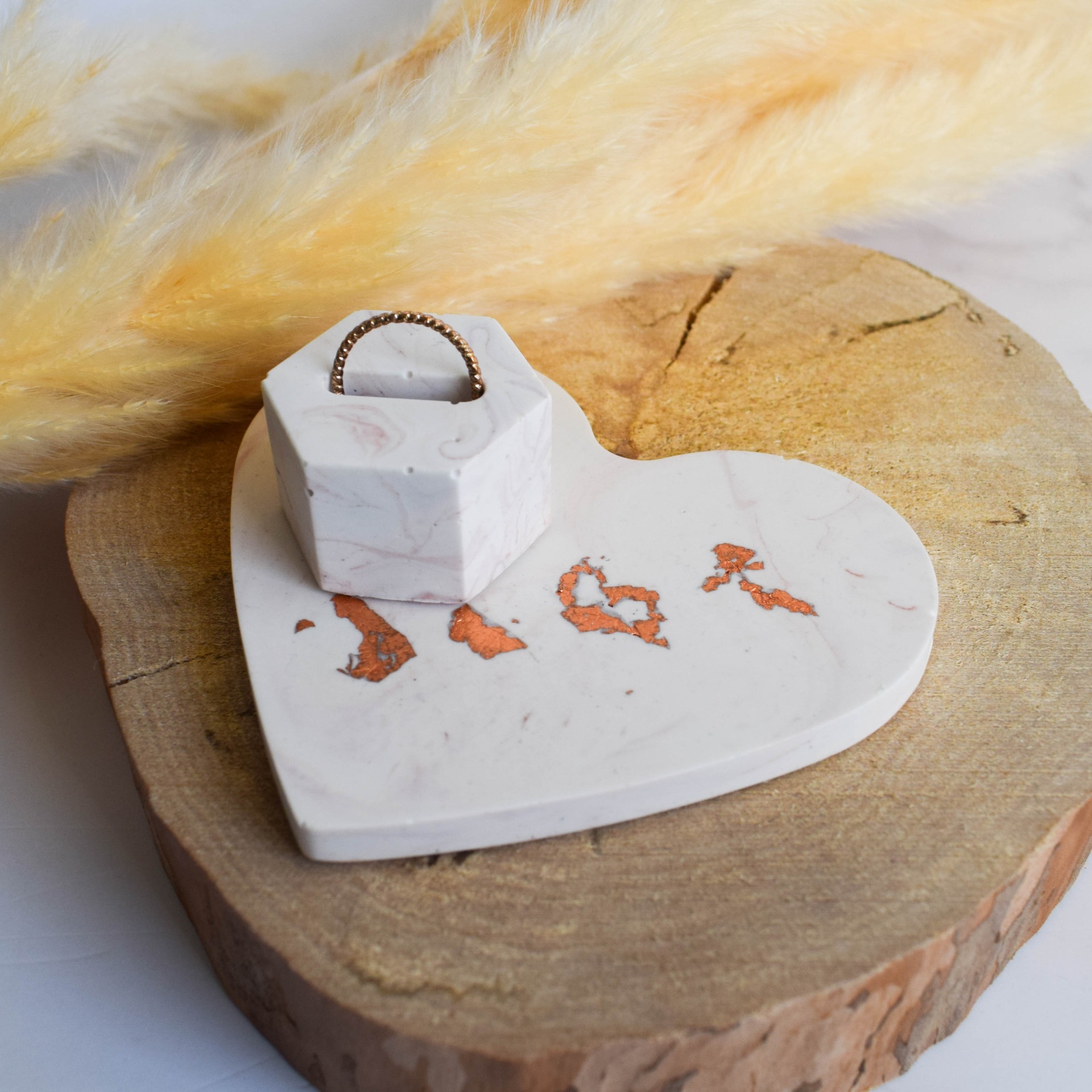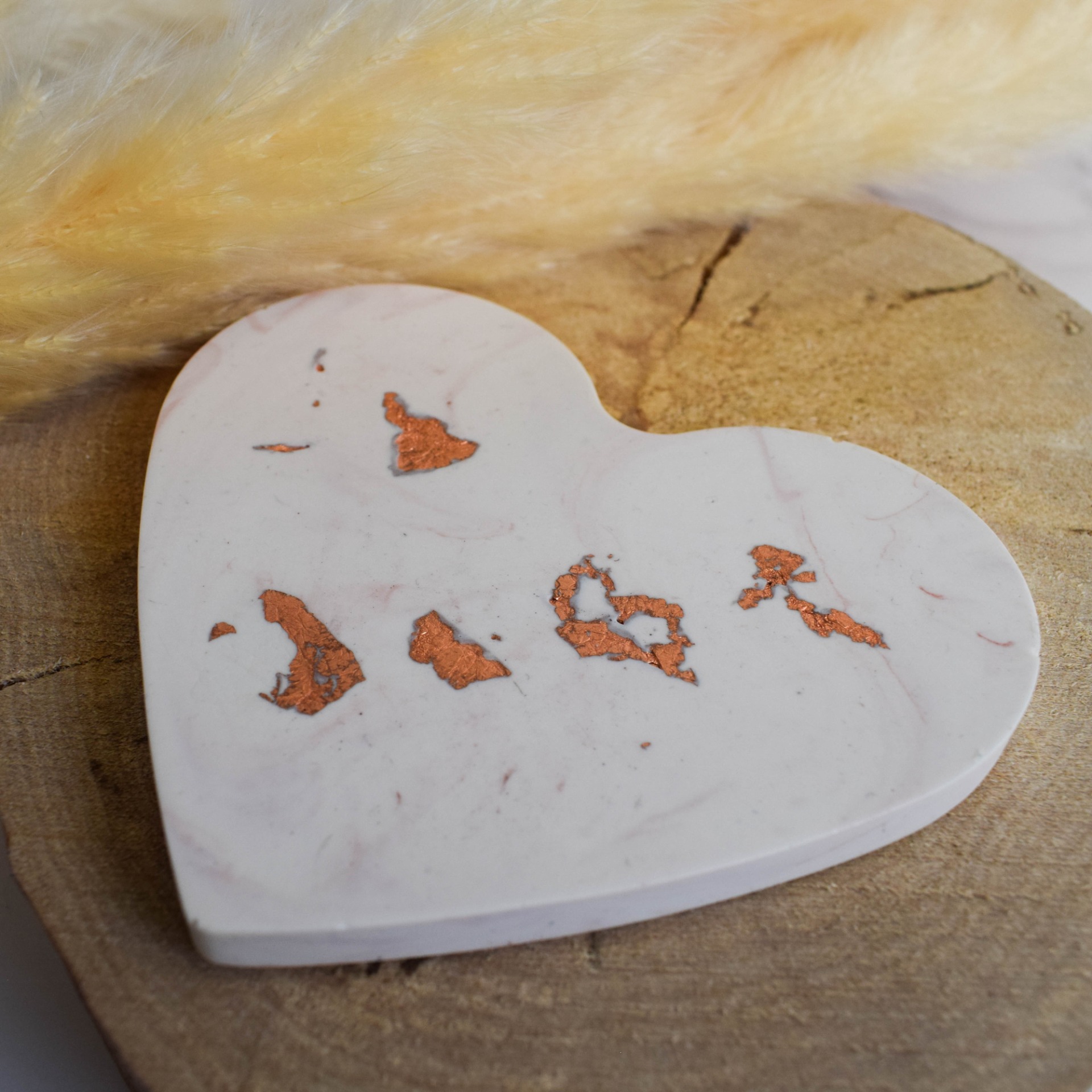 Podtácek ve tvaru srdce, vyroben z jesmonitu - minerální pryskyřice. V designu imitující mramor v cihlové barvě a s rosegold plátky. Sloužící na odkládání hrnku, skleničky, či šperků.