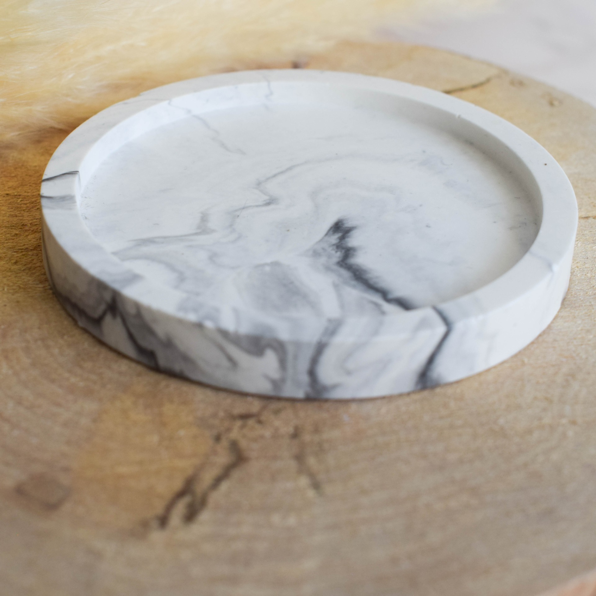 Podtácek velikosti na espresso vyroben z jesmonitu - minerální pryskyřice v designu imitující mramor. Slouží na odkládání skleničky, šperků či svíčky.