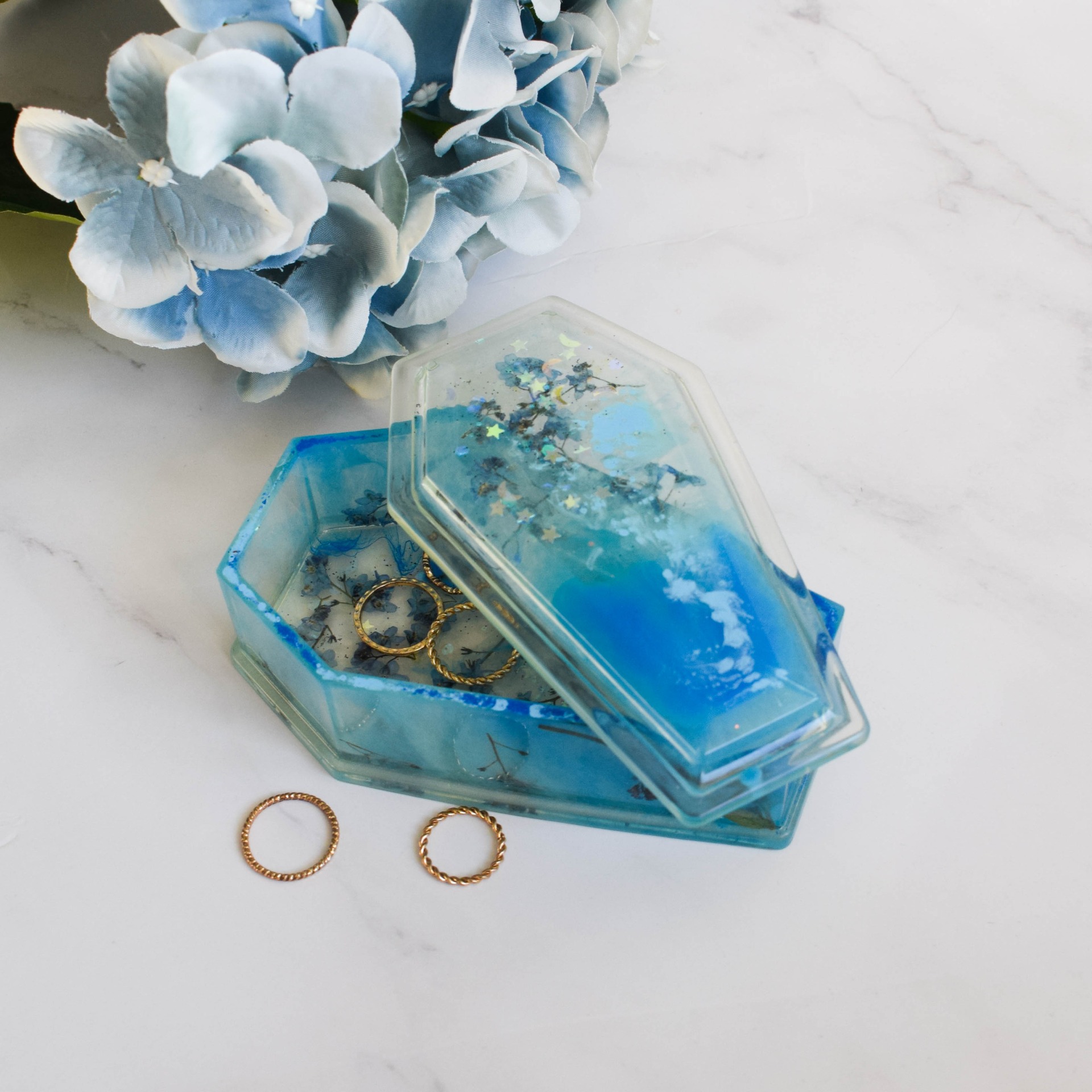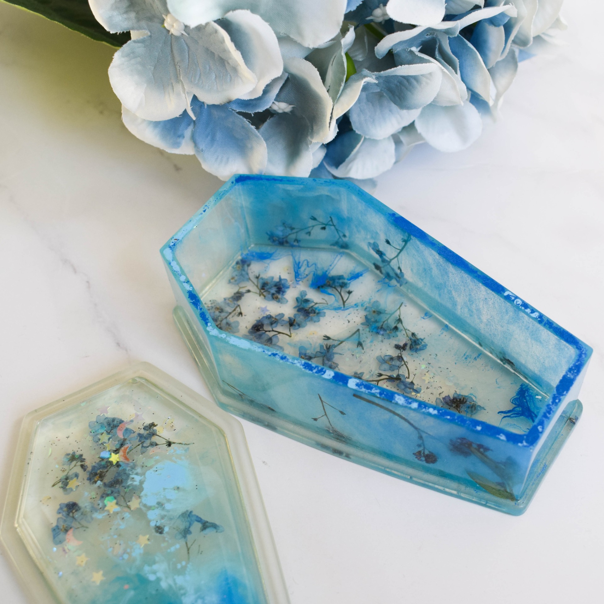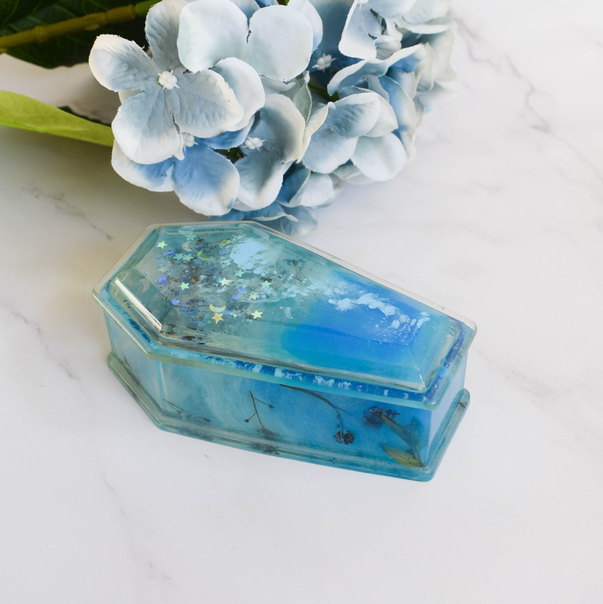 Šperkovnice ve tvaru rakvičky vyrobena z pryskyřice. V designu modré se sušenými pomněnkami a holografickými glitry ve tvaru hvězdiček a měsíčků.
