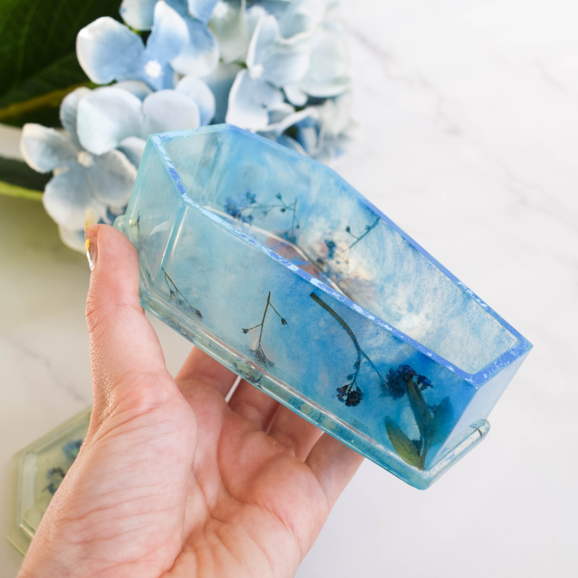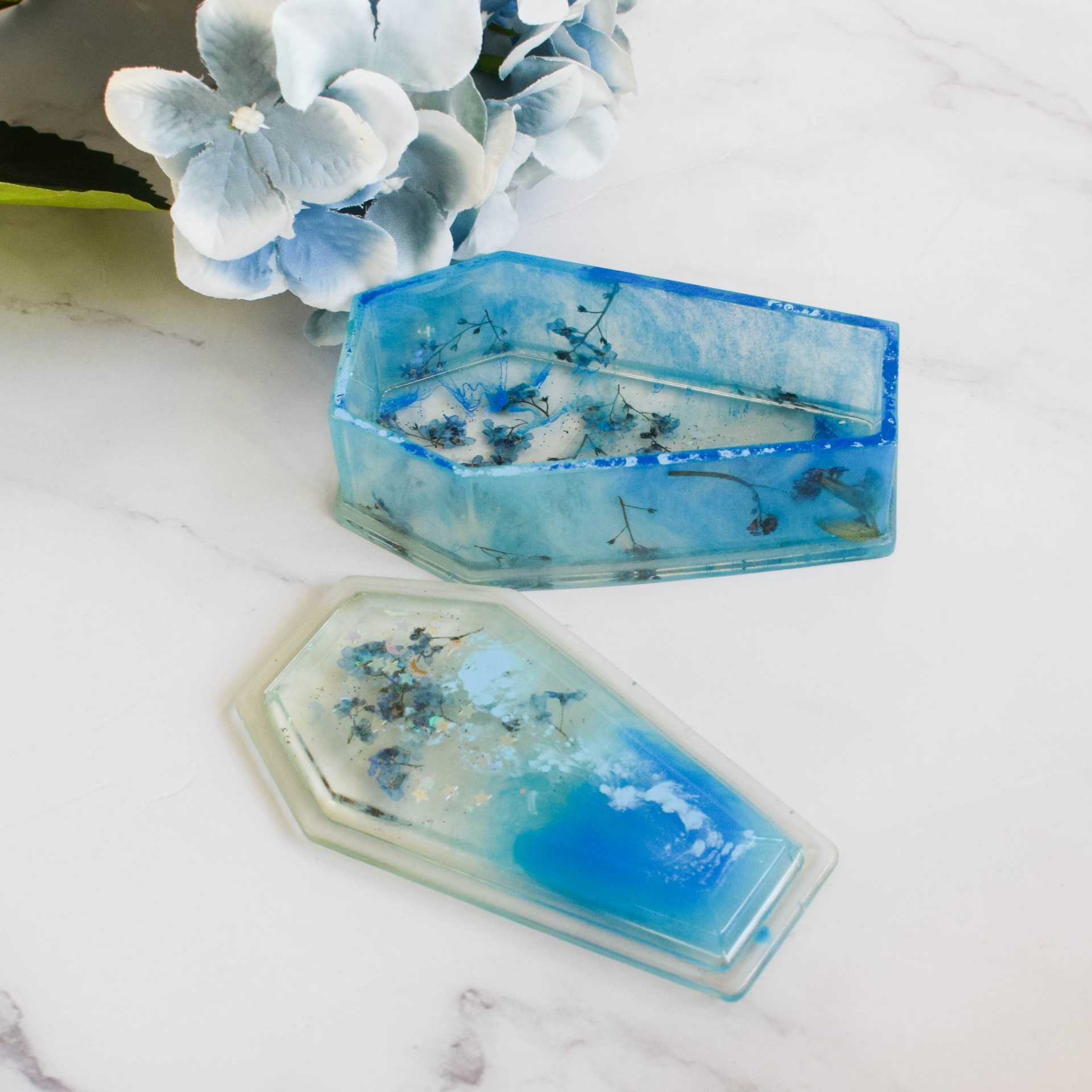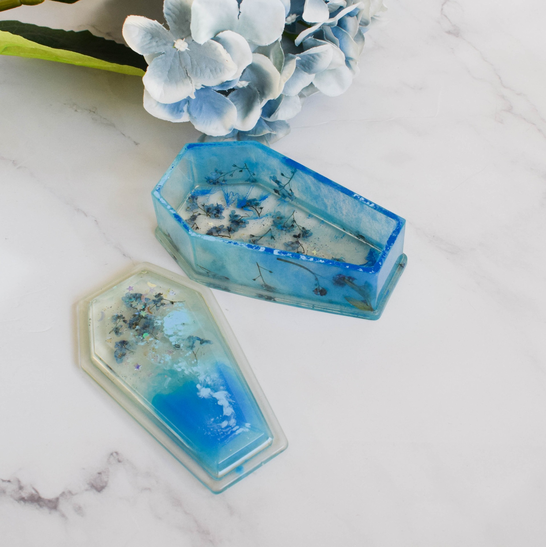 Šperkovnice ve tvaru rakvičky vyrobena z pryskyřice. V designu modré se sušenými pomněnkami a holografickými glitry ve tvaru hvězdiček a měsíčků.
