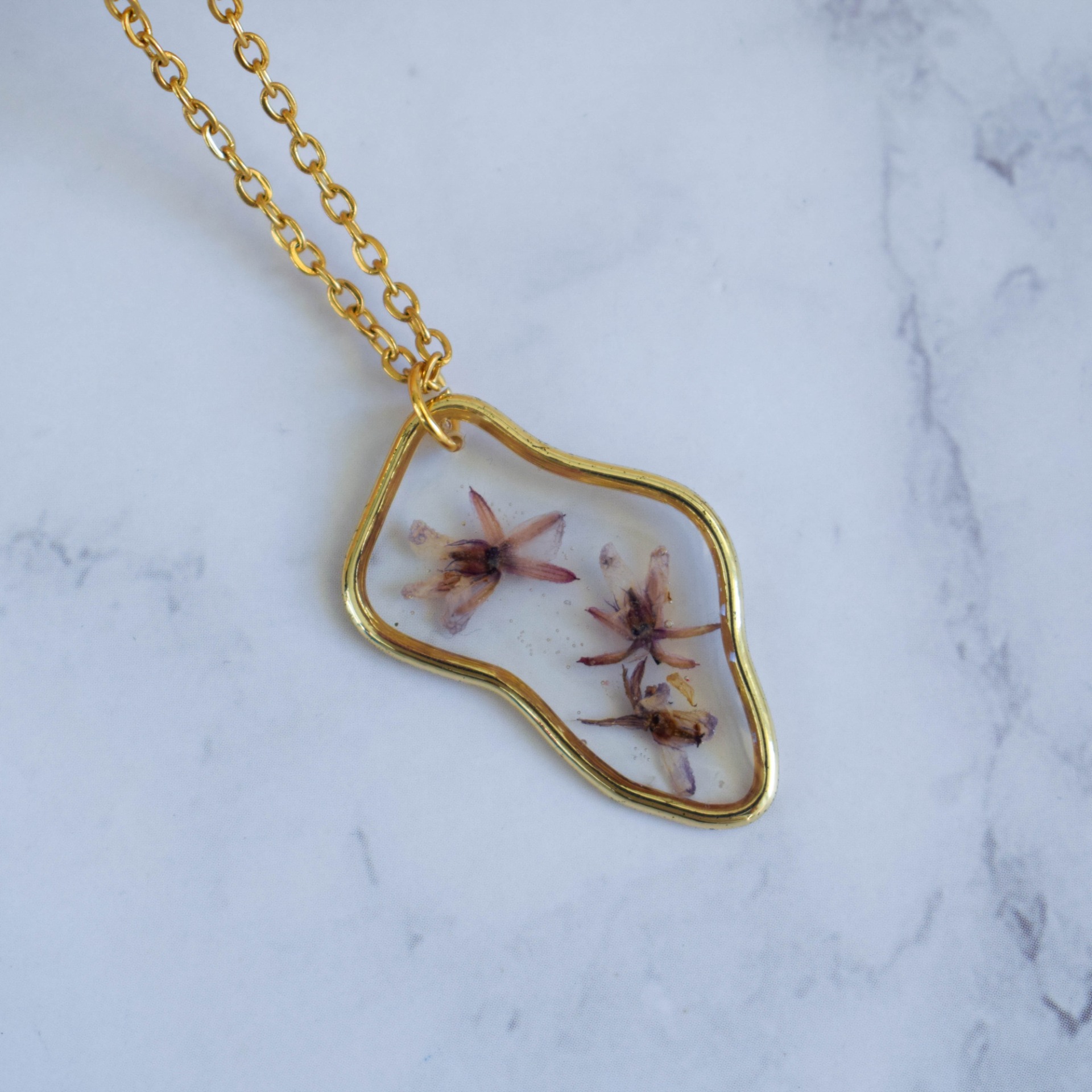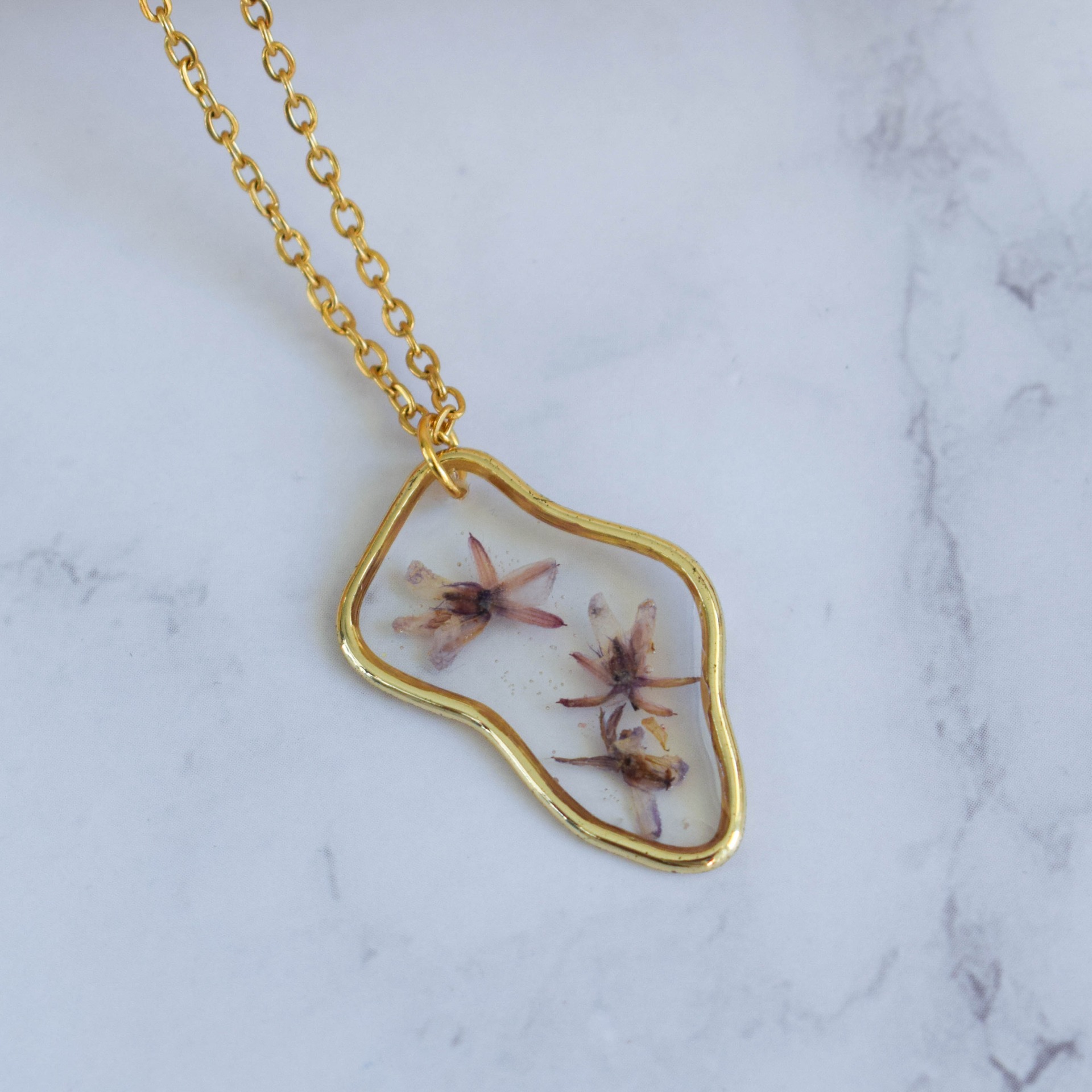 Pozlacený řetízek, který se hodí pro každou něžnou duši, z nerezové oceli s přívěškem v nepravidelném tvaru (bižuterní kov), uvnitř zalité vybledlejší fialkové květy. Skvěle vynikne na bílých basic věcích.