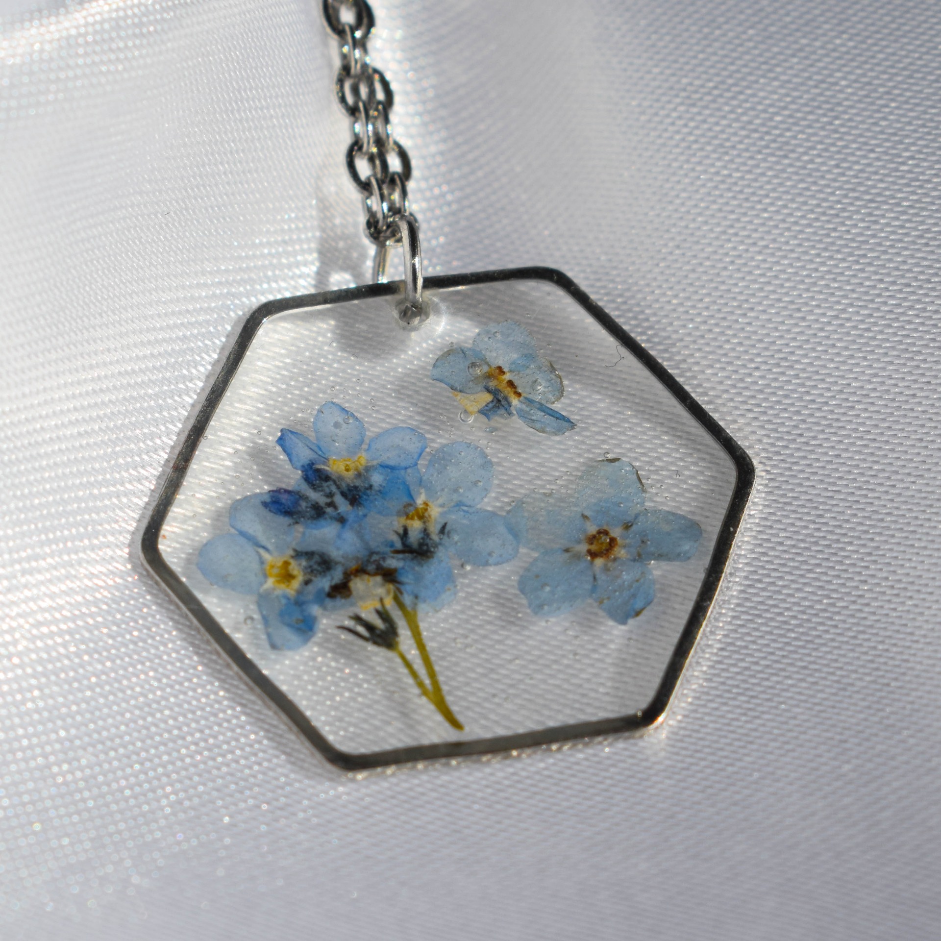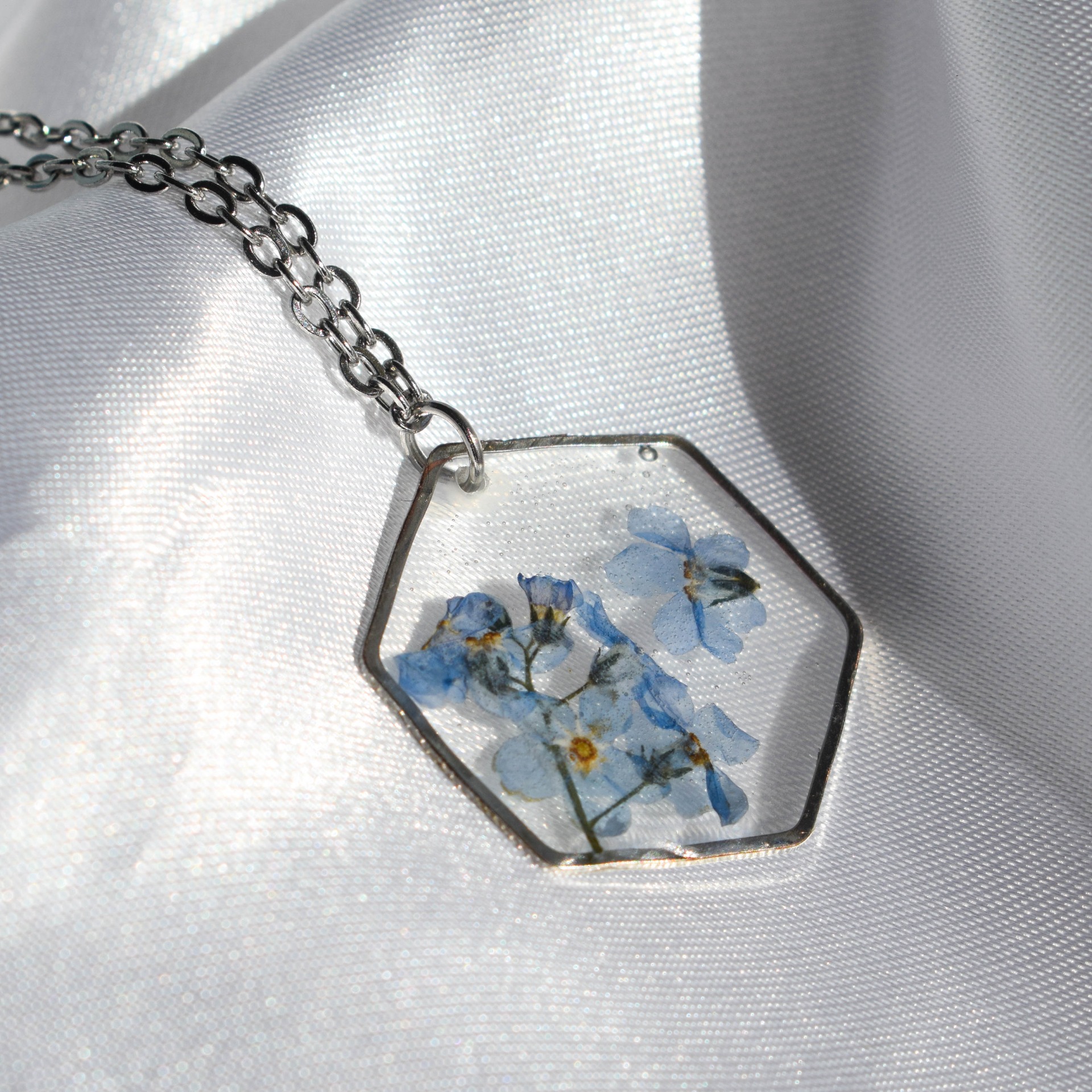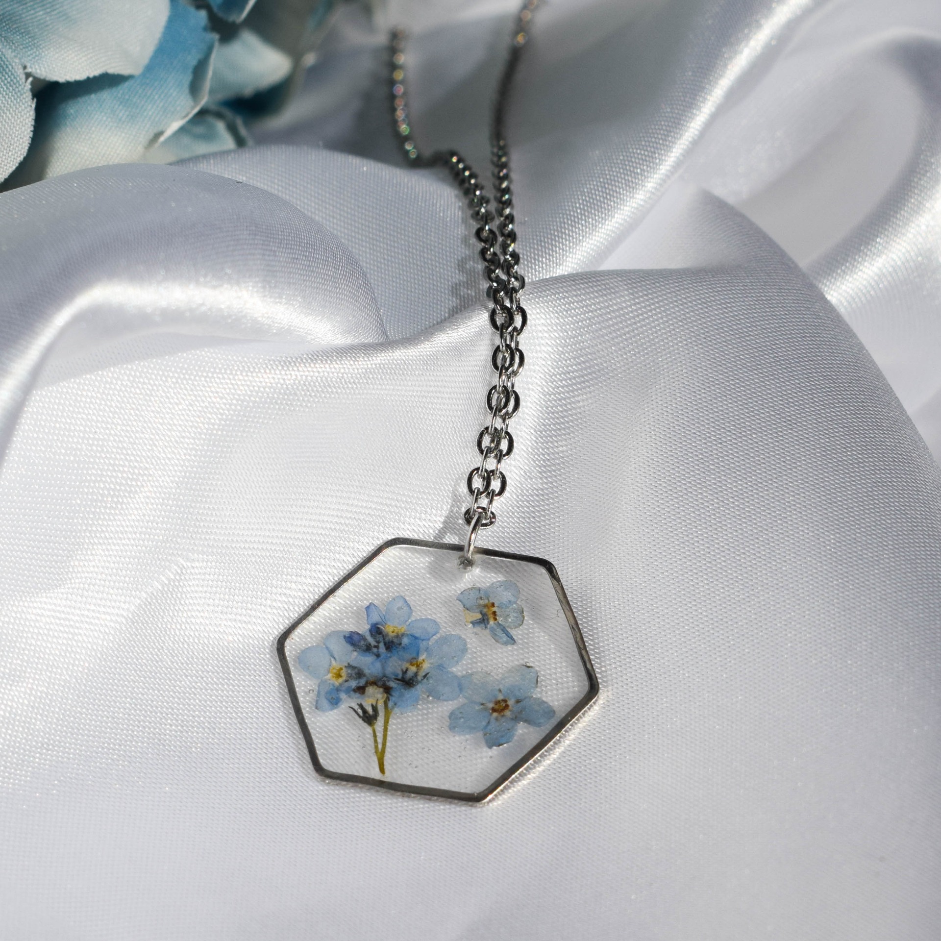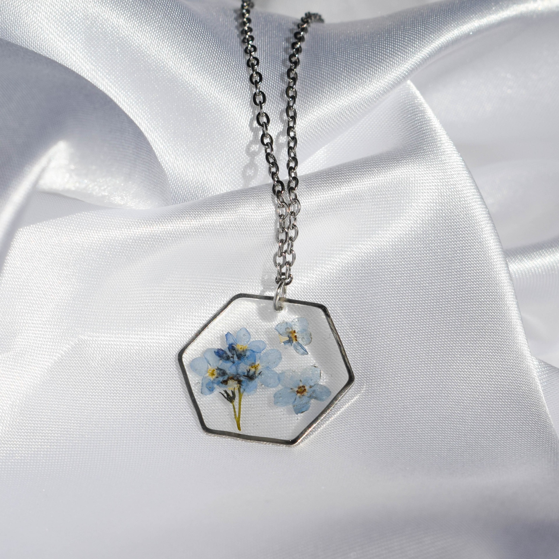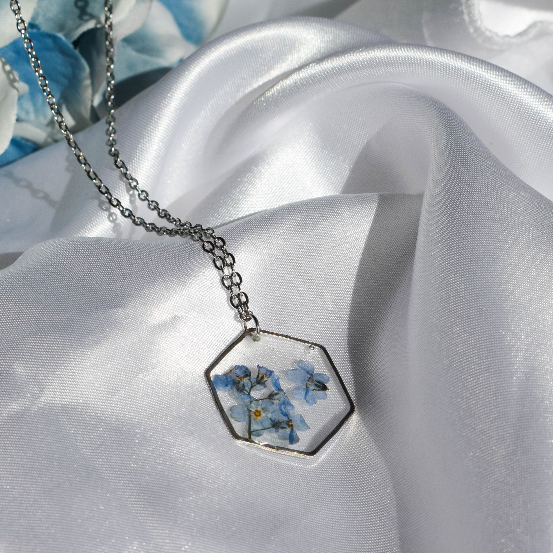 Postříbřený řetízek, který se hodí pro každou něžnou duši, z nerezové oceli s přívěškem ve tvaru hexagonu (bižuterní kov), uvnitř zalité sušené květy pomněnek.