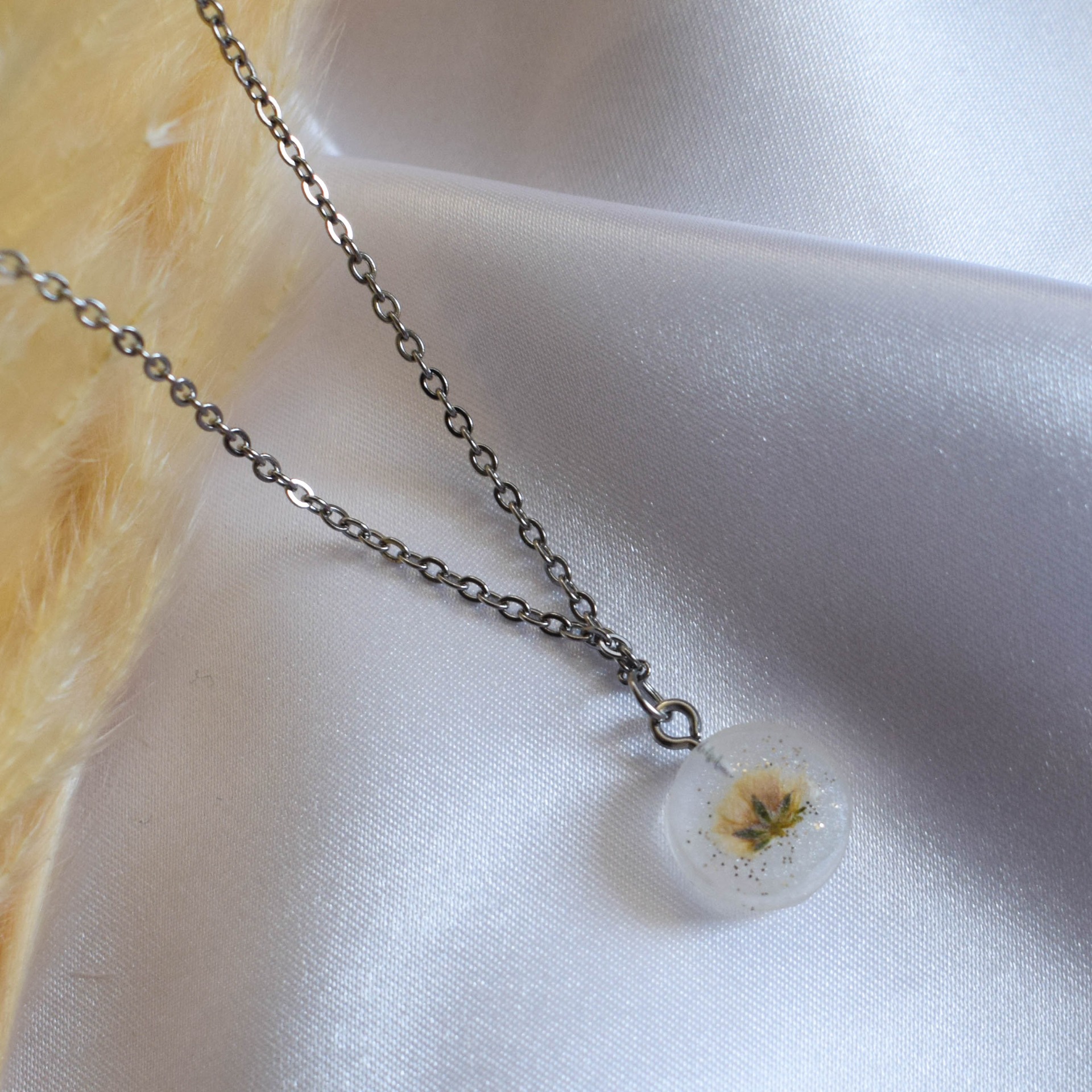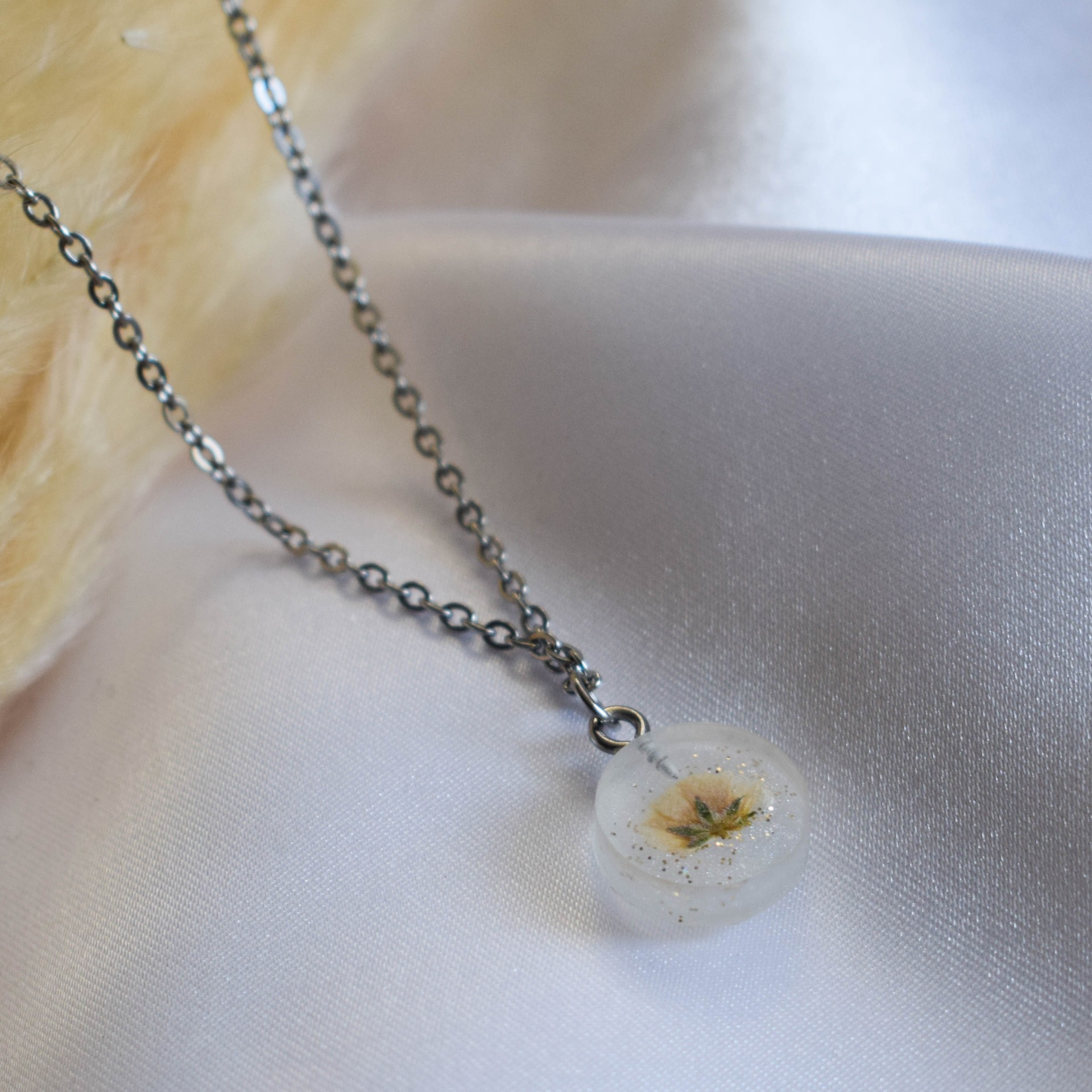 Postříbřený řetízek z nerezové oceli se sušeným šáterem (nevěstin závoj) a zlatými třpytkami, který v různých úhlech světla hází holografické odlesky.