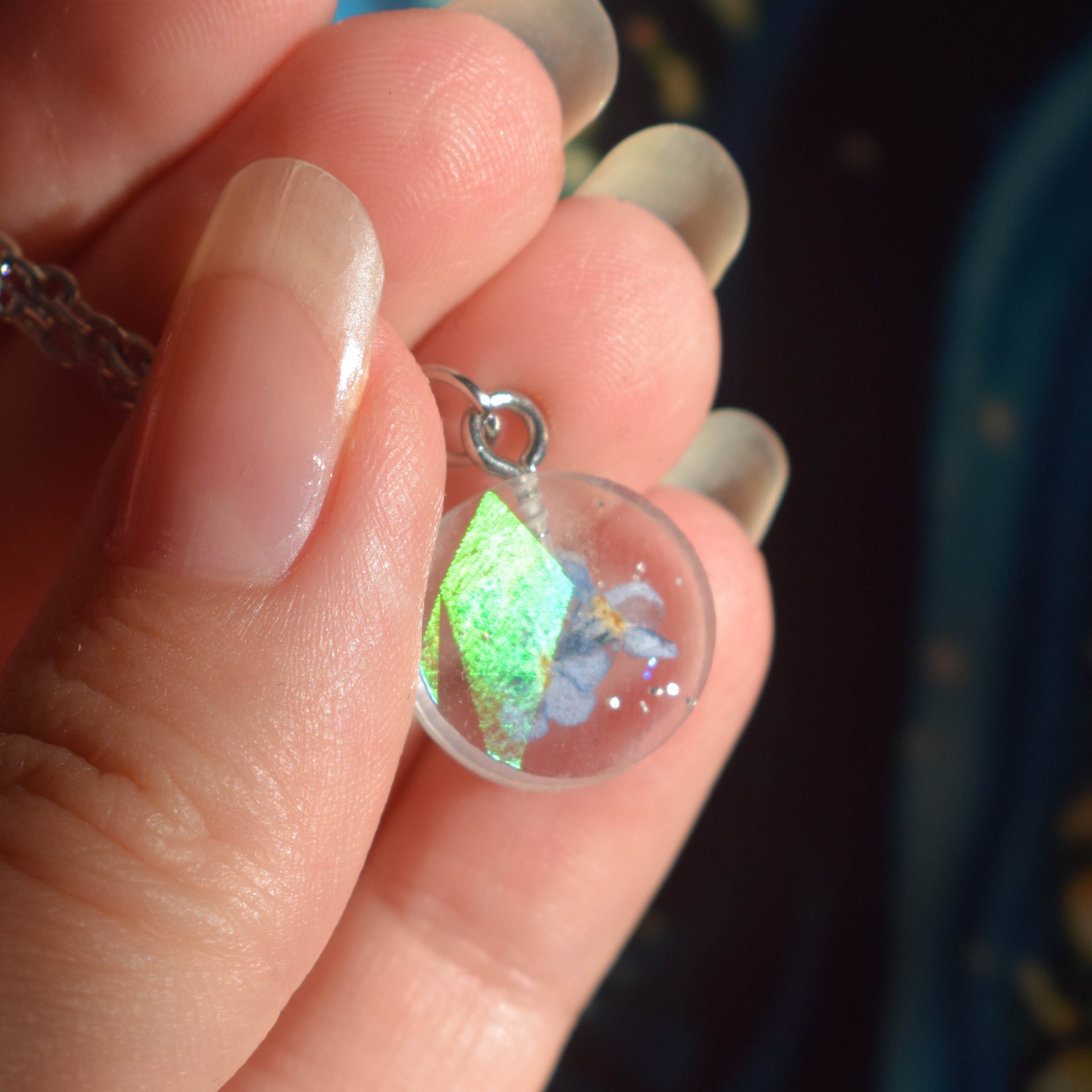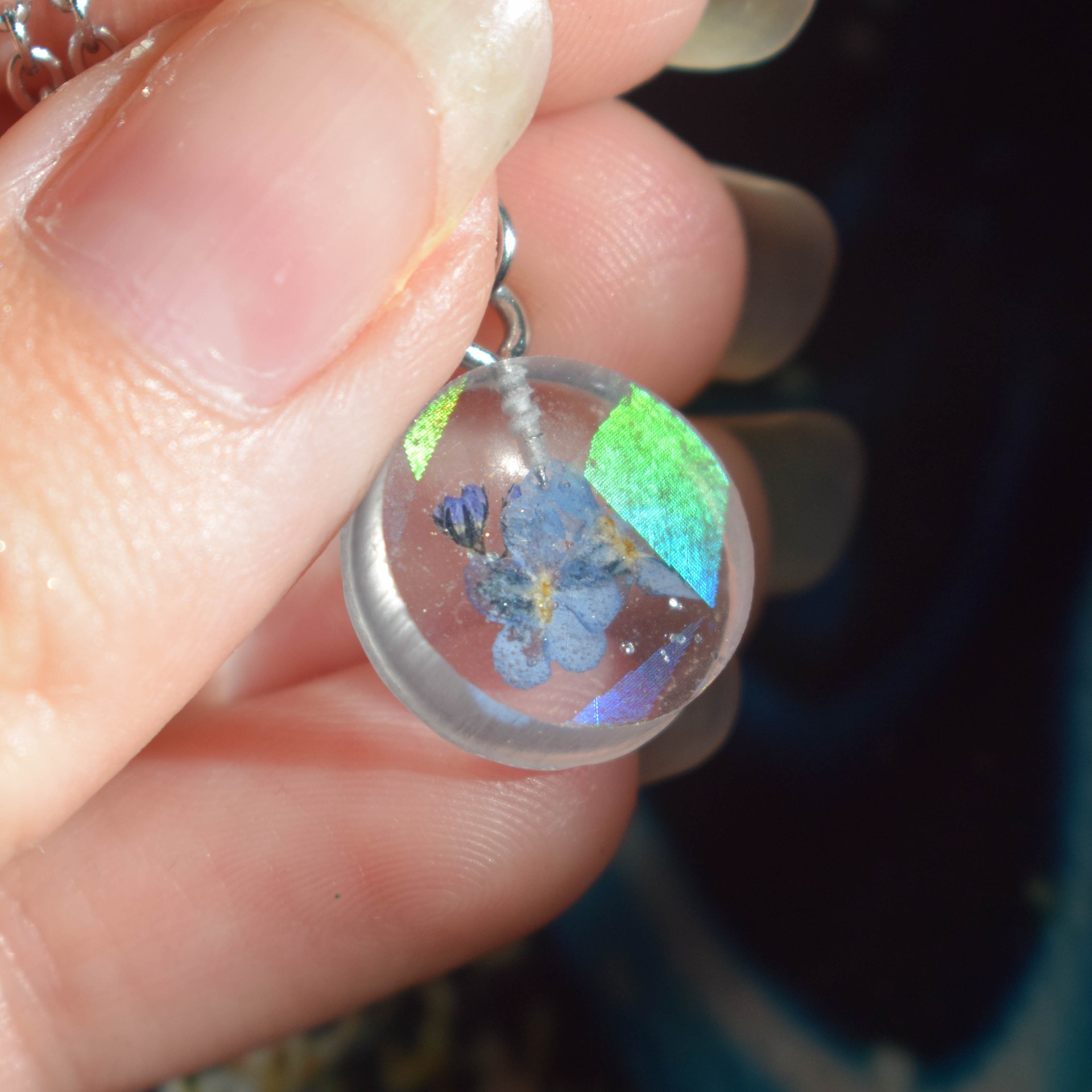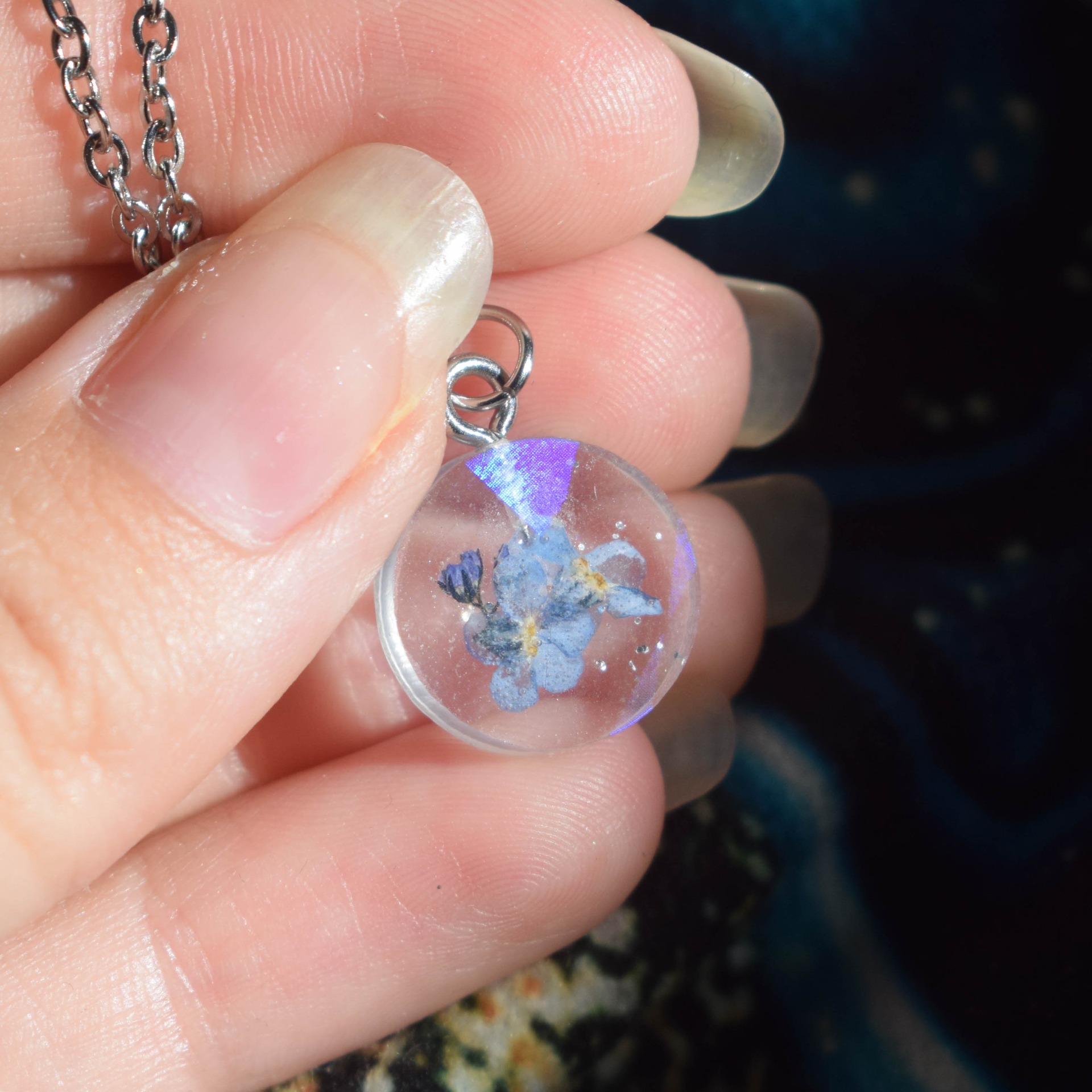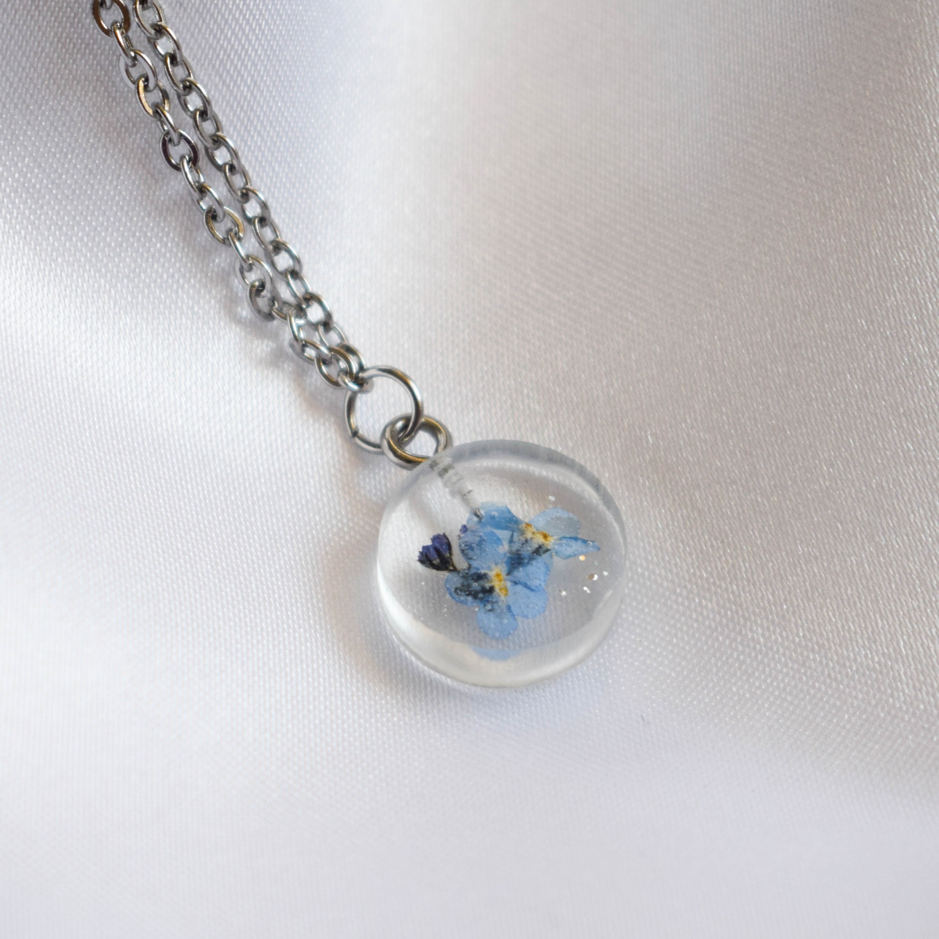 Postříbřený řetízek z nerezové oceli se sušenými pomněnkami, který v různých úhlech světla hází holografické odlesky.