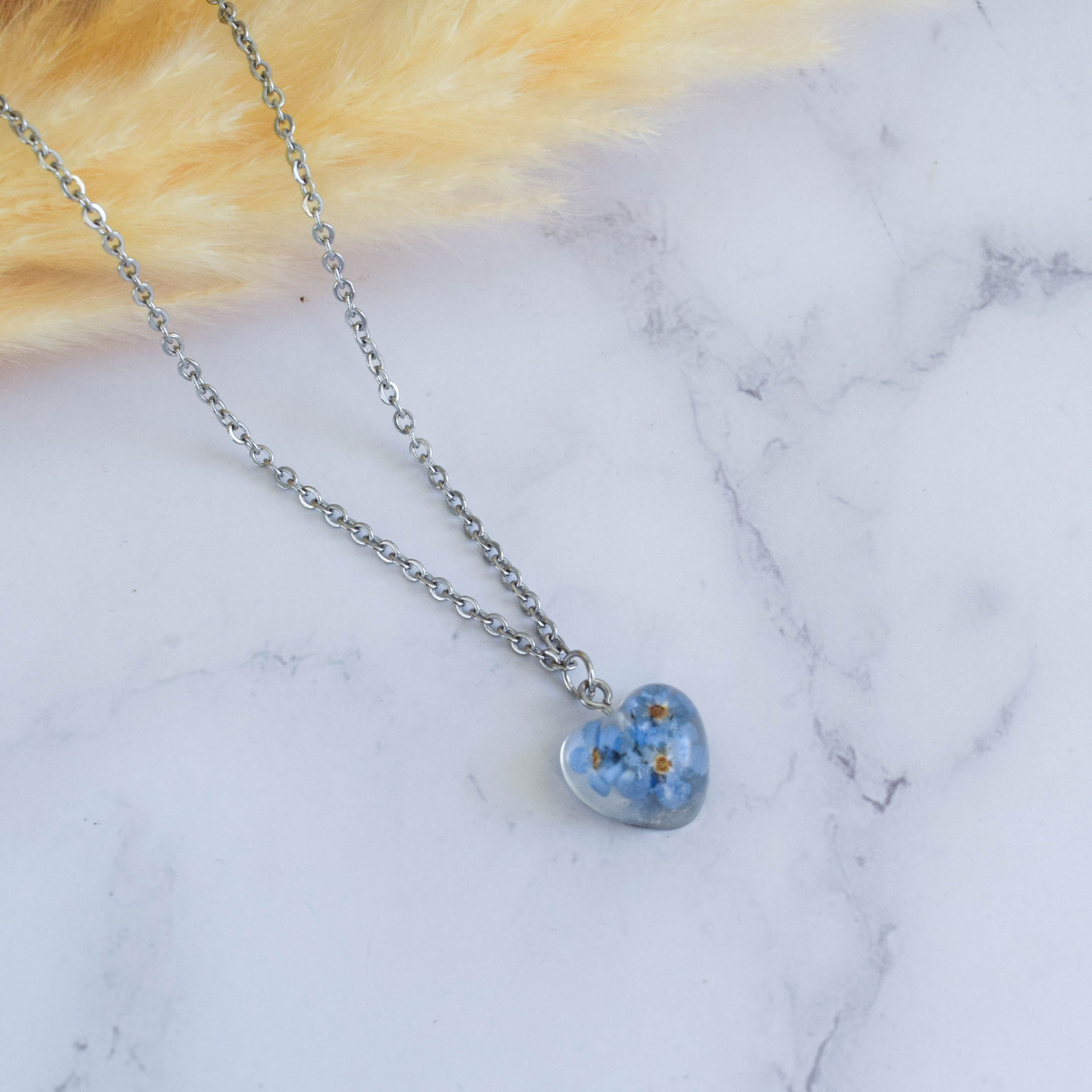 Rozjasněte svůj vzhled s tímto elegantním přívěskem ve tvaru srdce, který je vyroben z epoxidové pryskyřice se sušenými květy pomněnek. Tento unikátní kousek se skvěle hodí pro každou příležitost a dodá vašemu outfitu nádech něžnosti a elegance.