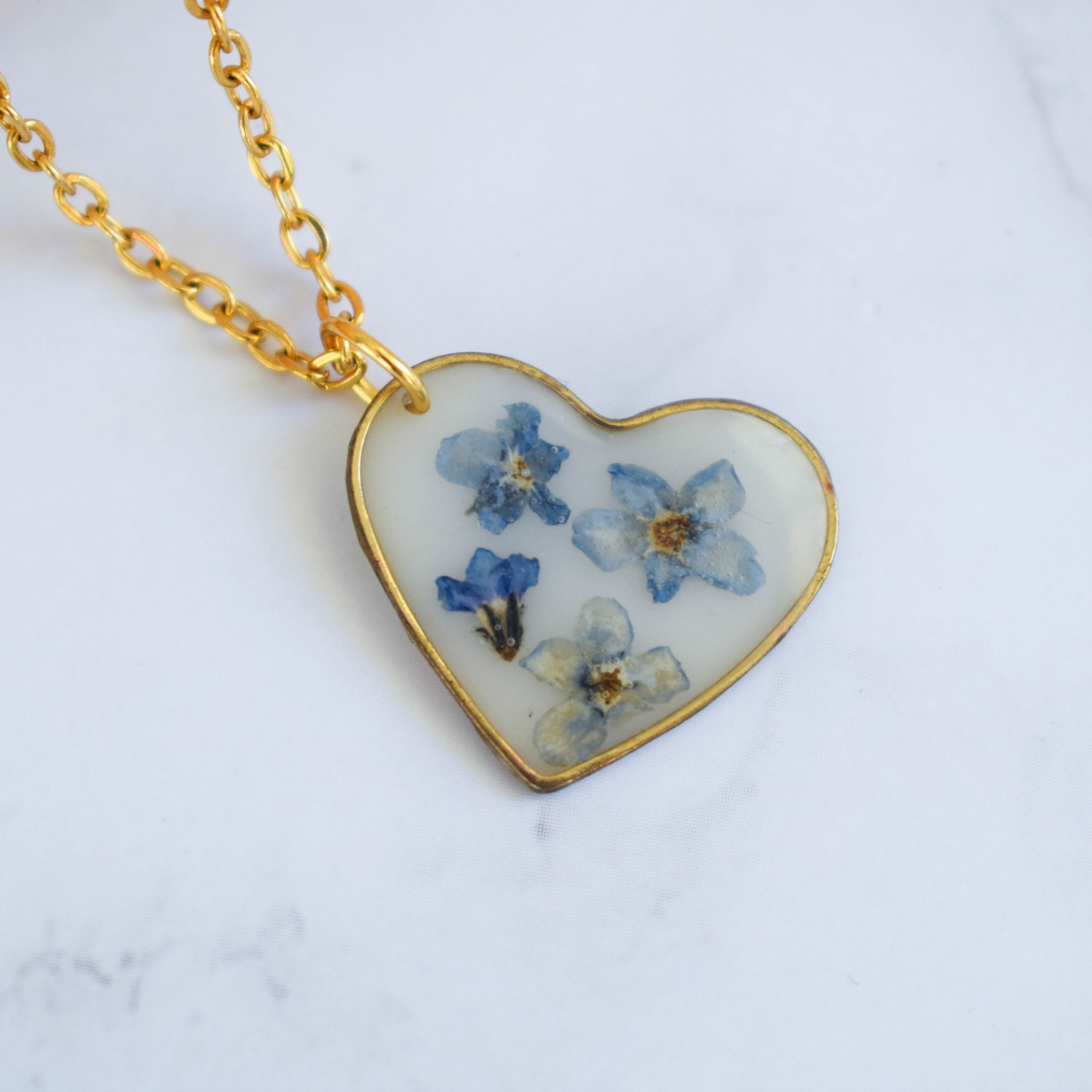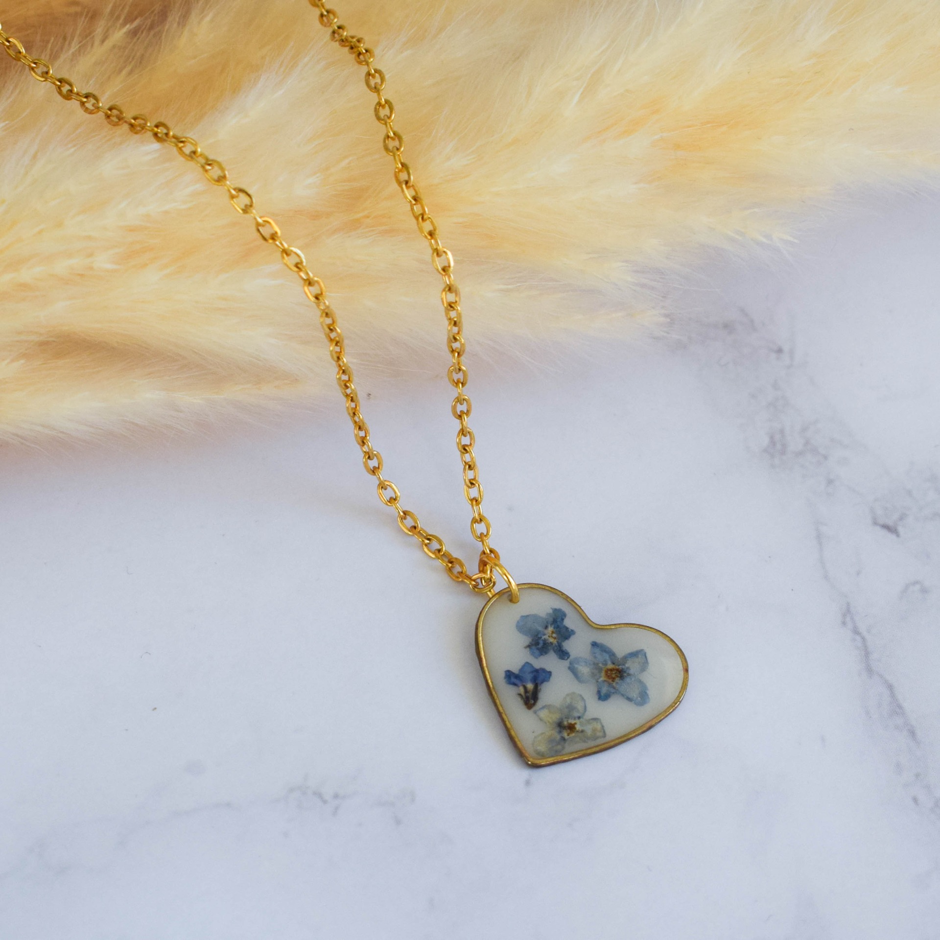 Pozlacený řetízek vyroben z pryskyřice, který se hodí pro každou něžnou duši, z nerezové oceli s přívěškem ve tvaru srdíčka (bižuterní kov), uvnitř zalité sušené pomněnky na bílém pozadí.