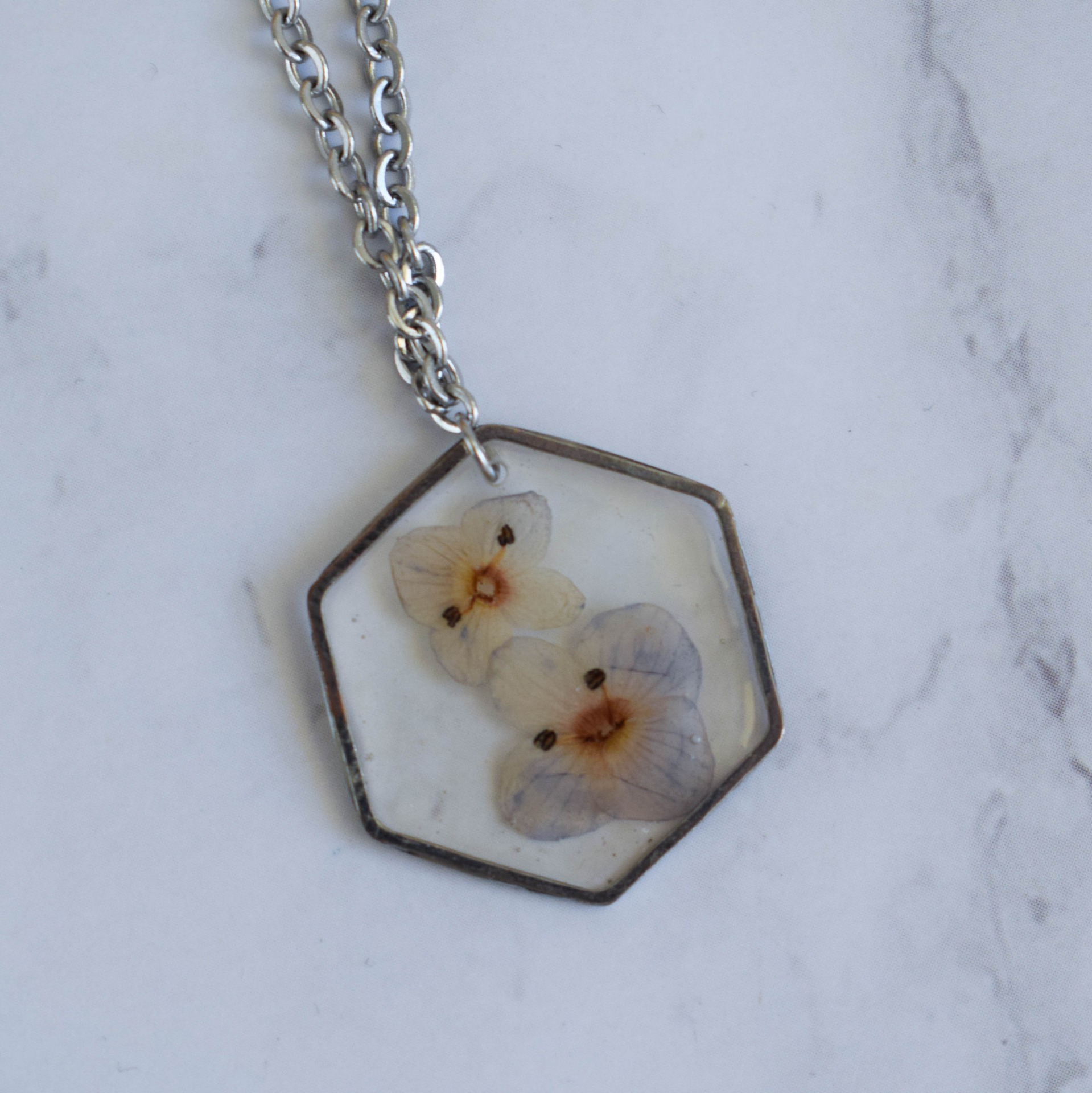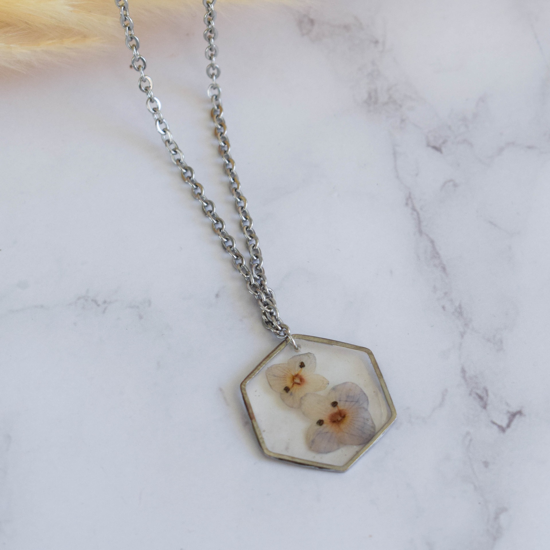 Postříbřený řetízek, který se hodí pro každou něžnou duši, z nerezové oceli s přívěškem ve tvaru hexagonu (bižuterní kov), uvnitř zalité sušené květy rozrazilu.