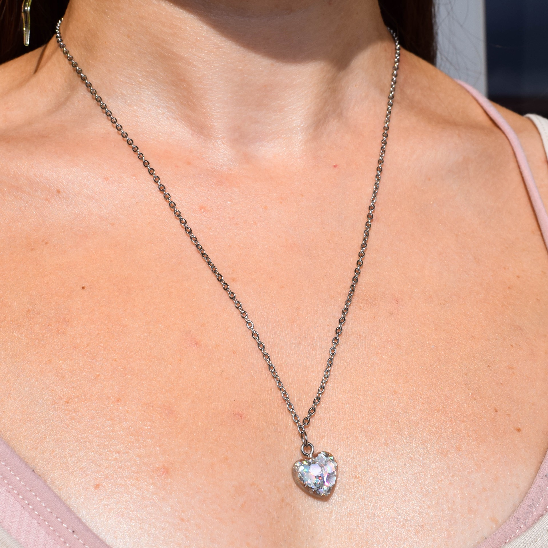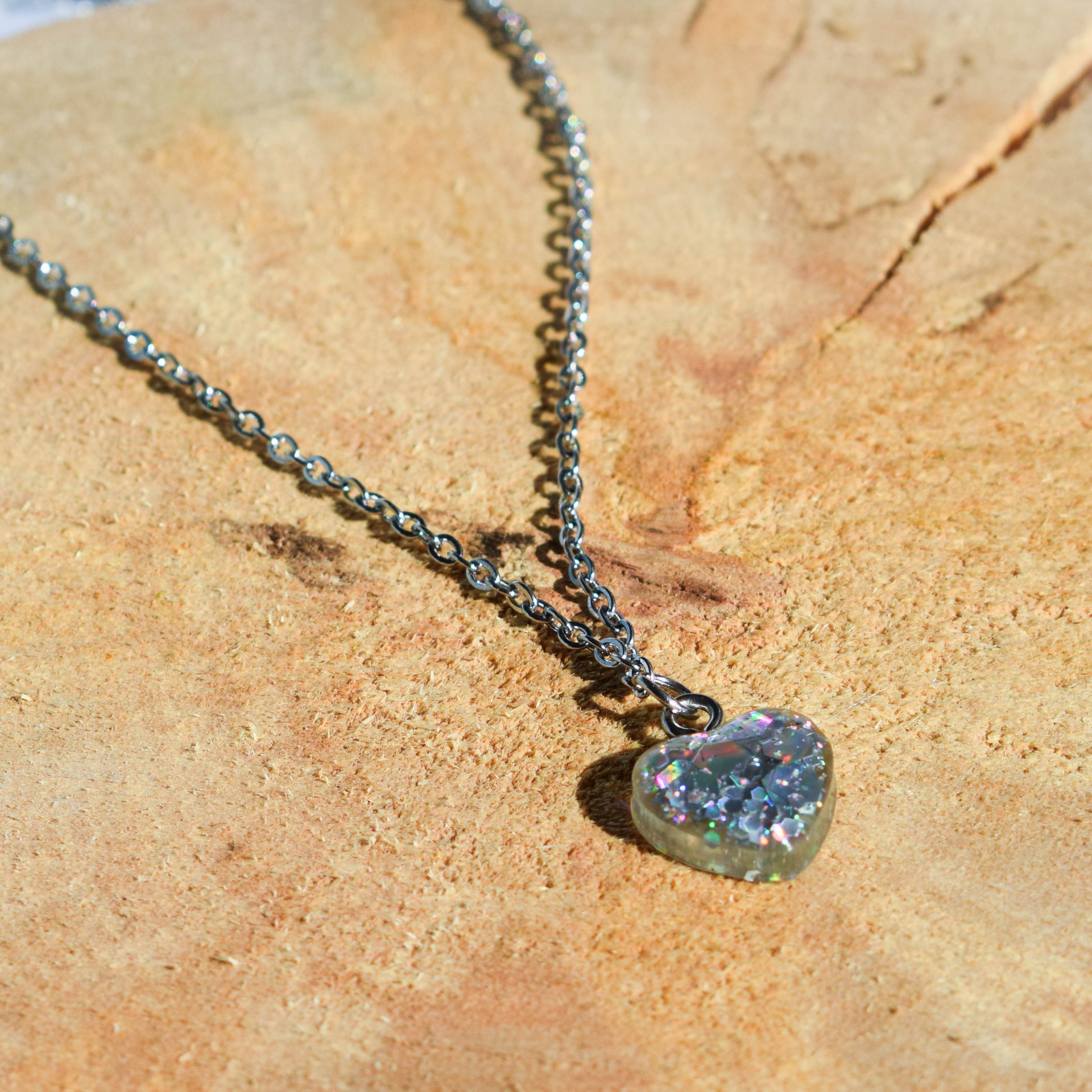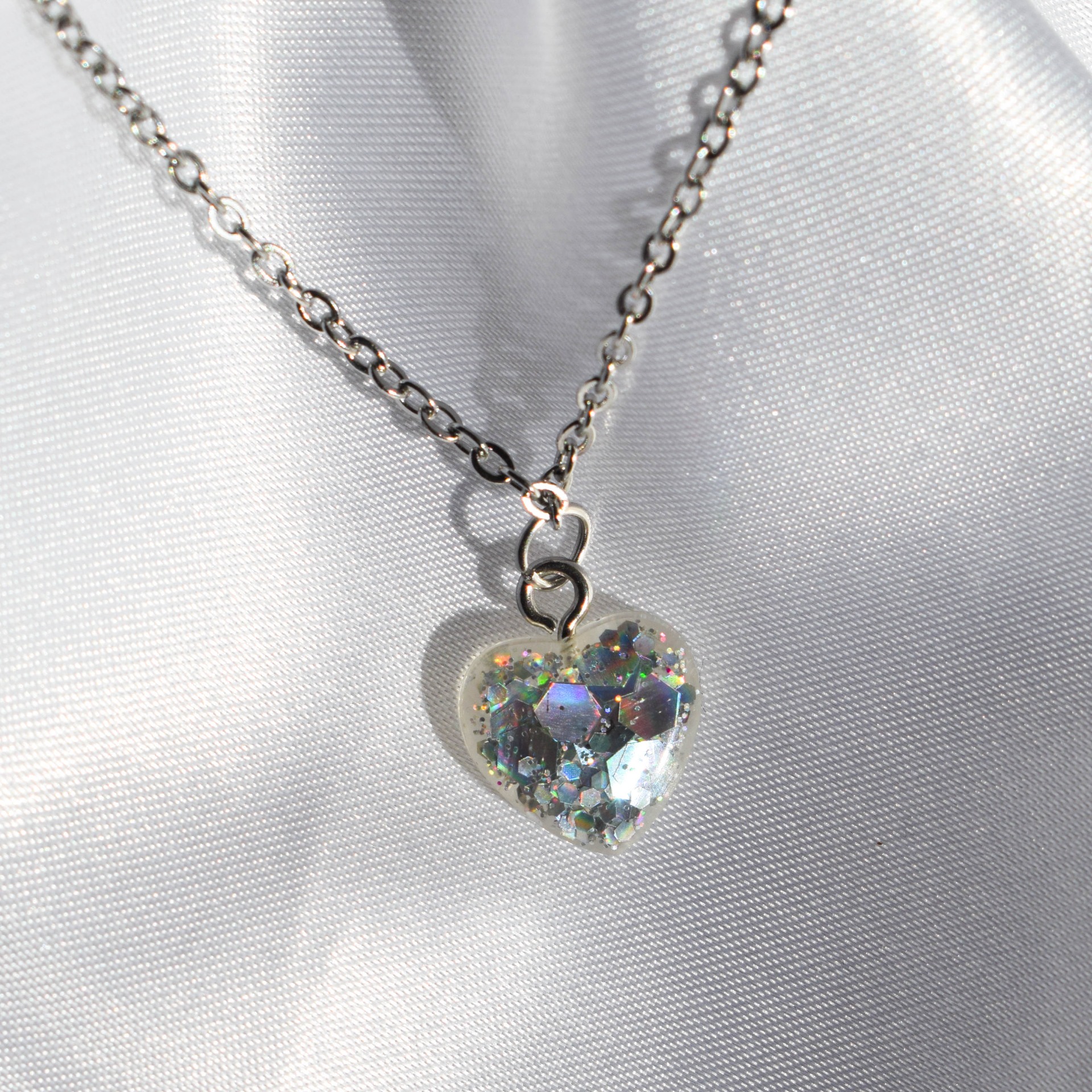 Rozjasněte svůj vzhled s tímto elegantním přívěskem ve tvaru srdce, který je vyroben z epoxidové pryskyřice a zdoben stříbrnými holografickými glitry, které pod různým úhlem světla mění barvy.