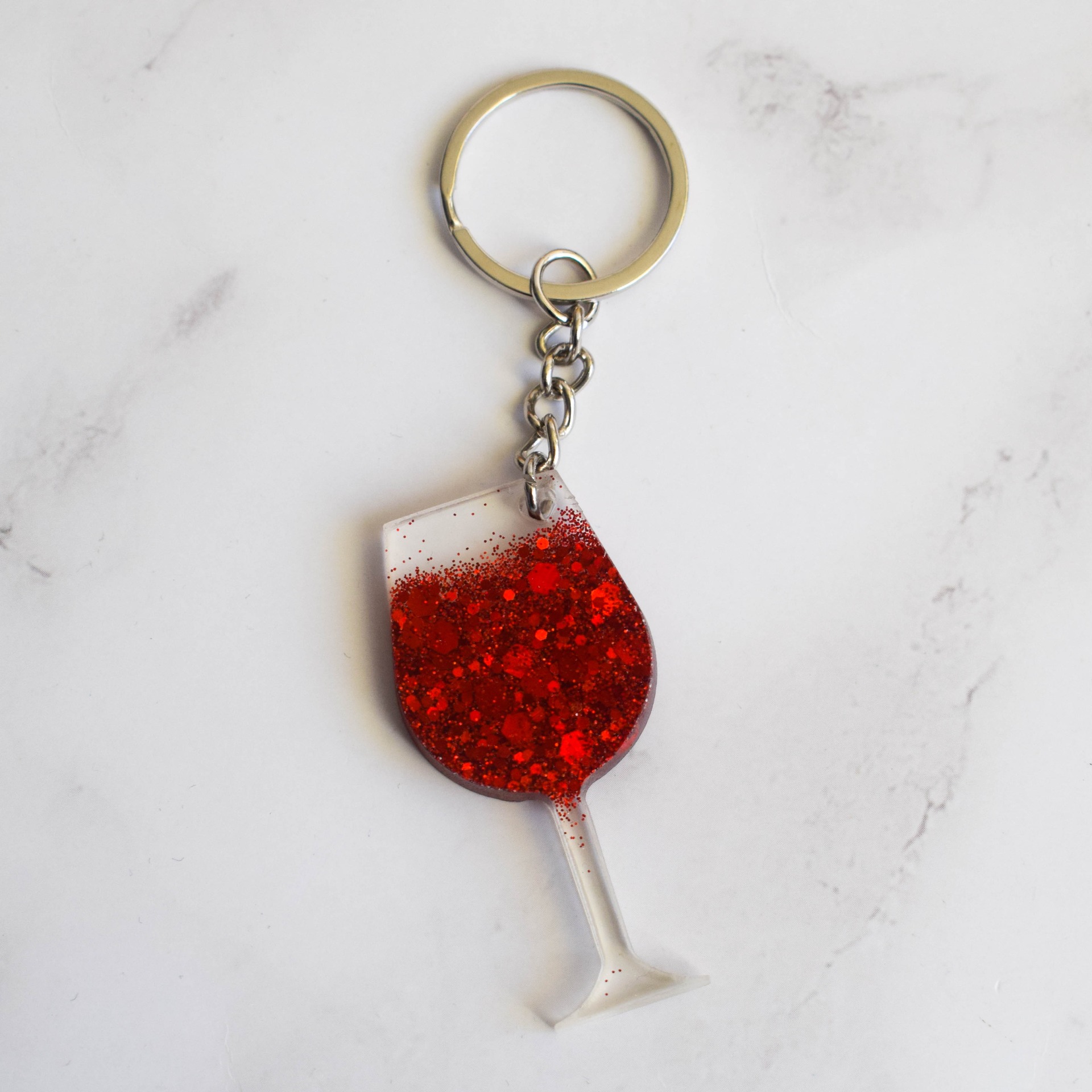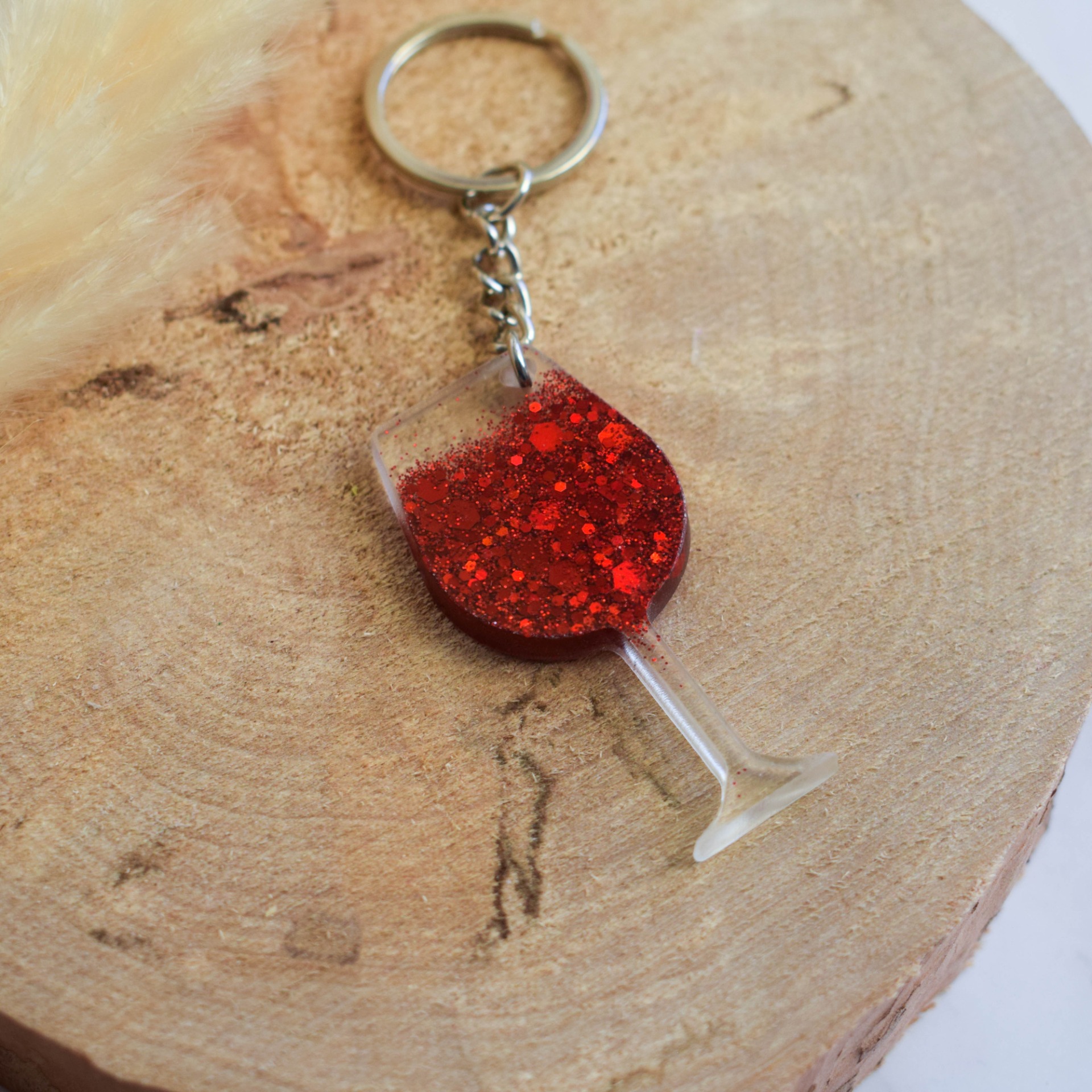 Stylová klíčenka ve tvaru skleničky, ručně vyrobená z epoxidové pryskyřice v designu s červenými glitry, které připomínají nalité červené víno.